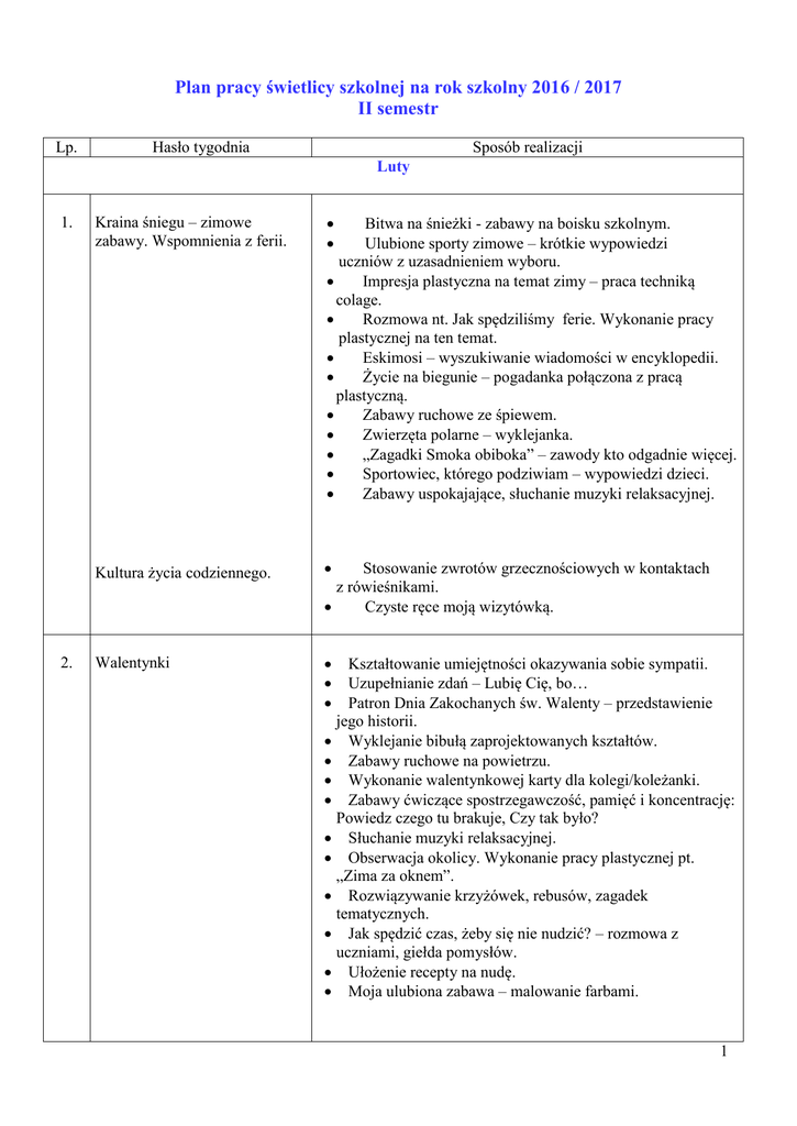 Plan pracy świetlicy szkolnej na rok szkolny 2016/2017