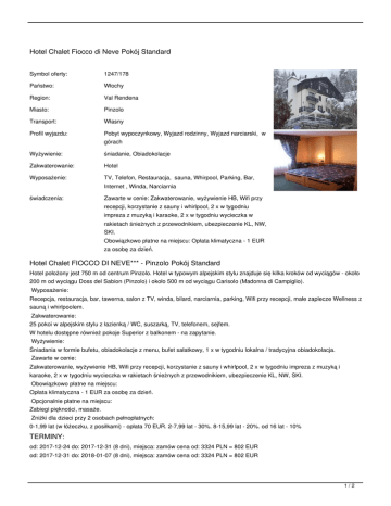 Hotel Chalet Fiocco di Neve Pokój Standard Symbol oferty: 1247/178 Państwo: Włochy Region: Val Rendena Miasto: Pinzolo Transport: Własny Profil wyjazdu: Pobyt wypoczynkowy, Wyjazd rodzinny, Wyjazd narciarski, w Wyżywienie: śniadanie, Obiadokolacje Zakwaterowanie: Hotel Wyposażenie: TV, Telefon, Restauracja, sauna, Whirpool, Parking, Bar, świadczenia: Zawarte w cenie: Zakwaterowanie, wyżywienie HB, Wifi przy górach Internet , Winda, Narciarnia recepcji, korzystanie z sauny i whirlpool, 2 x w tygodniu impreza z muzyką i karaoke, 2 x w tygodniu wycieczka w rakietach śnieżnych z przewodnikiem, ubezpieczenie KL, NW, SKI. Obowiązkowo płatne na miejscu: Opłata klimatyczna - 1 EUR za osobę za dzień. Hotel Chalet FIOCCO DI NEVE*** - Pinzolo Pokój Standard Hotel położony jest 750 m od centrum Pinzolo. Hotel w typowym alpejskim stylu znajduje się kilka kroków od wyciągów - około 200 m od wyciągu Doss del Sabion (Pinzolo) i około 500 m od wyciągu Carisolo (Madonna di Campiglio). Wyposażenie: Recepcja, restauracja, bar, tawerna, salon z TV, winda, bilard, narciarnia, parking, Wifi przy recepcji, małe zaplecze Wellness z sauną i whirlpoolem. Zakwaterowanie: 25 pokoi w alpejskim stylu z łazienką / WC, suszarką, TV, telefonem, sejfem. W hotelu dostępne również pokoje Superior z balkonem - na zapytanie. Wyżywienie: Śniadania w formie bufetu, obiadokolacje z menu, bufet sałatkowy, 1 x w tygodniu lokalna / tradycyjna obiadokolacja. Zawarte w cenie: Zakwaterowanie, wyżywienie HB, Wifi przy recepcji, korzystanie z sauny i whirlpool, 2 x w tygodniu impreza z muzyką i karaoke, 2 x w tygodniu wycieczka w rakietach śnieżnych z przewodnikiem, ubezpieczenie KL, NW, SKI. Obowiązkowo płatne na miejscu: Opłata klimatyczna - 1 EUR za osobę za dzień. Opcjonalnie płatne na miejscu: Zabiegi piękności, masaże. Zniżki dla dzieci przy 2 osobach pełnopłatnych: 0-1,99 lat (w łóżeczku, z posiłkami) - opłata 70 EUR. 2-7,99 lat - 30%. 8-15,99 lat - 20%. od 16 lat - 10% TERMINY: od: 2017-12-24 do: 2017-12-31 (8 dni), miejsca: zamów cena od: 3324 PLN = 802 EUR od: 2017-12-31 do: 2018-01-07 (8 dni), miejsca: zamów cena od: 3324 PLN = 802 EUR 1/2 od: 2018-01-07 do: 2018-01-14 (8 dni), miejsca: zamów cena od: 2126 PLN = 513 EUR od: 2018-01-14 do: 2018-01-21 (8 dni), miejsca: zamów cena od: 1915 PLN = 462 EUR od: 2018-01-21 do: 2018-01-28 (8 dni), miejsca: zamów cena od: 1915 PLN = 462 EUR od: 2018-01-28 do: 2018-02-04 (8 dni), miejsca: zamów cena od: 1915 PLN = 462 EUR od: 2018-02-04 do: 2018-02-11 (8 dni), miejsca: zamów cena od: 2197 PLN = 530 EUR od: 2018-02-11 do: 2018-02-18 (8 dni), miejsca: zamów cena od: 2197 PLN = 530 EUR od: 2018-02-18 do: 2018-02-25 (8 dni), miejsca: zamów cena od: 2197 PLN = 530 EUR od: 2018-02-25 do: 2018-03-04 (8 dni), miejsca: zamów cena od: 2197 PLN = 530 EUR od: 2018-03-04 do: 2018-03-11 (8 dni), miejsca: zamów cena od: 2197 PLN = 530 EUR od: 2018-03-11 do: 2018-03-18 (8 dni), miejsca: zamów cena od: 1915 PLN = 462 EUR od: 2018-03-18 do: 2018-03-25 (8 dni), miejsca: zamów cena od: 1915 PLN = 462 EUR od: 2018-03-25 do: 2018-04-01 (8 dni), miejsca: zamów cena od: 1915 PLN = 462 EUR od: 2018-04-01 do: 2018-04-08 (8 dni), miejsca: zamów cena od: 1915 PLN = 462 EUR od: 2018-04-08 do: 2018-04-15 (8 dni), miejsca: zamów cena od: 1915 PLN = 462 EUR od: 2018-04-15 do: 2018-04-22 (8 dni), miejsca: zamów cena od: 1915 PLN = 462 EUR CENNIK: Długość pobytu: 8 dni 8 dni 8 dni 8 dni Grupa cenowa: A D C B Ubezpieczenie (obligatoryjne) (*) Ubezpieczenie KL, NW, SKI 14 (*) Turystyczny Fundusz Gwarancyjny 2.5 14 14 14 2.5 2.5 2.5 (*) Pokój 2 osobowy standardowo dla osób: 3 minimalnie: 2 (-) (-) (-) (-) 413 399 630 358 516 499 788 448 70 70 70 70 361 349 552 314 464 449 709 403 Pobyt w obiekcie (do wyboru) Rodzaj osoby (do wyboru) Dziecko 8-15 (*) Osoba dorosła Dziecko 0-1 Dziecko 2-7 3 osoba na dostawce Waluta: EUR Aktualne ceny z systemu S.A.R.T. (-) - cena usługi, podatku kalkulowana przy osobie lub gratis (*) - kwota wliczona w cenę standardową 2/2