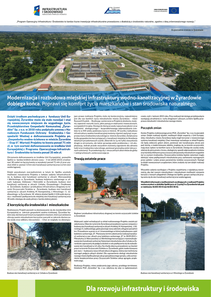 „Program Operacyjny Infrastruktura i Środowisko to bardzo liczne inwestycje infrastrukturalne prowadzone z dbałością o środowisko naturalne, zgodne z ideą zrównoważonego rozwoju.” Oczyszczalnia ścieków w Żyrardowie Modernizacja i rozbudowa miejskiej infrastruktury wodno-kanalizacyjnej w Żyrardowie dobiega końca. Poprawi się komfort życia mieszkańców i stan środowiska naturalnego. Dzięki środkom pochodzącym z funduszy Unii Europejskiej, Żyrardów może się stale rozwijać i stać się nowoczesnym miejscem do wygodnego życia. Przedsiębiorstwo Gospodarki Komunalnej „Żyrardów” Sp. z o.o. w 2010 roku podpisało umowę z Narodowym Funduszem Ochrony Środowiska i Gospodarki Wodnej o dofinansowanie Projektu pn. „Gospodarka wodno-ściekowa w mieście Żyrardów – Etap II”. Wartość Projektu to kwota ponad 71 mln zł, w tym wartość dofinansowania ze środków Unii Europejskiej z Programu Operacyjnego Infrastruktura i Środowisko to kwota ponad 35 mln zł. jące prawo realizacja Projektu stała się koniecznością, najważniejszy jest dla nas komfort życia mieszkańców miasta Żyrardowa – mówi Ryszard Chudzik. – Realizując zamierzone w Projekcie działania, możemy zapewnić warunki życia, jakie panują w większości nowoczesnych, europejskich krajów. Dostęp do bieżącej wody najwyższej jakości oraz możliwość ekologicznego i bezproblemowego odprowadzania ścieków to w XXI wieku podstawa życia w mieście. W wyniku rozbudowy infrastruktury wodno-kanalizacyjnej możemy również wpłynąć na poprawę stanu środowiska naturalnego w mieście Żyrardów. Zwiększona liczba gospodarstw korzystających z kanalizacji miejskiej to likwidacja lokalnych przydomowych szamb. Zbiorniki te są nie tylko stosunkowo drogie w utrzymaniu, ale także sprawiają wiele problemów z ich eksploatacją. Jednak przede wszystkim stanowią zagrożenie dla zdrowia ludzi oraz środowiska naturalnego, ponieważ gromadzą wiele toksycznych substancji. Te przedostają się z nieszczelnych zbiorników do gleby i wód gruntowych, zanieczyszczając je. Otrzymanie dofinansowania ze środków Unii Europejskiej pozwoliło Spółce w bardzo krótkim okresie czasu – 5 lat (2010-2015) zrealizować 30 zadań na łączną kwotę w wysokości ponad 71 mln zł oraz uzyskać efekt w postaci 13 km sieci kanalizacji sanitarnej oraz 2,2 km sieci wodociągowej. Trwają ostatnie prace czasie, czyli z końcem 2015 roku. Przy realizacji tak dużego przedsięwzięcia występują utrudnienia w ruchu drogowym i pieszym, za które Spółka przeprasza mieszkanki i mieszkańców naszego miasta. Początek zmian Koniec Projektu realizowanego przez PGK „Żyrardów” Sp. z o.o. to początek zmian. Dzięki realizacji działań, możliwych dzięki wsparciu z Unii Europejskiej, mieszkańcy miasta Żyrardowa będą mogli korzystać z nowoczesnego systemu kanalizacji miejskiej. Choć inwestycje wchodzące w skład Projektu nie będą widoczne gołym okiem, ponieważ sieć kanalizacyjna ukryta jest pod ziemią, a modernizowane obiekty znajdują się na terenie oczyszczalni, mają duży wpływ na komfort życia w Żyrardowie. Dostęp do czystej wody, zdatnej do picia prosto z kranu, ekologiczny sposób odprowadzania ścieków oraz bardziej efektywna praca oczyszczalni pozwolą mieszkańcom wygodnie żyć w czystym środowisku. Oczyszczalnia ścieków będzie natomiast mogła obsłużyć nowo podłączonych mieszkańców przy zachowaniu wymaganych przez polskie i unijne prawo parametrów ścieków oczyszczonych. Nastąpi to dzięki nowoczesnym urządzeniom, które znalazły się tam dzięki realizacji Projektu. Wszystkie zadania wynikające z Projektu wypełniamy z największą starannością, aby dać naszym mieszkankom i mieszkańcom możliwość czerpania korzyści z nowych udogodnień. Dlatego też Spółka gorąco zachęca do przyłączania się do sieci kanalizacji sanitarnej oraz wodociągowej. Dzięki pozyskanym oszczędnościom w lutym br. Spółka uzyskała możliwość rozszerzenia Projektu o kolejne zadania infrastrukturalne, tj. budowa sieci kanalizacji sanitarnej w ulicach: Warszawskiej i Werbickiego w Żyrardowie, budowa kolektora sanitarnego w ulicach: Łąkowej, Glebowej i Nietrzebki w Żyrardowie, budowa sieci kanalizacji sanitarnej w ulicach: Cehaka, Ossowskiego i Środkowej w Żyrardowie, budowa i przebudowa infrastruktury drogowej na terenie Oczyszczalni Ścieków w Żyrardowie, budowa sieci kanalizacji sanitarnej w ulicach: Krótkiej, M. Konopnickiej, J. Mireckiego i S. Jodłowskiego w Żyrardowie. W efekcie działań Spółki 2 418 osób skorzysta z możliwości podłączenia do miejskiej sieci kanalizacji sanitarnej oraz 40 osób z dostępu do wody pitnej o bardzo dobrej jakości. Wszelkich informacji o możliwościach wynikających z realizacji Projektu można uzyskać w siedzibie Spółki przy ul. Czystej 5 w Żyrardowie lub pod nr telefonów 46 855 40 41 lub 46 855 40 42. Z korzyścią dla środowiska i mieszkańców Realizowany Projekt pozwoli na dostosowanie się do standardów Unii Europejskiej w zakresie gospodarki wodno-ściekowej. Żyrardów będzie więc dorównywał innym europejskim miastom, które już od dawna oferują swoim mieszkańcom korzystne warunki w zakresie dostarczania wody oraz odbioru nieczystości. – Choć ze względu na obowiązu- Budowa i przebudowa infrastruktury drogowej na terenie oczyszczalni ścieków w Żyrardowie Większość zadań wchodzących w skład realizowanego Projektu została już zakończona. Obecnie na terenie Żyrardowa prowadzone są prace związane z budową sieci kanalizacji sanitarnej w ulicach: Krótkiej, M. Konopnickiej, J. Mireckiego i S. Jodłowskiego, gdzie powstaje nowy odcinek o długości ponad 0,5 km. Prowadzone są prace w ul. Limanowskiego w której wybudowano część kolektora sanitarnego „R”. Planowany termin zakończenia realizacji kanalizacji sanitarnej w ww. ulicach oraz kolektora sanitarnego „R” 