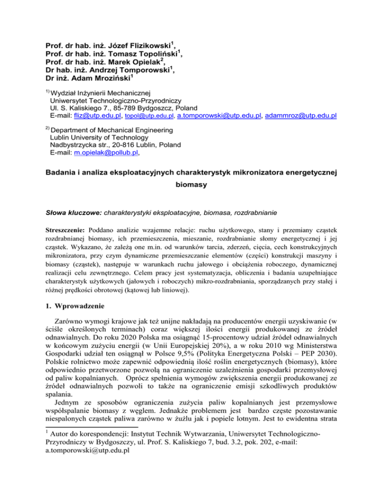 Prof. dr hab. inż. Józef Flizikowski1, Prof. dr hab. inż. Tomasz Topoliński1, Prof. dr hab. inż. Marek Opielak2, Dr hab. inż. Andrzej Tomporowski1, Dr inż. Adam Mroziński1 1) Wydział Inżynierii Mechanicznej Uniwersytet Technologiczno-Przyrodniczy Ul. S. Kaliskiego 7., 85-789 Bydgoszcz, Poland E-mail: [email protected], [email protected], [email protected], [email protected] 2) Department of Mechanical Engineering Lublin University of Technology Nadbystrzycka str., 20-816 Lublin, Poland E-mail: [email protected], Badania i analiza eksploatacyjnych charakterystyk mikronizatora energetycznej biomasy Słowa kluczowe: charakterystyki eksploatacyjne, biomasa, rozdrabnianie Streszczenie: Poddano analizie wzajemne relacje: ruchu użytkowego, stany i przemiany cząstek rozdrabnianej biomasy, ich przemieszczenia, mieszanie, rozdrabnianie słomy energetycznej i jej cząstek. Wykazano, że zależą one m.in. od warunków tarcia, zderzeń, cięcia, cech konstrukcyjnych mikronizatora, przy czym dynamiczne przemieszczanie elementów (części) konstrukcji maszyny i biomasy (cząstek), następuje w warunkach ruchu jałowego i obciążenia roboczego, dynamicznej realizacji celu zewnętrznego. Celem pracy jest systematyzacja, obliczenia i badania uzupełniające charakterystyk użytkowych (jałowych i roboczych) mikro-rozdrabniania, sporządzanych przy stałej i różnej prędkości obrotowej (kątowej lub liniowej). 1. Wprowadzenie Zarówno wymogi krajowe jak też unijne nakładają na producentów energii uzyskiwanie (w ściśle określonych terminach) coraz większej ilości energii produkowanej ze źródeł odnawialnych. Do roku 2020 Polska ma osiągnąć 15-procentowy udział źródeł odnawialnych w końcowym zużyciu energii (w Unii Europejskiej 20%), a w roku 2010 wg Ministerstwa Gospodarki udział ten osiągnął w Polsce 9,5% (Polityka Energetyczna Polski – PEP 2030). Polskie rolnictwo może zapewnić odpowiednią ilość roślin energetycznych (biomasy), które odpowiednio przetworzone pozwolą na ograniczenie uzależnienia gospodarki przemysłowej od paliw kopalnianych. Oprócz spełnienia wymogów zwiększenia energii produkowanej ze źródeł odnawialnych pozwoli to także na ograniczenie emisji szkodliwych produktów spalania. Jednym ze sposobów ograniczenia zużycia paliw kopalnianych jest przemysłowe współspalanie biomasy z węglem. Jednakże problemem jest bardzo częste pozostawanie niespalonych cząstek paliwa zarówno w żużlu jak i popiele lotnym. Jest to ewidentna strata 1 Autor do korespondencji: Instytut Technik Wytwarzania, Uniwersytet TechnologicznoPrzyrodniczy w Bydgoszczy, ul. Prof. S. Kaliskiego 7, bud. 3.2, pok. 202, e-mail: [email protected] energetyczna, gdyż paliwo nie oddaje całej energii, a jej niewykorzystana część jest nieodwracalnie tracona [3, 8, 21, 31]. Badania prowadzone w elektrociepłowniach spalających biomasę wykazują na znaczny wpływ wielkości frakcji wymiarowych biomasy, na końcowy udział węgla w popiele [3, 5, 6]. By zapobiec temu zjawisku konieczne jest zapewnienie powtarzalnego procesu rozdrabniania biomasy na jak najdrobniejsze frakcje stałe. Dotychczasowe doświadczenia w krajowych elektrociepłowniach wskazują jednoznacznie na wyższe nakłady, koszty procesu, uwarunkowane przez: spadek sprawności energetycznej kotłów poddanych procesowi modernizacji do współspalania biomasy, na skutek zmian sposobu wymiany ciepła w kotle, a szczególnie rosnącej ilości niedopału, wzrost zapotrzebowania na energię elektryczną przez zainstalowane urządzenia do przygotowania i spalania biomasy (układy transportu, mielenie precyzyjne itp.), znaczny wzrost szlakowania komór paleniskowych pogarszających dyspozycyjność kotłów, szybką korozję wysokotemperaturową powodowaną przez zawartość chloru w biomasie (głównie słoma), niestabilność ceny biomasy na wolnym rynku, powodowaną dużą konkurencją na rynku i dużym rozproszeniem dostawców surowca [14]. Do korzyści, zysków współspalania niewątpliwie należą: niższa (bilansowe zero) emisyjność szkodliwych związków: SO2, NOx, CO2, która pozytywnie wpływa na stan środowiska naturalnego, jak i na cenę jednostki wytworzonego ciepła (ETS), elastyczność procesu – podczas niedoboru biomasy kocioł może pracować na samym węglu, proces współspalania jest stabilizowany przez spalanie węgla [13, 15, 19]. Praca ma na celu opis i analizę warunków technicznych przygotowania wysokiej jakości produktu rozdrabniania (mikronizacji) biomasy przy zastosowaniu mikronizatora a także analizę jego charakterystyk eksploatacyjnych, co umożliwi opracowanie nowej techniki rozdrabniania wysoko efektywnej energetycznie biomasy przez odpowiednie jej przygotowanie do spalania z węglem. Dla osiągnięcia celu przeprowadzono postępowanie analityczne obejmujące: istotę współspalania, dostępność biomasy dla celów energetycznych, pro optymalizacyjne koncypowanie nowej techniki mikro-rozdrabniania. 2. Istota techniki współspalania Istota współspalania polega na jednoczesnym spalaniu węgla i biomasy w komorze kotła i oddawaniu ciepła do instalacji. Kotły (np. OP-230) projektowane były dla spalania wyłącznie węgla kamiennego, stąd po procesie dostosowania do współspalania biomasy należy liczyć się z pewnymi ograniczeniami co do wydajności cieplnej kotła spowodowanej dostarczaniem paliwa o mniejszej wartości energetycznej [8, 11, 12, 15, 19, 22, 23]. Oprócz wartości opałowej biomasy niezwykle istotna dla procesu spalania jest także jej wilgotność [1]. Sucha biomasa spala się bardzo dobrze powoduje stabilizację płomienia, natomiast wilgotna przesuwa położenie jądra płomienia ku górze komory paleniskowej co jest bardzo niepożądane ze względu na emisyjność związków NOx, oraz pogorszenie wymiany cieplnej w kotle [8]. Dla uzyskania maksymalnej efektywności ekonomicznej jest konieczne produkowanie, w procesie spalania, popioł