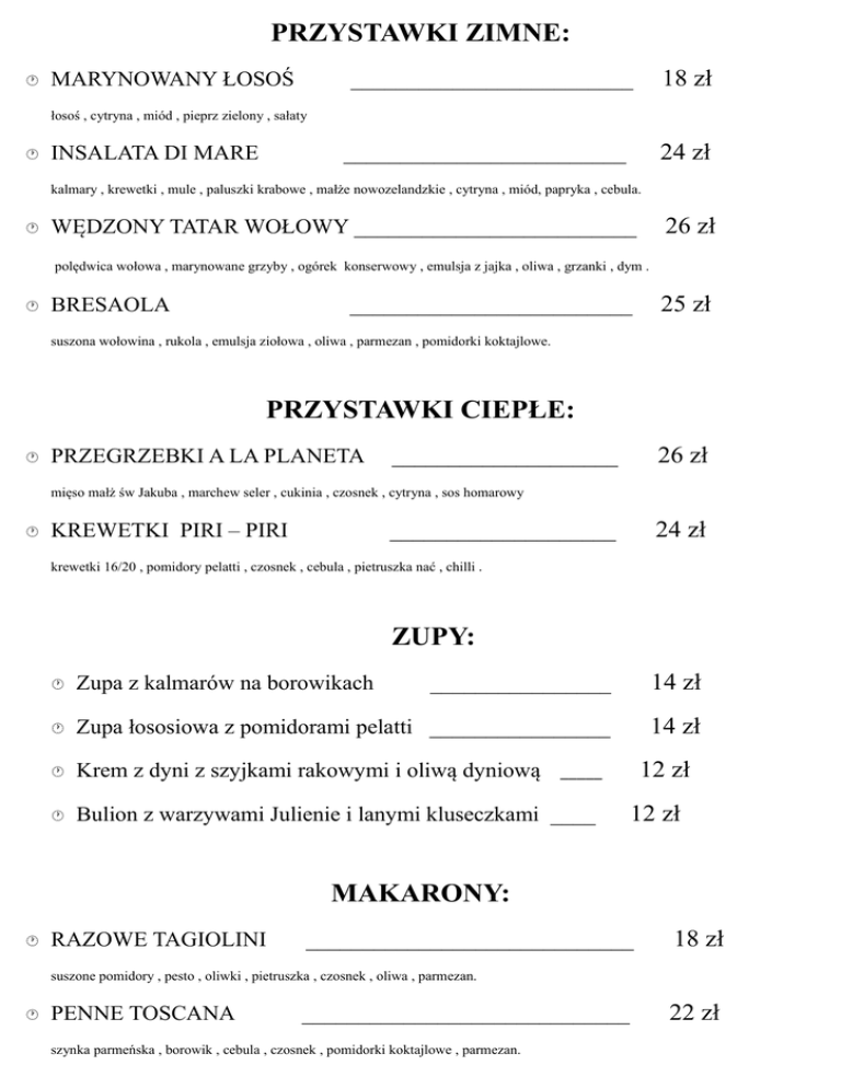 PRZYSTAWKI ZIMNE: MARYNOWANY ŁOSOŚ 18 zł _________________________ łosoś , cytryna , miód , pieprz zielony , sałaty INSALATA DI MARE 24 zł _________________________ kalmary , krewetki , mule , paluszki krabowe , małże nowozelandzkie , cytryna , miód, papryka , cebula. 26 zł WĘDZONY TATAR WOŁOWY _________________________ polędwica wołowa , marynowane grzyby , ogórek konserwowy , emulsja z jajka , oliwa , grzanki , dym . BRESAOLA _________________________ 25 zł suszona wołowina , rukola , emulsja ziołowa , oliwa , parmezan , pomidorki koktajlowe. PRZYSTAWKI CIEPŁE: PRZEGRZEBKI A LA PLANETA 26 zł ____________________ mięso małż św Jakuba , marchew seler , cukinia , czosnek , cytryna , sos homarowy KREWETKI PIRI – PIRI 24 zł ____________________ krewetki 16/20 , pomidory pelatti , czosnek , cebula , pietruszka nać , chilli . ZUPY: Zupa z kalmarów na borowikach ________________ 14 zł Zupa łososiowa z pomidorami pelatti ________________ 14 zł Krem z dyni z szyjkami rakowymi i oliwą dyniową Bulion z warzywami Julienie i lanymi kluseczkami ____ 12 zł _____ 12 zł MAKARONY: RAZOWE TAGIOLINI _____________________________ 18 zł suszone pomidory , pesto , oliwki , pietruszka , czosnek , oliwa , parmezan. PENNE TOSCANA _____________________________ szynka parmeńska , borowik , cebula , czosnek , pomidorki koktajlowe , parmezan. 22 zł 25 zł LINGUINE AGLIO OLIO _____________________________ krewetki , mule , vongole , czosnek , oliwa , pietruszka , chilli , bulion. CARBONARA 20 zł _____________________________ makaron linguine , boczek , cebula , czosnek , śmietana , żółtko , parmezan . Nowe Menu Restauracji Planeta wprowadzone w dniu 14.10.2014 ZYCZYMY SMACZNEGO i oczekujemy opinii……. RYBY: SANDACZ 32 zł ___________________ sos krewetkowy , kasza pęczak , kurki , tagiolini z blanszowanej marchewki DORSZ Z GRILLA W BULIONIE 30 zł ___________________ marchew , seler , cukinia , pieczarki , bulion szafranowy , molekularna pianka z czarnej porzeczki . ŁOSOŚ W PERGAMINIE 36 zł ___________________ ziemniaki konfit , pieczarki , cebula , papryka , sos Bernasie . PSTRĄG Z RUSZTU ___________________ 32 zł sos borowikowy, ziemniaki z truflą, brokuł. MIĘSA: GICZ CIELĘCA _____________ 56 zł _____________ 42 zł puree z selera , blanszowana marchew , sos tymiankowy. GRILLATA comber jagnięcy , polędwiczka wieprzowa , indyk , polędwica wołowa , sałaty , sos jogurtowo ziołowy SCHAB Z KOŚCIĄ NA PEPERONACIE ______________ 32 zł ______________ 52 zł ______________ 42 zł cukinia , papryka , cebula , pieczarki, tymianek , sos Koniakowy. STEK WOŁOWY polędwica wołowa, grzyby , sos pieprzowy , cukinia , bakłażan KACZKA . czerwona kapusta , żurawina , pomarańcz , pieczony ziemniak , sos grand marnier GĘŚ . ______________ 42 zł sos z węgierek , szare kluski , warzywa blanszowane DESERY: KREM BRULE __________________________ 14 zł _________________________ 16 zł Z CHAŁWĄ I CUKREM TRZCINOWYM PIECZONE LODY NA SOSIE WANILIOWO TRUSKAWKOWYM SERNIK CYNAMONOWY _________________________ 16 zł Z GRUSZKĄ NA PUREE Z PORZECZKI DESKA SERÓW _________________________ 36 zł Z SUSZONYMI OWOCAMI I KONFITURĄ MANU RESTAURACJI PLANETA AUTORSTWA WIESŁAW OGRODOWSKI SZEF KUCHNI