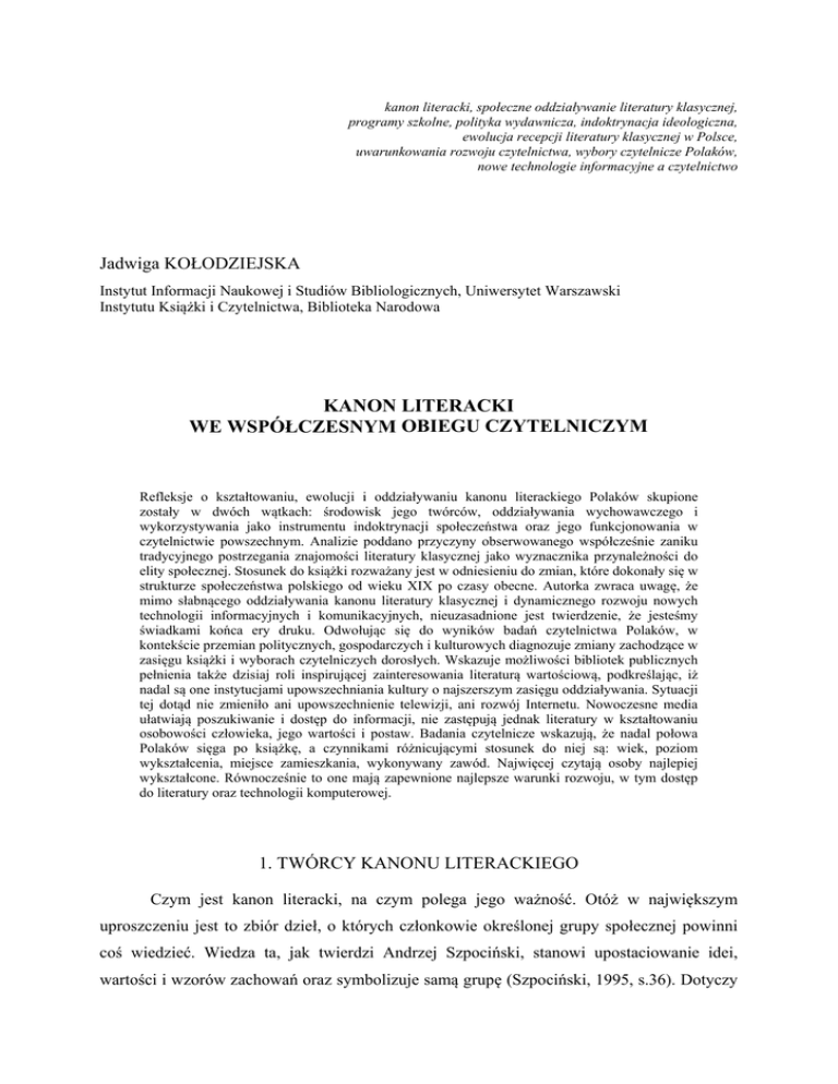 kanon literacki, społeczne oddziaływanie literatury klasycznej, programy szkolne, polityka wydawnicza, indoktrynacja ideologiczna, ewolucja recepcji literatury klasycznej w Polsce, uwarunkowania rozwoju czytelnictwa, wybory czytelnicze Polaków, nowe technologie informacyjne a czytelnictwo Jadwiga KOŁODZIEJSKA Instytut Informacji Naukowej i Studiów Bibliologicznych, Uniwersytet Warszawski Instytutu Książki i Czytelnictwa, Biblioteka Narodowa KANON LITERACKI WE WSPÓŁCZESNYM OBIEGU CZYTELNICZYM Refleksje o kształtowaniu, ewolucji i oddziaływaniu kanonu literackiego Polaków skupione zostały w dwóch wątkach: środowisk jego twórców, oddziaływania wychowawczego i wykorzystywania jako instrumentu indoktrynacji społeczeństwa oraz jego funkcjonowania w czytelnictwie powszechnym. Analizie poddano przyczyny obserwowanego współcześnie zaniku tradycyjnego postrzegania znajomości literatury klasycznej jako wyznacznika przynależności do elity społecznej. Stosunek do książki rozważany jest w odniesieniu do zmian, które dokonały się w strukturze społeczeństwa polskiego od wieku XIX po czasy obecne. Autorka zwraca uwagę, że mimo słabnącego oddziaływania kanonu literatury klasycznej i dynamicznego rozwoju nowych technologii informacyjnych i komunikacyjnych, nieuzasadnione jest twierdzenie, że jesteśmy świadkami końca ery druku. Odwołując się do wyników badań czytelnictwa Polaków, w kontekście przemian politycznych, gospodarczych i kulturowych diagnozuje zmiany zachodzące w zasięgu książki i wyborach czytelniczych dorosłych. Wskazuje możliwości bibliotek publicznych pełnienia także dzisiaj roli inspirującej zainteresowania literaturą wartościową, podkreślając, iż nadal są one instytucjami upowszechniania kultury o najszerszym zasięgu oddziaływania. Sytuacji tej dotąd nie zmieniło ani upowszechnienie telewizji, ani rozwój Internetu. Nowoczesne media ułatwiają poszukiwanie i dostęp do informacji, nie zastępują jednak literatury w kształtowaniu osobowości człowieka, jego wartości i postaw. Badania czytelnicze wskazują, że nadal połowa Polaków sięga po książkę, a czynnikami różnicującymi stosunek do niej są: wiek, poziom wykształcenia, miejsce zamieszkania, wykonywany zawód. Najwięcej czytają osoby najlepiej wykształcone. Równocześnie to one mają zapewnione najlepsze warunki rozwoju, w tym dostęp do literatury oraz technologii komputerowej. 1. TWÓRCY KANONU LITERACKIEGO Czym jest kanon literacki, na czym polega jego ważność. Otóż w największym uproszczeniu jest to zbiór dzieł, o których członkowie określonej grupy społecznej powinni coś wiedzieć. Wiedza ta, jak twierdzi Andrzej Szpociński, stanowi upostaciowanie idei, wartości i wzorów zachowań oraz symbolizuje samą grupę (Szpociński, 1995, s.36). Dotyczy to nie tylko symboliki związanej z kulturą narodową, ale i kanonu kulturowego warstw lepiej wyedukowanych, przynajmniej na poziomie średniej szkoły ogólnokształcącej. Do tego kanonu w Europie należą pewne dzieła i powiedzenia Szekspira (to be or not to be), Moliera (daj mu dużą szklankę czystej wody) itp. Do polskiego kanonu przykładowo należą pewne dzieła i powiedzenia Wyspiańskiego (Co tam, panie w polityce, Chińczycy trzymają mocno), Słowackiego, Norwida, a nade wszystko Mickiewicza. Powiedzenie puszka z Pandorą, a nie puszka Pandory, zdradza niechybnie brak wykształcenia ogólnego, brak wiedzy o kulturze starożytnych Greków. Jeszcze kilkanaście lat temu taki lapsus był szeroko komentowany, dziś przeszedłby prawie niezauważony. W sześćdziesięcioosobowej grupie studentów kierunku humanistycznego nie znalazł się ani jeden, który określiłby na czym polegał błąd. Ale ósma klasa szkoły podstawowej zareagowała śmiechem, gdy o tej nieszczęsnej puszce usłyszała. Bywa więc rozmaicie, choć wiedza o literaturze starożytnej jest prawie nieobecna w czytelnictwie powszechnym. Jeszcze w okresie międzywojennym ktoś należący do „towarzystwa” nie mógł być ignorantem na temat twórczości Żeromskiego czy Balzaka. I to niezależnie od tego czy był dziennikarzem, czy inżynierem. Znajomość literatury była przepustką na „salony”. Współcześnie znajomość literatury przestała być wyróżnikiem i dowodem przynależności do grupy elitarnej. Wiedza o literaturze klasycznej „przerabianej” w szkole jest rzadko odnawiana, a jeżeli już to za pośrednictwem ekranizacji filmowych. Nieznajomość literatury nikogo nie kompromituje, ponieważ jak twierdzi Grażyna Straus, przestała ona być prestiżowym wyróżnikiem, chociaż dla wielu książka pozostała wartością (Straus, 2001). Jest to między innymi zasługa szkoły, która umożliwiała rozumienie i przyswajanie kanonu literackiego. Można wątpić w trwałość jej wysiłków socjalizacyjnych, ale poczucie, że literatura klasyczna jest czymś ważnym jest dosyć powszechne. W powszechnym odczuciu do literatury klasycznej zalicza się książki „szkolne”. Do lektur obowiązkowych nie wraca się, jedynie w jednostkowych przypadkach. Student pierwszego roku kierunku humanistycznego przeczytał powtórnie Przedwiośnie Żeromskiego i jak stwierdził, lektura ta pomogła mu zrozumieć to, co się współcześnie w Polsce dzieje. Jego koleżanki i koledzy nie oglądali filmu, bowiem zniechęciły ich recenzje eksponujące wątek miłosny. Stosunek do książki jest niewątpliwie rezultatem zmian, jakie dokonały się w strukturze polskiego społeczeństwa. Przez cały wiek XIX dzieła literackie oceniała inteligencja: nauczyciele, działacze oświatowi i społeczni, krytycy literaccy współpracujący z różnymi czasopismami, księża katoliccy i protestanccy. Opinie o książkach były bardzo często podporządkowane celom wychowawczym na zasadzie przekonania o pożytkach, jakie mogą osiągnąć czytelnicy z warstw chłopskich, robotniczych oraz rzemieślniczych. Wysoki