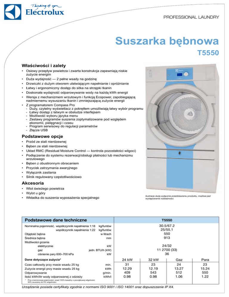 PROFESSIONAL LAUNDRY Suszarka bębnowa T5550 Właściwości i zalety • Osiowy przepływ powietrza i zwarta konstrukcja zapewniają niskie zużycie energiin • Duża wydajność — 2 pełne wsady na godzinę • Drzwiczki z dużym otworem ułatwiającym napełnianie i opróżnianie • Łatwy i ergonomiczny dostęp do sitka na strzępki tkanin • Doskonała wydajność odparowywanie wody na każdą kWh energii • Wersja z mechanizmem wrzutowym i funkcją Ecopower, zapobiegającą nadmiernemu wysuszaniu tkanin i zmniejszającą zużycie energii • Z programatorem Compass Pro - Duży, czytelny wyświetlacz z pokrętłem umożliwiają łatwy wybór programu - Łatwy dostęp z łatwym w obsłudze interfejsem - Możliwość wyboru języka menu - Zestawy programów suszenia zoptymalizowane pod względem ekonomii, pielęgnacji i czasu - Program serwisowy do regulacji parametrów - Złącze USB Podstawowe opcje • • • • • • • • Przód ze stali nierdzewnej Bęben ze stali nierdzewnej Układ RMC (Residual Moisture Control — kontrola pozostałości wilgoci) Podłączenie do systemu rezerwacji/obsługi płatności lub mechanizmu wrzutowego Bęben z obustronnym obracaniem Przycisk zatrzymania awaryjnego Wyłącznik zasilania Silnik regulowany częstotliwościowo Akcesoria • Wlot świeżego powietrza • Wylot u góry • Wkładka do suszenia wyposażenia specjalnego Ilustracje służą wyłącznie przedstawieniu produktu, możliwe jest występowanie rozbieżności. Podstawowe dane techniczne T5550 Nominalna pojemność, współczynnik napełnienia 1:18 kg/funtów współczynnik napełnienia 1:22 kg/funtów Objętość bębna w litrach Średnica bębna mm Możliwości grzania elektrycznie kW gaz jedn. BTU/h (kW) ciśnienie pary 600–700 kPa kW 30.5/67.2 25/55.1 550 913 Dane dotyczące zużycia* Czas całkowity przy masie wsadu 25 kg Zużycie energii przy masie wsadu 25 kg Odparowywanie Ilość kWh/litr wody odparowanej z odzieży min. kWh g/min. kWh/l 24/32 11 2700 (33) 36 24 kW 31 12.29 409 0.98 32 kW 23 12.19 543 0.98 * Przy znamionowej pojemności, wsad 100% bawełny o początkowej wilgotności 50% osuszany do 0% wilgotności. Urządzenie posiada certyfikaty zgodnie z normami ISO 9001 i ISO 14001 oraz dopuszczenie IP X4. Gaz 24 13.27 512 1.06 Para 23 15.24 550 1.22 Przyłącza elektryczne Grzanie Napięcie T5550 El. 380-415V 3/3N AC 50/60 Hz 380-415V 3/3N AC 50/60 Hz 440-480V 3AC 60 Hz 440-480V 3AC 60 Hz 230-240V 3AC 50/60 Hz 230-240V 3AC 50/60 Hz 230-240V 1AC 50/60 Hz kW(A) kW(A) kW(A) kW(A) kW(A) kW(A) kW(A) 26.5 (50) 34.6 (50) 26.7 (50) 34.5 (50) 26.4 (80) 34.4 (100) 26.0 (125) Gaz/ parowe 380-415V 3/3N AC 50/60 Hz 440-480V 3AC 60 Hz 230-240V 3AC 50/60 Hz 230-240V 1AC 50/60 Hz kW(A) kW(A) kW(A) kW(A) 2.5 (10) 2.7 (10) 2.4 (10) 2.2 (10) A 1 C Przyłącza pary, gazu i powietrza Para ISO 7/1-R Ciśnienie pary kPa Zużycie pary kg/h Skropliny ISO 7/1-R Gaz NG/PG ISO 7/1-R Ciśnienie gazu Gaz ziemny Pa mbar Propan Pa mbar Wylot powietrza ø mm Maksymalny przepływ powietrza: Elektryczne 50 Hz / 60 Hz m3/h 3 Gazowe 50 Hz / 60 Hz m /h Parowe 50 Hz / 60 Hz m3/h Maksymalne, statyczne ciśnienie zwrotne: Elektryczne 50 Hz / 60 Hz Pa Gazowe 50 Hz / 60 Hz Pa Parowe 50 Hz / 60 Hz Pa Poziomy hałasu 2 1” 100-1000 65 1” 1/2” 2000 20 2800-3700 28-37 200 940 / 940 940 / 940 1080 / 1080 480 / 950 420 / 900 1300 / 1550 8 Strona przednia B(b) B(a) 7 Poziom hałasu w powietrzu dB(A) <70 Ciepło emitowane % zainstalowanej mocy, maks. Dane transportowe (el./para/gaz) Objętość transportowa 15 netto, kg ze skrzynią, kg z pudłem, kg ze skrzynią, m3 300 325 435 3.19 960 1315 1445 1855 660 720 170 1490 200 180 1560 50 480 580 805 6 D E Strona lewa Wymiary w mm 1 2 3 4 5 6 7 8 Panel obsługi Otwór drzwiczek ø 810 mm Przyłącze elektryczne Przyłącze gazu Przyłącze wylotowe Przyłącze skroplin Przyłącze pary Filtr pyłu tkaninowego 3 H K 4 L 3 7 N J G 6 5 5 M I F Wersja elektryczna i na gaz Strona tylna Para www.electrolux.com/laundrysystems Share more of our thinking at www.electrolux.com Art. No. 438913794/2012.09.13 * Maks. zużycie powietrza, gdy urządzenie jest optymalnie zainstalowane. Zastrzega się prawo do zmiany danych technicznym bez powiadomienia. A Szerokość B(a) Głębokość B(b)Głębokość C Wysokość D E F G H I J K L M N
