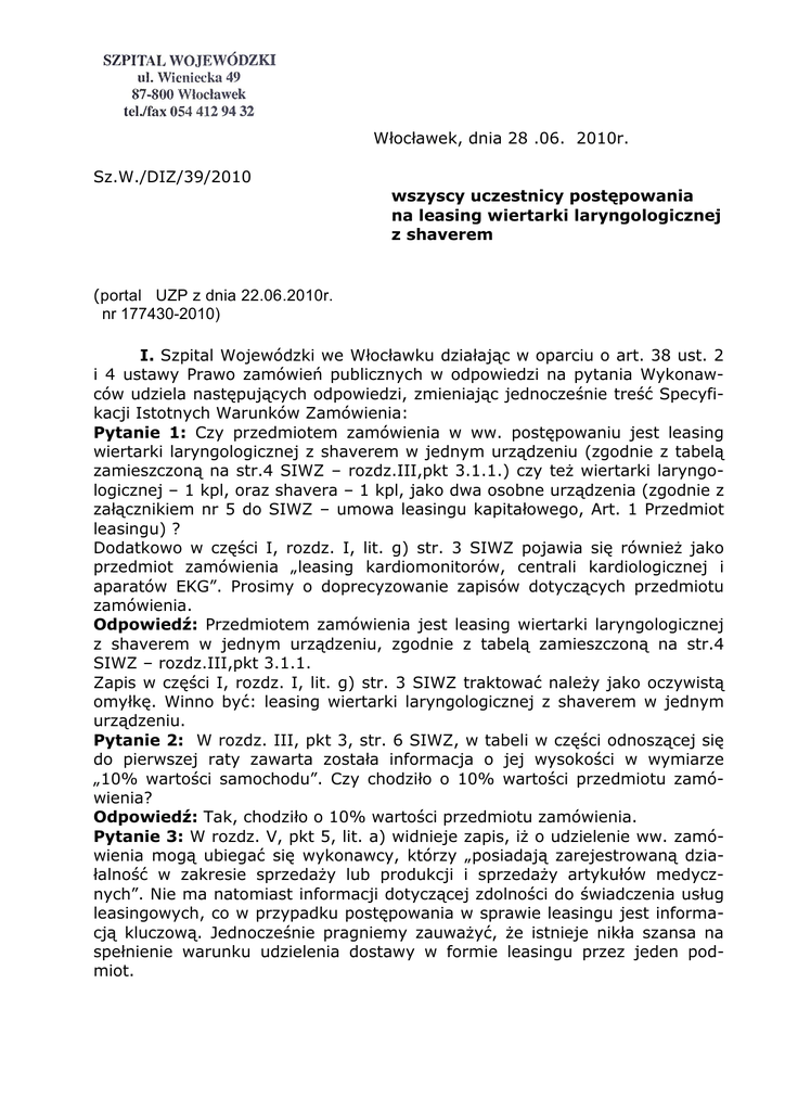 Włocławek, dnia 28 .06. 2010r. Sz.W./DIZ/39/2010 wszyscy uczestnicy postępowania na leasing wiertarki laryngologicznej z shaverem (portal UZP z dnia 22.06.2010r. nr 177430-2010) I. Szpital Wojewódzki we Włocławku działając w oparciu o art. 38 ust. 2 i 4 ustawy Prawo zamówień publicznych w odpowiedzi na pytania Wykonawców udziela następujących odpowiedzi, zmieniając jednocześnie treść Specyfikacji Istotnych Warunków Zamówienia: Pytanie 1: Czy przedmiotem zamówienia w ww. postępowaniu jest leasing wiertarki laryngologicznej z shaverem w jednym urządzeniu (zgodnie z tabelą zamieszczoną na str.4 SIWZ – rozdz.III,pkt 3.1.1.) czy teŜ wiertarki laryngologicznej – 1 kpl, oraz shavera – 1 kpl, jako dwa osobne urządzenia (zgodnie z załącznikiem nr 5 do SIWZ – umowa leasingu kapitałowego, Art. 1 Przedmiot leasingu) ? Dodatkowo w części I, rozdz. I, lit. g) str. 3 SIWZ pojawia się równieŜ jako przedmiot zamówienia „leasing kardiomonitorów, centrali kardiologicznej i aparatów EKG”. Prosimy o doprecyzowanie zapisów dotyczących przedmiotu zamówienia. Odpowiedź: Przedmiotem zamówienia jest leasing wiertarki laryngologicznej z shaverem w jednym urządzeniu, zgodnie z tabelą zamieszczoną na str.4 SIWZ – rozdz.III,pkt 3.1.1. Zapis w części I, rozdz. I, lit. g) str. 3 SIWZ traktować naleŜy jako oczywistą omyłkę. Winno być: leasing wiertarki laryngologicznej z shaverem w jednym urządzeniu. Pytanie 2: W rozdz. III, pkt 3, str. 6 SIWZ, w tabeli w części odnoszącej się do pierwszej raty zawarta została informacja o jej wysokości w wymiarze „10% wartości samochodu”. Czy chodziło o 10% wartości przedmiotu zamówienia? Odpowiedź: Tak, chodziło o 10% wartości przedmiotu zamówienia. Pytanie 3: W rozdz. V, pkt 5, lit. a) widnieje zapis, iŜ o udzielenie ww. zamówienia mogą ubiegać się wykonawcy, którzy „posiadają zarejestrowaną działalność w zakresie sprzedaŜy lub produkcji i sprzedaŜy artykułów medycznych”. Nie ma natomiast informacji dotyczącej zdolności do świadczenia usług leasingowych, co w przypadku postępowania w sprawie leasingu jest informacją kluczową. Jednocześnie pragniemy zauwaŜyć, Ŝe istnieje nikła szansa na spełnienie warunku udzielenia dostawy w formie leasingu przez jeden podmiot. W związku z powyŜszym istnieje potrzeba złoŜenia jednej oferty wspólnej przez podmiot finansujący i dostawcę sprzętu medycznego. Zwracamy się z prośbą o wyraźne rozdzielenie oraz wskazanie dokumentów niezbędnych do wzięcia udziału w postępowaniu dla obu tych podmiotów. Pozwoli to w jasny sposób wskazać Ŝądania Zamawiającego stawiane finansującemu oraz dostawcy, jak równieŜ dookreśli szczegółowe warunki umowy leasingu oraz dostawy. Odpowiedź: Oczywistym jest, iŜ jeden podmiot ma nikłą szansę na dostawę sprzętu medycznego i sfinansowanie tej dostawy w formie leasingu. To na Wykonawcy spoczywa obowiązek znalezienia podmiotu finansującego leasing. Naszym zdaniem wynika to z dotychczasowych zapisów SIWZ. Jednak w celu uściślenia tych zapisów zamawiający wprowadza następującą zmianę do treści SIWZ: W rozdz. V, pkt 5, lit. a) umieszcza się zapis następujący: „5.1. O udzielenie niniejszego zamówienia mogą ubiegać się Wykonawcy spełniający warunki udziału w postępowaniu określone w art. 22 ust. 1 ustawy pzp , tzn.: a. posiadają uprawnienie do wykonywania określonej działalności lub czynności, jeŜeli przepisy prawa nakładają obowiązek ich posiadania – - posiadają zarejestrowaną działalność gospodarczą w zakresie sprzedaŜy lub produkcji i sprzedaŜy artykułów medycznych, - posiadają zdolność do świadczenia usług leasingowych, - złoŜą wspólną ofertę na dostawę w formie leasingu przedmiotu zamówienia.” RównieŜ z dotychczasowych zapisów SIWZ wynika jakie dokumenty winien złoŜyć dostawca sprzętu, a jakie podmiot finansujący (leasingodawca). Przypominamy zatem, Ŝe: 1. dostawca sprzętu składa ofertę (załącznik nr 1 do SIWZ) wraz z pozostałymi dokumentami wymaganymi i opisanymi w SIWZ, 2. podmiot finansujący składa załącznik nr 1A, załącznik nr 5 (umowa leasingu kapitałowego wraz z załącznikami), Pytanie 4: Czy zamawiający dopuści formę porozumiewania się za pomocą pism przekazywanych faksem, w ślad której następowało będzie niezwłoczne przesłanie oryginału pisma w formie listu? Odpowiedź: Tak, zamawiający dopuszcza wyjątkowo porozumiewanie się za pomocą pism przekazywanych faksem, w ślad której następowało będzie niezwłoczne przesłanie oryginału pisma w formie listu. II. Szpital Wojewódzki we Włocławku działając jako zamawiający, w oparciu o art. 12a ust. 1 i 2 ustawy Prawo zamówień publicznych przedłuŜa termin składania ofert i wyznacza nowy: - termin składania ofert – 15 lipca 2010r., godz.10:00, - termin otwarcia ofert – 15 lipca 2010r., godz. 12:00. Pozostałe ustalenia SIWZ zachowują moc obowiązującą. Z powaŜaniem