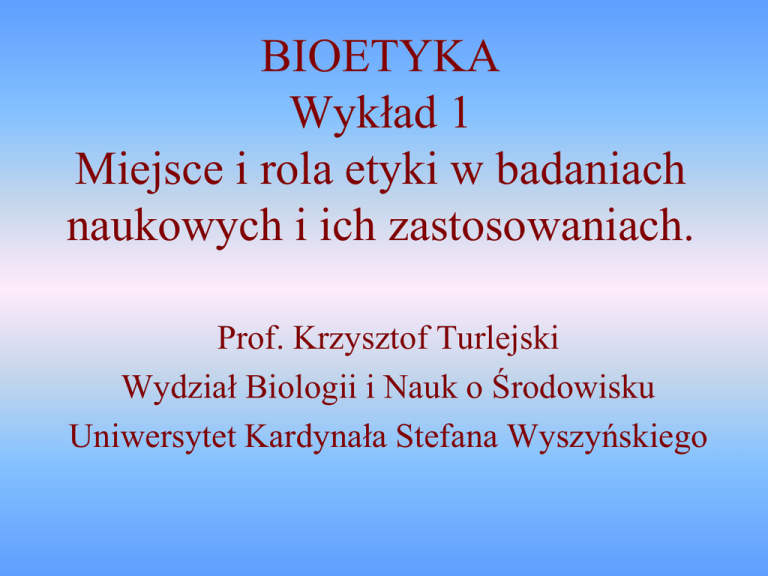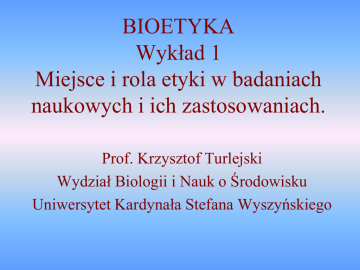 BIOETYKA Wykład 1 Miejsce i rola etyki w badaniach naukowych i ich zastosowaniach. Prof. Krzysztof Turlejski Wydział Biologii i Nauk o Środowisku Uniwersytet Kardynała Stefana Wyszyńskiego CEL WYKŁADÓW • Przedmiot będzie wykładany przez jeden semestr. Odbędzie się 15 dwugodzinnych wykładów. • Celem wykładów jest przekazanie Państwu podstaw wiedzy o interdyscyplinarnym polu dyskusji o: • - celu i dopuszczalnych metodach prowadzenia badań naukowych organizmów żywych, w tym człowiekiem; • - społecznych i ekologicznych skutkach zdobycia wiedzy i jej zastosowania; • - nowych dylematach, które ta wiedza rodzi. • Oczekuję aktywnego udziału, pytań i dyskusji. • Tylko część materiału omawianego na wykładach będzie udostępniona w formie pdf. Problemy etyczne badań biomedycznych • Przekonanie wielu naukowców o konieczność absolutnej wolności prowadzenia badań naukowych. • „Drzewo wiadomości dobrego i złego” • Rozwój w dziedzinie nauk biomedycznych i rolniczych dostarcza wiele nowych możliwości interwencji w życie ludzkie i ekosystem. • Pytania o moralną stronę działań umożliwionych przez rozwój wiedzy. • Pytania tego rodzaju zakładają (uznają) istnienie norm moralnych, warunkujących ocenę skutków zastosowania zdobyczy naukowych • Jaką etykę, jakie wartości i kryteria należy przyjąć dla oceny moralnej zdobywania wiedzy i jej stoosowania? Co może być uznane za moralnie słuszne, a co nie? • Jaka etyka dla bioetyki? Plan wykładów • • • • • • • • • • • • • • • 1. Wprowadzenie. Omówienie kursu. Zarys problematyki wykładów. 2. Historia refleksji nad skutkami badań naukowych i wpływu człowieka na przyrodę. 3. Skutki poznania kodu genetycznego. Badania prenatalne, eugenika. 4. Inżynieria genetyczna w służbie rolnictwa i badań naukowych, organizmy GMO. 5. Spór o początki osoby ludzkiej w rozwoju i medyczne zastosowania wiedzy. 6. Komórki macierzyste, klonowanie organizmów, przeszczepianie i produkcja narządów. 7. Wykorzystanie zwłok oraz tkanek i narządów ludzkich do transplantacji. 8. Badania naukowe na zwierzętach. Status etyczny zwierząt. 9. Leki. Skuteczność, skutki uboczne, etyka stosowania i reklamy leków. 10. Badania kliniczne na ludziach. Relacja lekarz-pacjent. 11. Reklama. Manipulowanie układem nagrody, empatią, mechanizmami tworzenia więzi emocjonalnej. 12. Nowoczesne techniki wpływania na zachowanie człowieka. 13. Intensywne techniki podtrzymywania życia, eutanazja, wspomagane samobójstwo, 14. Sztuczna inteligencja. Specyficznie ludzkie funkcje ośrodkowego układu nerwowego. 15. Czy poza człowiekiem istnieje motywacja etyczna w przyrodzie? Podsumowanie. Literatura zalecana i uzupełniająca • LITERATURA PODSTAWOWA • J. Różyńska, W. Chańska (red.), Bioetyka, Wolters Kluwer Polska, Warszawa 2013. • P. Łuków, T. Pasierski, Etyka medyczna z elementami filozofii, PZWL Warszawa 2013. • Włodzimierzz Tyburski, Pojednać się z ziemią. 1994. • LITERATURA DODATKOWA • M. Radkowska-Walkowicz, Doświadczenie in vitro. Niepłodność i nowe technologie reprodukcyjne w perspektywie antropologicznej, WUW Warszawa 2013. • Bioethics: The Science of Survival, Perspectives in Biology and Medicine 14(1970), 120-135 • W. T. Reich, “The Word ‘Bioethics’: The Struggle Over Its Earliest Meanings”, Kennedy Institute of Ethics Journal, Volume 5, Number 1, March 1995, pp. 19-34 Warunki zaliczenia • Na końcu każdego wykładu przedstawię kilka pytań, na które Student powinien znać odpowiedź po opanowaniu materiału przedstawionego na wykładzie. • Egzamin odbędzie się w zimowej sesji egzaminacyjnej. Będzie to egzamin pisemny, nie testowy. Na egzaminie każdy student dostanie 3 pytania z zestawu wszystkich zaprezentowanych na wykładach pytań. Pytania mogą być nieco inaczej sformułowane, ale ich sens i zakres będą podobne. • Stopnie (w skali od 2 do 5) zostaną wystawione na podstawie tego, co student napisał w odpowiedzi na pytania. Odpowiedź na każde pytanie będzie punktowana od 0 do 10 punktów. Minimum na stopień 3 to suma 9-ciu punktów. • Zarówno egzamin w pierwszym terminie, jak i egzamin poprawkowy odbędą się według tych samych zasad. Początki bioetyki uniwersyteckiej • Bioetyka ukształtowała się jako odrębna dyscyplina naukowa w końcu lat 1970-tych w USA. • Coraz wyraźniej widoczne różnorakie skutki zastosowania badań naukowych i industrializacja produkcji dla ludzi i przyrody wymagały wypracowania nowych reguł postępowania, systemu wartości, etyki. • Van Rensselaer Potter (1911-2001), profesor onkologii University of Wisconsin w Madison (USA). Problemy spowodowane przez rewolucję naukową i techniczną we współczesnym świecie. Potrzeba ustalenia nowych relacji człowieka ze środowiskiem. • André Hellegers, ginekolog-położnik, współzałożyciel Center for Bioethics w Kennedy Institute w Georgetown University. Etyczne zagadnienia diagnostyki i leczenia oraz medycznych badań naukowych z udziałem człowieka. Współpracował z instytucjami Kościoła Katolickiego. Poróżnił się w sprawie antykoncepcji (był jej zwolennikiem). Moja definicja bioetyki • Bioetyka (gr. bios - życie, ethos - zachowanie) – interdyscyplinarna dziedzina, łącząca wiedzę ścisłą, nie tylko z zakresu nauk biologicznych, i refleksję nad etycznym wymiarem ludzkich działań w zakresie biologii, ekologii, hodowli i medycyny. • Bioetycy analizują działania człowieka związane ze zdobywaniem wiedzy biologicznej i medycznej, skutki jej zastosowania oraz wpływ na ludzi i przyrodę. • W badaniach bioetycznych wykorzystuje się pojęcia i metody badawcze filozofii, teologii, psychologii, prawoznawstwa, socjologii, nauk przyrodniczych i medycznych. Główne działy bioetyki • • • • • etyka badań naukowych, etyka medyczna, etyka weterynaryjna etyka relacji człowiek 