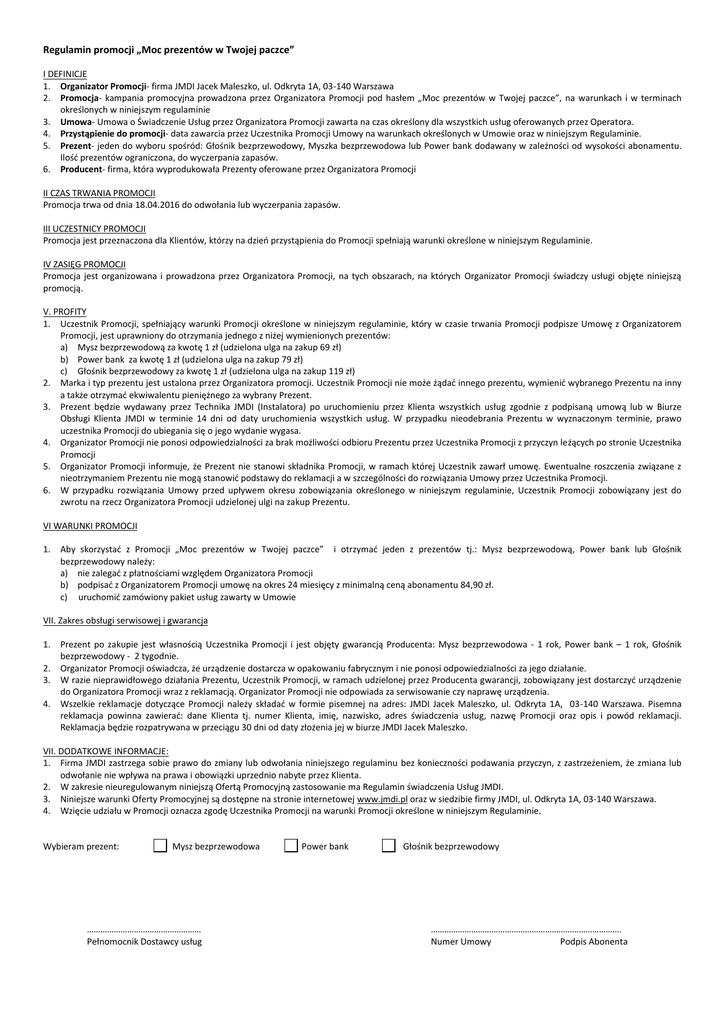 Regulamin promocji „Moc prezentów w Twojej paczce” I DEFINICJE 1. Organizator Promocji- firma JMDI Jacek Maleszko, ul. Odkryta 1A, 03-140 Warszawa 2. Promocja- kampania promocyjna prowadzona przez Organizatora Promocji pod hasłem „Moc prezentów w Twojej paczce”, na warunkach i w terminach określonych w niniejszym regulaminie 3. Umowa- Umowa o Świadczenie Usług przez Organizatora Promocji zawarta na czas określony dla wszystkich usług oferowanych przez Operatora. 4. Przystąpienie do promocji- data zawarcia przez Uczestnika Promocji Umowy na warunkach określonych w Umowie oraz w niniejszym Regulaminie. 5. Prezent- jeden do wyboru spośród: Głośnik bezprzewodowy, Myszka bezprzewodowa lub Power bank dodawany w zależności od wysokości abonamentu. Ilość prezentów ograniczona, do wyczerpania zapasów. 6. Producent- firma, która wyprodukowała Prezenty oferowane przez Organizatora Promocji II CZAS TRWANIA PROMOCJI Promocja trwa od dnia 18.04.2016 do odwołania lub wyczerpania zapasów. III UCZESTNICY PROMOCJI Promocja jest przeznaczona dla Klientów, którzy na dzień przystąpienia do Promocji spełniają warunki określone w niniejszym Regulaminie. IV ZASIĘG PROMOCJI Promocja jest organizowana i prowadzona przez Organizatora Promocji, na tych obszarach, na których Organizator Promocji świadczy usługi objęte niniejszą promocją. V. PROFITY 1. Uczestnik Promocji, spełniający warunki Promocji określone w niniejszym regulaminie, który w czasie trwania Promocji podpisze Umowę z Organizatorem Promocji, jest uprawniony do otrzymania jednego z niżej wymienionych prezentów: a) Mysz bezprzewodową za kwotę 1 zł (udzielona ulga na zakup 69 zł) b) Power bank za kwotę 1 zł (udzielona ulga na zakup 79 zł) c) Głośnik bezprzewodowy za kwotę 1 zł (udzielona ulga na zakup 119 zł) 2. Marka i typ prezentu jest ustalona przez Organizatora promocji. Uczestnik Promocji nie może żądać innego prezentu, wymienić wybranego Prezentu na inny a także otrzymać ekwiwalentu pieniężnego za wybrany Prezent. 3. Prezent będzie wydawany przez Technika JMDI (Instalatora) po uruchomieniu przez Klienta wszystkich usług zgodnie z podpisaną umową lub w Biurze Obsługi Klienta JMDI w terminie 14 dni od daty uruchomienia wszystkich usług. W przypadku nieodebrania Prezentu w wyznaczonym terminie, prawo uczestnika Promocji do ubiegania się o jego wydanie wygasa. 4. Organizator Promocji nie ponosi odpowiedzialności za brak możliwości odbioru Prezentu przez Uczestnika Promocji z przyczyn leżących po stronie Uczestnika Promocji 5. Organizator Promocji informuje, że Prezent nie stanowi składnika Promocji, w ramach której Uczestnik zawarł umowę. Ewentualne roszczenia związane z nieotrzymaniem Prezentu nie mogą stanowić podstawy do reklamacji a w szczególności do rozwiązania Umowy przez Uczestnika Promocji. 6. W przypadku rozwiązania Umowy przed upływem okresu zobowiązania określonego w niniejszym regulaminie, Uczestnik Promocji zobowiązany jest do zwrotu na rzecz Organizatora Promocji udzielonej ulgi na zakup Prezentu. VI WARUNKI PROMOCJI 1. Aby skorzystać z Promocji „Moc prezentów w Twojej paczce” i otrzymać jeden z prezentów tj.: Mysz bezprzewodową, Power bank lub Głośnik bezprzewodowy należy: a) nie zalegać z płatnościami względem Organizatora Promocji b) podpisać z Organizatorem Promocji umowę na okres 24 miesięcy z minimalną ceną abonamentu 84,90 zł. c) uruchomić zamówiony pakiet usług zawarty w Umowie VII. Zakres obsługi serwisowej i gwarancja 1. 2. 3. 4. Prezent po zakupie jest własnością Uczestnika Promocji i jest objęty gwarancją Producenta: Mysz bezprzewodowa - 1 rok, Power bank – 1 rok, Głośnik bezprzewodowy - 2 tygodnie. Organizator Promocji oświadcza, że urządzenie dostarcza w opakowaniu fabrycznym i nie ponosi odpowiedzialności za jego działanie. W razie nieprawidłowego działania Prezentu, Uczestnik Promocji, w ramach udzielonej przez Producenta gwarancji, zobowiązany jest dostarczyć urządzenie do Organizatora Promocji wraz z reklamacją. Organizator Promocji nie odpowiada za serwisowanie czy naprawę urządzenia. Wszelkie reklamacje dotyczące Promocji należy składać w formie pisemnej na adres: JMDI Jacek Maleszko, ul. Odkryta 1A, 03-140 Warszawa. Pisemna reklamacja powinna zawierać: dane Klienta tj. numer Klienta, imię, nazwisko, adres świadczenia usług, nazwę Promocji oraz opis i powód reklamacji. Reklamacja będzie rozpatrywana w przeciągu 30 dni od daty złożenia jej w biurze JMDI Jacek Maleszko. VII. DODATKOWE INFORMACJE: 1. Firma JMDI zastrzega sobie prawo do zmiany lub odwołania niniejszego regulaminu bez konieczności podawania przyczyn, z zastrzeżeniem, że zmiana lub odwołanie nie wpływa na prawa i obowiązki uprzednio nabyte przez Klienta. 2. W zakresie nieuregulowanym niniejszą Ofertą Promocyjną zastosowanie ma Regulamin świadczenia Usług JMDI. 3. Niniejsze warunki Oferty Promocyjnej są dostępne na stronie internetowej www.jmdi.pl oraz w siedzibie firmy JMDI, ul. Odkryta 1A, 03-140 Warszawa. 4. Wzięcie udziału w Promocji oznacza zgodę Uczestnika Promocji na warunki Promocji określone w niniejszym Regulaminie. Wybieram prezent: Mysz bezprzewodowa …………………………………………… Pełnomocnik Dostawcy usług Power bank Głośnik bezprzewodowy …………………………………………………………………………. Numer Umowy Podpis Abonenta