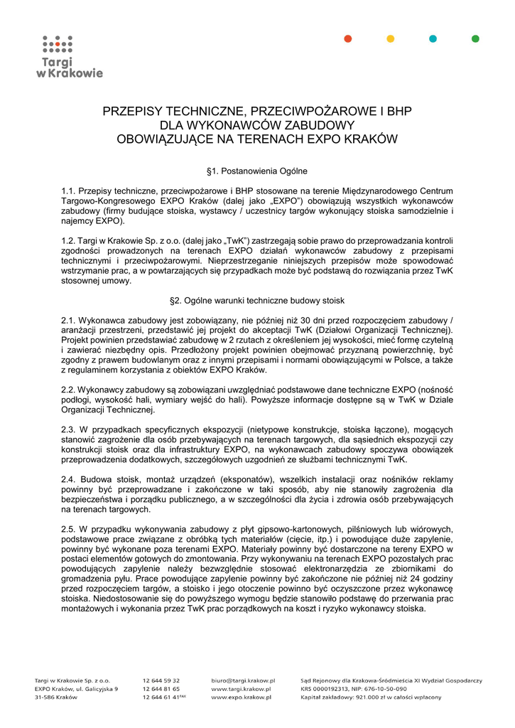 PRZEPISY TECHNICZNE, PRZECIWPOŻAROWE I BHP DLA WYKONAWCÓW ZABUDOWY OBOWIĄZUJĄCE NA TERENACH EXPO KRAKÓW §1. Postanowienia Ogólne 1.1. Przepisy techniczne, przeciwpożarowe i BHP stosowane na terenie Międzynarodowego Centrum Targowo-Kongresowego EXPO Kraków (dalej jako „EXPO”) obowiązują wszystkich wykonawców zabudowy (firmy budujące stoiska, wystawcy / uczestnicy targów wykonujący stoiska samodzielnie i najemcy EXPO). 1.2. Targi w Krakowie Sp. z o.o. (dalej jako „TwK”) zastrzegają sobie prawo do przeprowadzania kontroli zgodności prowadzonych na terenach EXPO działań wykonawców zabudowy z przepisami technicznymi i przeciwpożarowymi. Nieprzestrzeganie niniejszych przepisów może spowodować wstrzymanie prac, a w powtarzających się przypadkach może być podstawą do rozwiązania przez TwK stosownej umowy. §2. Ogólne warunki techniczne budowy stoisk 2.1. Wykonawca zabudowy jest zobowiązany, nie później niż 30 dni przed rozpoczęciem zabudowy / aranżacji przestrzeni, przedstawić jej projekt do akceptacji TwK (Działowi Organizacji Technicznej). Projekt powinien przedstawiać zabudowę w 2 rzutach z określeniem jej wysokości, mieć formę czytelną i zawierać niezbędny opis. Przedłożony projekt powinien obejmować przyznaną powierzchnię, być zgodny z prawem budowlanym oraz z innymi przepisami i normami obowiązującymi w Polsce, a także z regulaminem korzystania z obiektów EXPO Kraków. 2.2. Wykonawcy zabudowy są zobowiązani uwzględniać podstawowe dane techniczne EXPO (nośność podłogi, wysokość hali, wymiary wejść do hali). Powyższe informacje dostępne są w TwK w Dziale Organizacji Technicznej. 2.3. W przypadkach specyficznych ekspozycji (nietypowe konstrukcje, stoiska łączone), mogących stanowić zagrożenie dla osób przebywających na terenach targowych, dla sąsiednich ekspozycji czy konstrukcji stoisk oraz dla infrastruktury EXPO, na wykonawcach zabudowy spoczywa obowiązek przeprowadzenia dodatkowych, szczegółowych uzgodnień ze służbami technicznymi TwK. 2.4. Budowa stoisk, montaż urządzeń (eksponatów), wszelkich instalacji oraz nośników reklamy powinny być przeprowadzane i zakończone w taki sposób, aby nie stanowiły zagrożenia dla bezpieczeństwa i porządku publicznego, a w szczególności dla życia i zdrowia osób przebywających na terenach targowych. 2.5. W przypadku wykonywania zabudowy z płyt gipsowo-kartonowych, pilśniowych lub wiórowych, podstawowe prace związane z obróbką tych materiałów (cięcie, itp.) i powodujące duże zapylenie, powinny być wykonane poza terenami EXPO. Materiały powinny być dostarczone na tereny EXPO w postaci elementów gotowych do zmontowania. Przy wykonywaniu na terenach EXPO pozostałych prac powodujących zapylenie należy bezwzględnie stosować elektronarzędzia ze zbiornikami do gromadzenia pyłu. Prace powodujące zapylenie powinny być zakończone nie później niż 24 godziny przed rozpoczęciem targów, a stoisko i jego otoczenie powinno być oczyszczone przez wykonawcę stoiska. Niedostosowanie się do powyższego wymogu będzie stanowiło podstawę do przerwania prac montażowych i wykonania przez TwK prac porządkowych na koszt i ryzyko wykonawcy stoiska. 2.6. Wszelkie prace związane z budową stoiska, np. malowanie, szlifowanie powinny być ograniczone do minimum i wykonywane wyłącznie na powierzchni własnej stoiska. Prowadzenie tych prac poza obrębem własnego stoiska wymaga uzgodnień z TwK (Działem Organizacji Technicznej). 2.7. Ściany stoiska i inne elementy konstrukcyjne na granicy stoiska o wysokości powyżej 2,5 m zwrócone w stronę stoisk sąsiednich oraz widoczne tylne ściany stoisk należy wykończyć neutralnie (w kolorze białym). Dopuszcza się możliwość umieszczenia reklam w odległości 1,0 m od granicy sąsiedniego stoiska. 2.8. Jeżeli wynajęta powierzchnia nie zostanie całkowicie wykorzystana (w związku z zabudową i aranżacją stoiska), to wykonawca stoiska odpowiada za zagospodarowanie pustych i widocznych płaszczyzn graniczących z sąsiednimi stoiskami lub skierowanych na ciągi komunikacyjne. 2.9. Wykonawca stoiska jest zobowiązany do pozostawienia swobodnego dostępu do urządzeń technicznych EXPO (np. rozdzielni elektrycznych, zaworów wodociągowych) dla służb eksploatacyjnych EXPO. 2.10. Każdy wykonawca stoiska, jeżeli zachodzi taka konieczność, powinien umożliwić przeprowadzenie przez własne stoisko instalacji stoisk sąsiednich w celu ich podłączenia do urządzeń technicznych EXPO, o których mowa powyżej. 2.11. W obrębie stoiska zaleca się wyłożenie posadzki wykładziną podłogową. 2.12. Zamknięta obudowa stoiska (ścianki działowe szczelne, pełne, sufity) uniemożliwia równomierną wentylację, klimatyzację i ogrzewania. 2.13. Maksymalne natężenie hałasu na stoisku nie może przekroczyć 70 dB. Nie wolno kierować kolumn głośnikowych w stronę przejść i sąsiednich stoisk. Jeżeli uczestnik przewiduje, że natężenie hałasu przekroczy próg 70 dB, to powinien wykonać lub zlecić wykonawcy stoiska zamkniętą obudowę stoiska z materiałów dźwiękochłonnych. TwK dokonują pomiaru natężenia hałasu na przejściach komunikacyjnych przy kontrolowanym stoisku. W przypadku stwierdzenia przekroczenia dopuszczalnego natężenia hałasu, TwK zastrzegają sobie prawo przerwania prezentacji, do odłączenia dopływu energii elektrycznej do stoiska włącznie. W takim przypadku uczestnikowi nie przysługuje prawo do żądania odszkodowania od TwK za poniesione straty lub redukcji opłat za najem powierzchni wystawienniczej i wykonane przyłącze elektryczne. 2.14. Realizacja zabudowy musi być zgodna z zaakceptowanym przez TwK projektem, prawem budowlanym oraz z regulaminem korzystania z obiektów EXPO Kraków. 2.15. TwK są uprawnione do wstrzymania zabudowy oraz usunięcia jej elementów na koszt wykonawcy zabudowy, jeżeli: a) zabudowa wykonywana jest bez zaakcept