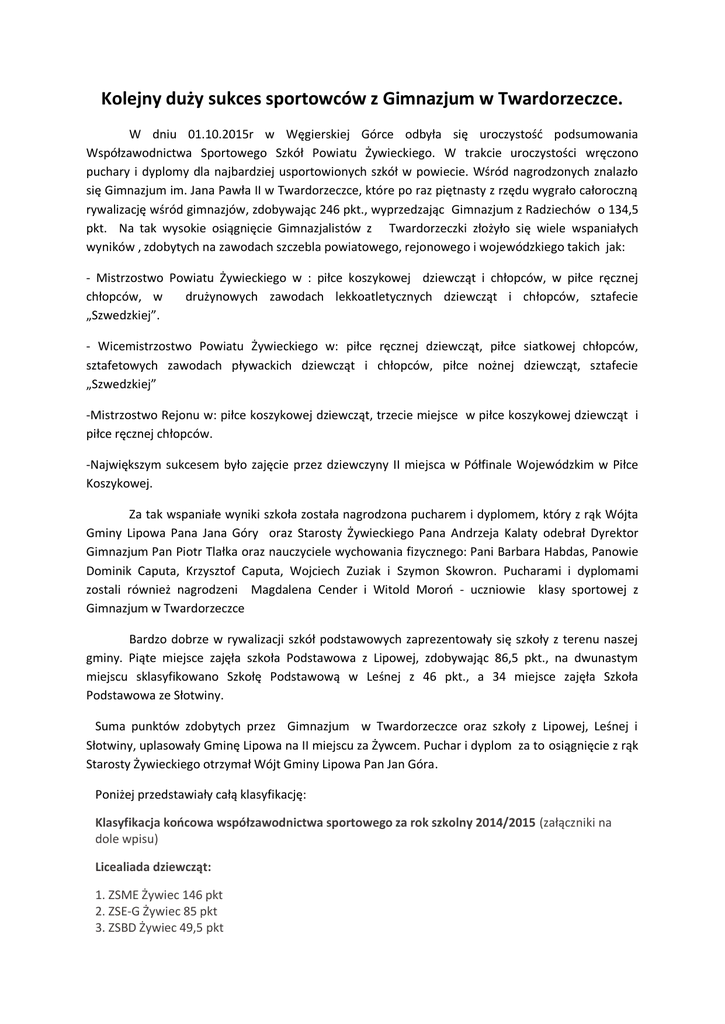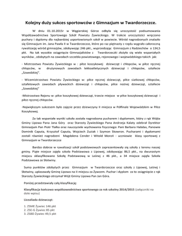Kolejny duży sukces sportowców z Gimnazjum w Twardorzeczce. W dniu 01.10.2015r w Węgierskiej Górce odbyła się uroczystośd podsumowania Współzawodnictwa Sportowego Szkół Powiatu Żywieckiego. W trakcie uroczystości wręczono puchary i dyplomy dla najbardziej usportowionych szkół w powiecie. Wśród nagrodzonych znalazło się Gimnazjum im. Jana Pawła II w Twardorzeczce, które po raz piętnasty z rzędu wygrało całoroczną rywalizację wśród gimnazjów, zdobywając 246 pkt., wyprzedzając Gimnazjum z Radziechów o 134,5 pkt. Na tak wysokie osiągnięcie Gimnazjalistów z Twardorzeczki złożyło się wiele wspaniałych wyników , zdobytych na zawodach szczebla powiatowego, rejonowego i wojewódzkiego takich jak: - Mistrzostwo Powiatu Żywieckiego w : piłce koszykowej dziewcząt i chłopców, w piłce ręcznej chłopców, w drużynowych zawodach lekkoatletycznych dziewcząt i chłopców, sztafecie „Szwedzkiej”. - Wicemistrzostwo Powiatu Żywieckiego w: piłce ręcznej dziewcząt, piłce siatkowej chłopców, sztafetowych zawodach pływackich dziewcząt i chłopców, piłce nożnej dziewcząt, sztafecie „Szwedzkiej” -Mistrzostwo Rejonu w: piłce koszykowej dziewcząt, trzecie miejsce w piłce koszykowej dziewcząt i piłce ręcznej chłopców. -Największym sukcesem było zajęcie przez dziewczyny II miejsca w Półfinale Wojewódzkim w Piłce Koszykowej. Za tak wspaniałe wyniki szkoła została nagrodzona pucharem i dyplomem, który z rąk Wójta Gminy Lipowa Pana Jana Góry oraz Starosty Żywieckiego Pana Andrzeja Kalaty odebrał Dyrektor Gimnazjum Pan Piotr Tlałka oraz nauczyciele wychowania fizycznego: Pani Barbara Habdas, Panowie Dominik Caputa, Krzysztof Caputa, Wojciech Zuziak i Szymon Skowron. Pucharami i dyplomami zostali również nagrodzeni Magdalena Cender i Witold Moroo - uczniowie klasy sportowej z Gimnazjum w Twardorzeczce Bardzo dobrze w rywalizacji szkół podstawowych zaprezentowały się szkoły z terenu naszej gminy. Piąte miejsce zajęła szkoła Podstawowa z Lipowej, zdobywając 86,5 pkt., na dwunastym miejscu sklasyfikowano Szkołę Podstawową w Leśnej z 46 pkt., a 34 miejsce zajęła Szkoła Podstawowa ze Słotwiny. Suma punktów zdobytych przez Gimnazjum w Twardorzeczce oraz szkoły z Lipowej, Leśnej i Słotwiny, uplasowały Gminę Lipowa na II miejscu za Żywcem. Puchar i dyplom za to osiągnięcie z rąk Starosty Żywieckiego otrzymał Wójt Gminy Lipowa Pan Jan Góra. Poniżej przedstawiały całą klasyfikację: Klasyfikacja koocowa współzawodnictwa sportowego za rok szkolny 2014/2015 (załączniki na dole wpisu) Licealiada dziewcząt: 1. ZSME Żywiec 146 pkt 2. ZSE-G Żywiec 85 pkt 3. ZSBD Żywiec 49,5 pkt 4. ZSOiT Milówka 34 pkt 5. I LO Żywiec 33 pkt 6. ZSAiO Żywiec 22,5 pkt 7. SMS ŻAPN Żywiec 19 pkt 8. ZSDiL Żywiec 14 pkt Licealiada chłopców: 1. ZSME Żywiec 175 pkt 2. SMS ŻAPN Żywiec 105 pkt 3. ZSE-G Żywiec 58 pkt 4. ZSAiO Żywiec 56 pkt 5. ZSS Żywiec 40 pkt 6. I LO Żywiec 39 pkt 7. ZSBD Żywiec 33 pkt 8. ZSOiT Milówka 30 pkt 9. ZSDiL Żywiec 11 pkt Gimnazjada: 1. G. Twardorzeczka 246 pkt 2. G. Radziechowy 111,5 pkt 3. G. nr 1 Łodygowice 109,5 pkt 4. G. SMS ŻAPN Żywiec 95 pkt 5. G. Łękawica 88 pkt 6. G. Milówka 83 pkt 7. G. Rajcza 76,5 pkt 8. G. nr 3 Żywiec 67 pkt 9. G. nr 2 Żywiec 60 pkt 10. G. Pietrzykowice 46,5 pkt 11. G. Wieprz 38 pkt 12. G. Międzybrodzie Bialskie 34 pkt 13. G. Cięcina 31,5 pkt 14. G. Gilowice 27,5 pkt 15. G. Ślemieo 24,5 pkt 16. G. nr 1 Żywiec 21,5 pkt 17. G. Juszczyna 20 pkt 18. G. Świnna 19 pkt 18. G. Węgierska Górka 19 pkt 20. G. nr 2 Jeleśnia 18,5 pkt 21. G. Pewel Ślemieoska 9 pkt 21. G. Żabnica 9 pkt 21. G. Rycerka Górna 9 pkt 24. G. nr 1 Jeleśnia 7,5 pkt 25. G. Sopotnia Mała 7 pkt 25. G. Międzybrodzie Żywieckie 7 pkt 27. G. nr 2 Łodygowice 5 pkt 28. G. Korbielów 4 pkt 28. G. Rychwałd 4 pkt 30. G. Ujsoły 3 pkt 31. G. Krzyżowa 2 pkt 32. G. Przyborów 1 pkt 32. G. Koszarawa 1 pkt Igrzyska: 1. SP Węgierska Górka 174,5 pkt 2. SP Radziechowy 130 pkt 3. SP nr 5 Żywiec 107 pkt 4. SP nr 1 Łodygowice 102 pkt 5. SP Lipowa 86,5 pkt 6. SP Pietrzykowice 81 pkt 7. SP Łękawica 77,5 pkt 8. SP Szare 57 pkt 9. SP nr 1 Żywiec 49 pkt 11. SP Międzybrodzie Bialskie 49 pkt 12. SP Leśna 46 pkt 13. SP Wieprz 36 pkt 13. SP Milówka 36 pkt 15. SP nr 3 Żywiec 34 pkt 16. SP nr 2 Jeleśnia 26 pkt 17. SP Gilowice 22 pkt 18. SP nr 8 Żywiec 20 pkt 19. SP nr 6 Żywiec 16,5 pkt 20. SP Korbielów 16 pkt 21. SP Żabnica 15 pkt 22. SP Kamesznica 12,5 pkt 23. SP Pewel Ślemieoska 12pkt 24. SP Rajcza 11 pkt 25. SP Międzybrodzie Żywieckie 10,5 pkt 26. SP Sól 10 pkt 27. SP Zwardoo 8 pkt 28. SP nr 9 Żywiec 5 pkt 29. SP Rycerka Górna 4 pkt 29. SP Sopotnia Wielka 4 pkt 29. SP Świnna 4 pkt 32. SP Krzyżowa 3 pkt 32. SP Glinka 3 pkt 34. SP Słotwina 2 pkt 34. SP Złatna 2 pkt 36. SP Pewel Wielka 1 pkt 36.SP Cięcina 1 pkt 36. SP Przyłęków 1 pkt