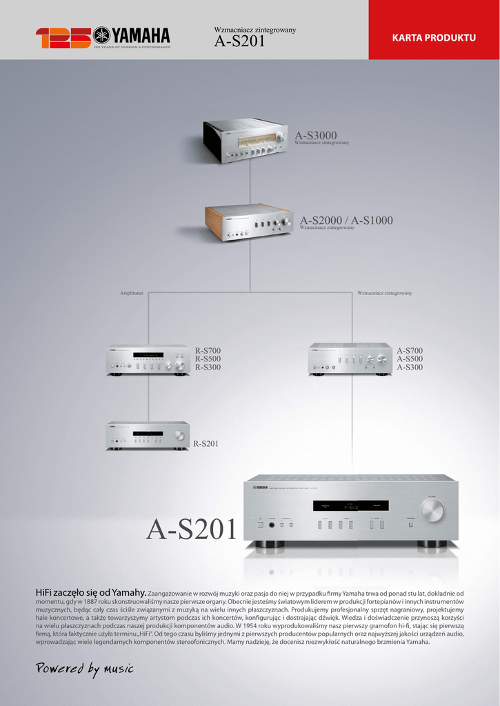 Wzmacniacz zintegrowany A-S201 KARTA PRODUKTU A-S3000 Wzmacniacz zintegrowany A-S2000 / A-S1000 Wzmacniacz zintegrowany Amplituner Wzmacniacz zintegrowany R-S700 R-S500 R-S300 A-S700 A-S500 A-S300 R-S201 A-S201 HiFi zaczęło się od Yamahy. Zaangażowanie w rozwój muzyki oraz pasja do niej w przypadku firmy Yamaha trwa od ponad stu lat, dokładnie od momentu, gdy w 1887 roku skonstruowaliśmy nasze pierwsze organy. Obecnie jesteśmy światowym liderem w produkcji fortepianów i innych instrumentów muzycznych, będąc cały czas ściśle związanymi z muzyką na wielu innych płaszczyznach. Produkujemy profesjonalny sprzęt nagraniowy, projektujemy hale koncertowe, a także towarzyszymy artystom podczas ich koncertów, konfigurując i dostrajając dźwięk. Wiedza i doświadczenie przynoszą korzyści na wielu płaszczyznach podczas naszej produkcji komponentów audio. W 1954 roku wyprodukowaliśmy nasz pierwszy gramofon hi-fi, stając się pierwszą firmą, która faktycznie użyła terminu „HiFi”. Od tego czasu byliśmy jednymi z pierwszych producentów popularnych oraz najwyższej jakości urządzeń audio, wprowadzając wiele legendarnych komponentów stereofonicznych. Mamy nadzieję, że docenisz niezwykłość naturalnego brzmienia Yamaha. Wzmacniacz zintegrowany A-S201 KARTA PRODUKTU Wysoka jakość dźwięku i wyszukane wzornictwo oparte na bogatym doświadczeniu Yamahy i high-endowych konstrukcjach. Wzmacniacz zintegrowany stworzony po to, aby czerpać radość z doskonałego brzmienia • Wysoka jakość dźwięku Yamaha, będącego efektem bogatego doświadczenia i tradycji oraz zaawansowanej specjalistycznej wiedzy technologicznej (Tradycyjna koncepcja Natural Sound/projekt obwodu wysokiej jakości dźwięku/wysoka moc wyjściowa 2 x 100 W) • Tryb Pure Direct zapewnia jeszcze czystszy dźwięk • Proste, a jednocześnie wyrafinowane wzornictwo • Gniazdo Phono MM do odtwarzania płyt LP • Zakręcane gniazda głośnikowe • Przełącznik głośników i gniazda głośnikowe dla dwóch zestawów • Czytelny pilot zdalnego sterowania • Gniazdo słuchawkowe Specyfikacja techniczna [Sekcja audio] Moc maksymalna Znamionowa moc wyjściowa (4 Ω, 1 kHz, 0,7% THD, wer. europejska) 140 W + 140 W (8 Ω, 40 Hz-20 kHz, 0,2% THD) 100 W + 100 W Moc maksymalna (JEITA) (4 Ω, 1 kHz, 10% THD) 140 W + 140 W Moc dynamiczna na kanał (8/6/4/2 Ω) 125 W/150 W/165 W/180 W Czułość/impedancja wejściowa CD, itd. Phono MM 500 mV / 47 kΩ 10 mV / 47 kΩ CD, itd. do wyj. głośnikowego Phono MM do wyjścia Rec 0,2% (50 W/8 Ω) 0,025% (2 V) CD, itd. (500 mV, wejście skrócone) Phono MM (10 mV, wejście skrócone) 100 dB 75 dB Całkowite zniekształcenia harmoniczne (20 Hz–20 kHz) Stosunek sygnał/szum (IHF-A sieciowe) [Ogólne] Zużycie energii w trybie czuwania Wymiary (S x W x G) Waga Dostępny w czarnym wykończeniu 0,5 W 435 x 141 x 333 mm 6,7 kg Wzmacniacz zintegrowany A-S201 Wysoka jakość dźwięku Yamaha, będącego efektem bogatego doświadczenia i tradycji oraz zaawansowanej specjalistycznej wiedzy technologicznej Yamaha, z trwającą ponad 125 lat historią jako producenta instrumentów muzycznych, zdobyła ogromną renomę także ze względu na konstrukcje hi-fi. A-S201 został stworzony w oparciu o to bogate doświadczenie i niesamowitą technologiczną wiedzę ekspercką. Wykorzystując koncepcję „Natural Sound”, zapewniającą reprodukcję naturalnego brzmienia i zbudowany ze skrupulatną dbałością, od projektu obwodu do odtwarzania pierwotnego brzmienia. Mimo że to podstawowy model, gwarantuje wysoką jakość dźwięku i muzycznie bogaty dźwięk. KARTA PRODUKTU Wysoka moc wyjściowa 2 x 100 W i projekt obwodu wysokiej jakości dźwięku A-S201 z wysoką mocą 2 x 100 W, przewyższającą wartość w tej klasie, szczyci się projektem zapewniającym wysoką jakość dźwięku, który minimalizuje długość ścieżek sygnałowych i optymalizuje rozplanowanie obwodów. Umiejscowienie zasilacza blisko obwodu wzmacniacza mocy redukuje stratę energii przy jednoczesnym udoskonaleniu szczytowej mocy zasilacza, aby zapewnić wysoki poziom głośności wyjściowej. Uziemienie ścieżki sygnałowej i zasilania połączone są w jednym punkcie, eliminując wzajemne zakłócenia i zapewniając wyższy stosunek sygnał/szum. Efektem jest czysty i niezwykle przestrzenny dźwięk. * 8 Ω, 40 Hz-20 kHz, 0,2% THD Tryb Pure Direct zapewnia jeszcze czystszy dźwięk Proste, a jednocześnie wyrafinowane wzornictwo Włączenie trybu Pure Direct sprawia, że sygnał audio omija obwody kontroli barwy (bas, soprany) i balansu dźwięku oraz układ separujący wzmacniacza. To poprawia jakość dźwięku przy jednoczesnym zapewnieniu pełnej mocy wyjściowej. Skrócenie ścieżki sygnałowej podwyższa czystość dźwięku, pomagając odtwarzać nawet najdelikatniejsze muzyczne niuanse. A-S201 oddziedziczył proste i jednocześnie wyrafinowane wzornictwo, z którego słyną zestawy audio hi-fi Yamahy. Za sprawą eleganckiego szczotkowanego wykończenia, urządzenie pięknie harmonizuje się z innymi konstrukcjami audio hi-fi. Przyciski kontrolne i pokrętła także potwierdzają nasze dążenie do prostoty i łatwości użytkowania. PURE DIRECT Wejście Bas Soprany Balans Wyjście Gniazdo Phono MM do odtwarzania płyt LP i zakręcane gniazda głośnikowe A-S201 wyposażony jest w gniazdo wejściowe Phono MM służące do połączenia gramofonu. Dzięki zastosowaniu pięciu gniazd wejściowych urządzenie może pełnić rolę centrum dla różnego rodzaju systemów audio. Duże zakręcane gniazda głośnikowe gwarantują solidne połączenie z grubymi przewodami głośnikowymi. Oszczędzanie energii Funkcja zarządzania energią automatycznie odłącza zasilanie (przełącza w tryb czuwania), kiedy amplituner przez długi czas nie pracuje. Tę funkcję można ustawić na 2, 4, 8 lub 12 godzin, a także wyłączyć. Co więcej, zużycie enerii w trybie czuwania wynosi zaledwie 0,5 W