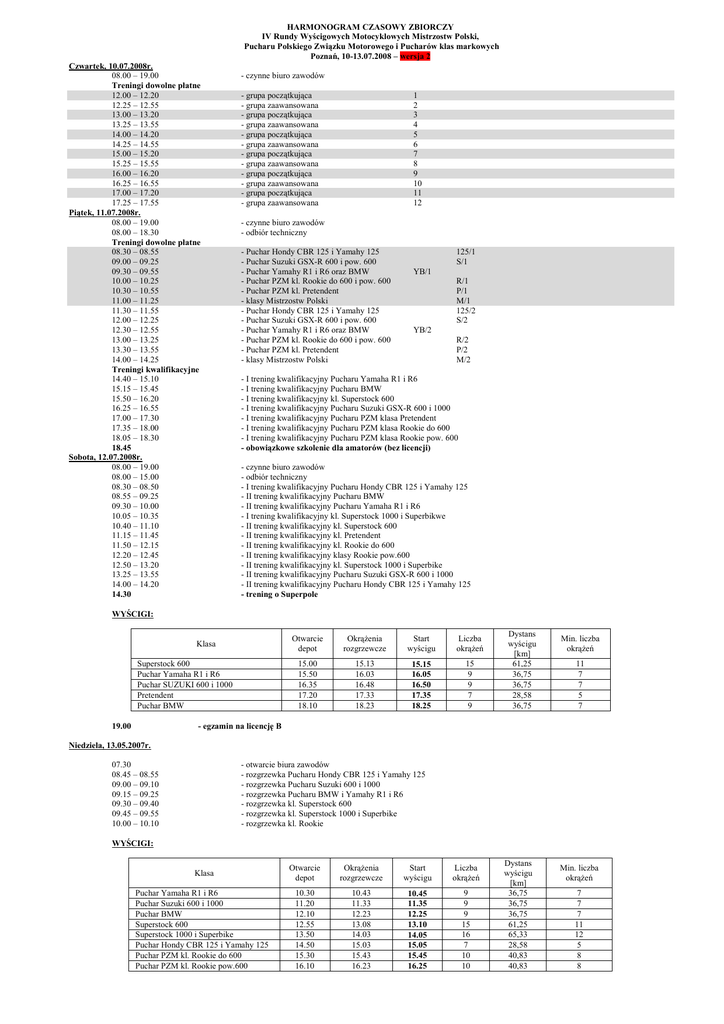 HARMONOGRAM CZASOWY ZBIORCZY IV Rundy Wyścigowych Motocyklowych Mistrzostw Polski, Pucharu Polskiego Związku Motorowego i Pucharów klas markowych Poznań, 10-13.07.2008 – wersja 2 Czwartek, 10.07.2008r. 08.00 – 19.00 Treningi dowolne płatne 12.00 – 12.20 12.25 – 12.55 13.00 – 13.20 13.25 – 13.55 14.00 – 14.20 14.25 – 14.55 15.00 – 15.20 15.25 – 15.55 16.00 – 16.20 16.25 – 16.55 17.00 – 17.20 17.25 – 17.55 Piątek, 11.07.2008r. 08.00 – 19.00 08.00 – 18.30 Treningi dowolne płatne 08.30 – 08.55 09.00 – 09.25 09.30 – 09.55 10.00 – 10.25 10.30 – 10.55 11.00 – 11.25 11.30 – 11.55 12.00 – 12.25 12.30 – 12.55 13.00 – 13.25 13.30 – 13.55 14.00 – 14.25 Treningi kwalifikacyjne 14.40 – 15.10 15.15 – 15.45 15.50 – 16.20 16.25 – 16.55 17.00 – 17.30 17.35 – 18.00 18.05 – 18.30 18.45 Sobota, 12.07.2008r. 08.00 – 19.00 08.00 – 15.00 08.30 – 08.50 08.55 – 09.25 09.30 – 10.00 10.05 – 10.35 10.40 – 11.10 11.15 – 11.45 11.50 – 12.15 12.20 – 12.45 12.50 – 13.20 13.25 – 13.55 14.00 – 14.20 14.30 - czynne biuro zawodów - grupa początkująca - grupa zaawansowana - grupa początkująca - grupa zaawansowana - grupa początkująca - grupa zaawansowana - grupa początkująca - grupa zaawansowana - grupa początkująca - grupa zaawansowana - grupa początkująca - grupa zaawansowana 1 2 3 4 5 6 7 8 9 10 11 12 - czynne biuro zawodów - odbiór techniczny - Puchar Hondy CBR 125 i Yamahy 125 - Puchar Suzuki GSX-R 600 i pow. 600 - Puchar Yamahy R1 i R6 oraz BMW - Puchar PZM kl. Rookie do 600 i pow. 600 - Puchar PZM kl. Pretendent - klasy Mistrzostw Polski - Puchar Hondy CBR 125 i Yamahy 125 - Puchar Suzuki GSX-R 600 i pow. 600 - Puchar Yamahy R1 i R6 oraz BMW - Puchar PZM kl. Rookie do 600 i pow. 600 - Puchar PZM kl. Pretendent - klasy Mistrzostw Polski 125/1 S/1 YB/1 R/1 P/1 M/1 125/2 S/2 YB/2 R/2 P/2 M/2 - I trening kwalifikacyjny Pucharu Yamaha R1 i R6 - I trening kwalifikacyjny Pucharu BMW - I trening kwalifikacyjny kl. Superstock 600 - I trening kwalifikacyjny Pucharu Suzuki GSX-R 600 i 1000 - I trening kwalifikacyjny Pucharu PZM klasa Pretendent - I trening kwalifikacyjny Pucharu PZM klasa Rookie do 600 - I trening kwalifikacyjny Pucharu PZM klasa Rookie pow. 600 - obowiązkowe szkolenie dla amatorów (bez licencji) - czynne biuro zawodów - odbiór techniczny - I trening kwalifikacyjny Pucharu Hondy CBR 125 i Yamahy 125 - II trening kwalifikacyjny Pucharu BMW - II trening kwalifikacyjny Pucharu Yamaha R1 i R6 - I trening kwalifikacyjny kl. Superstock 1000 i Superbikwe - II trening kwalifikacyjny kl. Superstock 600 - II trening kwalifikacyjny kl. Pretendent - II trening kwalifikacyjny kl. Rookie do 600 - II trening kwalifikacyjny klasy Rookie pow.600 - II trening kwalifikacyjny kl. Superstock 1000 i Superbike - II trening kwalifikacyjny Pucharu Suzuki GSX-R 600 i 1000 - II trening kwalifikacyjny Pucharu Hondy CBR 125 i Yamahy 125 - trening o Superpole WYŚCIGI: Klasa Superstock 600 Puchar Yamaha R1 i R6 Puchar SUZUKI 600 i 1000 Pretendent Puchar BMW 19.00 Otwarcie depot OkrąŜenia rozgrzewcze Start wyścigu Liczba okrąŜeń 15.00 15.50 16.35 17.20 18.10 15.13 16.03 16.48 17.33 18.23 15.15 16.05 16.50 17.35 18.25 15 9 9 7 9 Dystans wyścigu [km] 61,25 36,75 36,75 28,58 36,75 Min. liczba okrąŜeń 11 7 7 5 7 - egzamin na licencję B Niedziela, 13.05.2007r. 07.30 08.45 – 08.55 09.00 – 09.10 09.15 – 09.25 09.30 – 09.40 09.45 – 09.55 10.00 – 10.10 - otwarcie biura zawodów - rozgrzewka Pucharu Hondy CBR 125 i Yamahy 125 - rozgrzewka Pucharu Suzuki 600 i 1000 - rozgrzewka Pucharu BMW i Yamahy R1 i R6 - rozgrzewka kl. Superstock 600 - rozgrzewka kl. Superstock 1000 i Superbike - rozgrzewka kl. Rookie WYŚCIGI: Klasa Otwarcie depot OkrąŜenia rozgrzewcze Start wyścigu Liczba okrąŜeń Puchar Yamaha R1 i R6 Puchar Suzuki 600 i 1000 Puchar BMW Superstock 600 Superstock 1000 i Superbike Puchar Hondy CBR 125 i Yamahy 125 Puchar PZM kl. Rookie do 600 Puchar PZM kl. Rookie pow.600 10.30 11.20 12.10 12.55 13.50 14.50 15.30 16.10 10.43 11.33 12.23 13.08 14.03 15.03 15.43 16.23 10.45 11.35 12.25 13.10 14.05 15.05 15.45 16.25 9 9 9 15 16 7 10 10 Dystans wyścigu [km] 36,75 36,75 36,75 61,25 65,33 28,58 40,83 40,83 Min. liczba okrąŜeń 7 7 7 11 12 5 8 8
