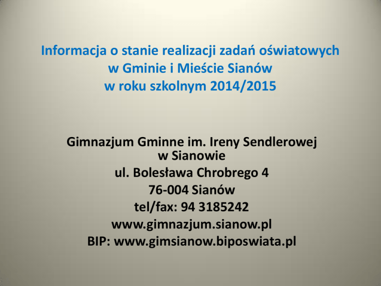 Informacja o stanie realizacji zadań oświatowych w Gminie i Mieście Sianów w roku szkolnym 2014/2015 Gimnazjum Gminne im. Ireny Sendlerowej w Sianowie ul. Bolesława Chrobrego 4 76-004 Sianów tel/fax: 94 3185242 www.gimnazjum.sianow.pl BIP: www.gimsianow.biposwiata.pl Wyniki egzaminu % Stanin - kraj Stanin – zachodniopomorskie Historia i wiedza o społeczeństwie 67,53 6 7 Język polski 58,59 4 6 Matematyka 39,18 3 5 Przedmioty przyrodnicze 45,58 4 5 Język angielski 56,87 4 4 Język niemiecki 44,33 3 3 Gimnazjum Gminne im Ireny Sendlerowej w Sianowie Tendencja rozwojowa szkoły - język polski j. polski - % 65,99 7064,86 60 j. polski - staniny 58,59 52,42 stanin 50 40 30 20 10 2013 0 2012 9 8 7 6 5 4 3 3 2 1 0 2013 2014 2015 Gimnazjum Gminne im Ireny Sendlerowej w Sianowie 5 4 2014 lata 2015 Tendencja rozwojowa szkoły - historia i wiedza o społeczeństwie historia i wos - % historia i wos - staniny 100 90 80 60 58,25 60,03 2013 2014 67,53 stanin 63,04 70 50 40 30 20 10 0 2012 2015 9 8 7 6 6 5 4 3 2 1 0 2013 Gimnazjum Gminne im Ireny Sendlerowej w Sianowie 6 6 2014 2015 Tendencja rozwojowa szkoły - matematyka matematyka - % matematyka - staniny 9 90 8 80 7 70 6 60 50 41,16 43,36 40,48 39,18 40 stanin 100 5 4 4 3 3 30 2 20 10 1 0 0 2012 4 2013 2014 2015 2013 Gimnazjum Gminne im Ireny Sendlerowej w Sianowie 2014 2015 Tendencja rozwojowa szkoły - przedmioty przyrodnicze przedmioty przyrodnicze - % przedmioty przyrodnicze - staniny 100 9 90 8 80 7 70 48,56 54,31 6 50,4 50 45,59 40 Tytuł osi 60 5 3 20 2 10 1 0 0 2013 2014 2015 4 4 4 30 2012 5 2013 Gimnazjum Gminne im Ireny Sendlerowej w Sianowie 2014 2015 Tendencja rozwojowa szkoły - język angielski (pp) j. angielski – podstawowy - % j. angielski – podstawowy (staniny) 100 9 90 8 80 7 70 58,27 60 57,44 63,71 56,87 6 5 5 50 4 4 40 30 3 20 2 10 1 0 0 2012 5 2013 2014 2015 2013 Gimnazjum Gminne im Ireny Sendlerowej w Sianowie 2014 2015 Organizowane przez placówkę konkursy, imprezy i zawody sportowe gminne, powiatowe, wojewódzkie, regionalne. Konkursy: • Wojewódzki konkurs twórczości Karola Wojtyły – Jana Pawła II (14 edycja) • Tydzień Języków Obcych Imprezy: • • • • • • • • • • • • • Święto szkoły "Kropla ciepła od Ciebie" Finał "Kropla ciepła od Ciebie" Świąteczne Spotkanie z Gimnazjum Światowy Dzień Walki z AIDS Wigilia szkolna Dzień Bezpiecznego Internetu Dzień Otwartej Szkoły Szkolna Giełda Zawodoznawcza I Dzień Wiosny Dzień Ziemi Rocznica Uchwalenia Konstytucji Światowy Dzień Bez Papierosa zawody i działania charakterze sportowym: • • • • • • • • • • • • • • • • • • Turniej Tenisa Stołowego w ramach Igrzysk Młodzieży Szkolnej oraz Gimnazjady Rajd pieszy okolicami Sianowa Mistrzostwa Szkoły w Tenisie Stołowym Wysokokwalifikowany Nocny Rajd Pieszy „Sezam, Jesień i Ty” Powiat w Piłce Nożnej Dziewcząt Mistrzostwa Szkoły w Tenisie Stołowym Mistrzostwa Powiatu w Tenisie Stołowym Świąteczne Spotkanie z Gimnazjum (zawody sportowe – siatkówka) Mistrzostwa Szkoły w Unihokeju Dziewcząt Mistrzostwa Szkoły w Unihokeju Chłopców Rajd Dzienny (Niebieski Szlak) Mistrzostwa Regionu w Tenisie Stołowym Dzień Otwarty Szkoły (Promocja Szkoły) – zawody sportowe dla 6-klasistów Rajd Dzienny z 6-klasistami Paintball – 1c (Gry terenowe) Unijny Turniej Piłki Nożnej Chłopców Egzamin sprawnościowy dla 6-klasistów Biwak Ekologiczny • Realizowane zajęcia dodatkowe, pozalekcyjne, projekty : • • • • Program „Trzymaj Formę” (Sanepid), Projekt „Lepsza szkoła” (matematyka), Klub Turystyczny, „Znajdź właściwe rozwiązanie” – Program profilaktyki palenia tytoniu dla uczniów klas starszych szkoły podstawowej i gimnazjum, • Program „Savoir Vivre”, • Zajęcia wynikające z art.42 pkt 2 Karty Nauczyciela, • Udział uczniów w akcjach charytatywnych: ⁻ Dziewczynka z zapałkami, ⁻ Góra Grosza ⁻ WOŚP. Realizowane programy wspierające działalność edukacyjno-opiekuńczą • Projekt „Zwalczamy nowotwory” – program profilaktyki nowotworowej, • udział w pracach Zespołu d.s. opracowania Strategii Rozwiązywania Problemów Społecznych na lata 2016-2024. • udział w lekcji na żywo „Opowieść o żydach polskich”, • standaryzacja zadań w gimnazjach w ramach Projektu VII „Budowa banków zadań”, • przystąpienie do projektu „Partnerstwo Lokalne na Rzecz Rozwoju Doradztwa Edukacyjno-Zawodowego w województwie zachodniopomorskim. Programy własne: •Program „Sukces”, • Program wychowawczy, •Szkolny Program Profilaktyki Dzieci i Młodzieży, •Program Profilaktyczny „Bezpiecznie w Przyszłość”, •Szkolny Program Profilaktyki Uzależnień „Bezpieczna Szkoła”, Działające przy szkole organizacje: • Stowarzyszenie „PRO SCHOLA” w celu pozyskiwania środków na rzecz rozwoju szkoły. Gimnazjum Gminne im Ireny Sendlerowej w Sianowie Osiągnięcia uczniów, szkoły, placówki - zajęcia pozalekcyjne, osiągnięcia sportowe, kulturalne, wystawy, prezentacje sportowe: Mistrzostwa Powiatu Koszalińskiego w Sztafetowych Biegach Przełajowych - I miejsce dziewczęta • Wojewódzki Turniej Tenisa Stołowego – V miejsce dziewczęta • Rejonowy Turniej Unihokeja – III miejsce drużyna dziewcząt • Rejonowy Turniej Unihokeja – II miejsce drużyna chłopców Gimnazjum Gminne im Ireny Sendlerowej w Sianowie artystyczne: • Wojewódzki Konkurs Plastyczny – projekt zawieszki na drzwi „Pokój dla niepalących” – I miejsce • Wojewódzki Konkurs Plastyczny „Świętymi Bądźcie” - wyróżnienie • Turniej Recytatorski Twórczości Religijnej – II miejsce • XIV Wojewódzki Konkurs Twórczości Karola Wojtyły – Jana Pawła II, kategoria: praca literacka – III miejsce edukacyjne: • Konkurs biologiczny o szczeblu wojewódzkim– finalista • Konkurs języka angielskiego o szczeblu wojewódzkim – finalistka • Wyróżni