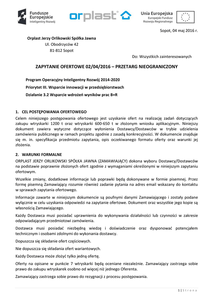 Sopot, 04 maj 2016 r. Orplast Jerzy Orlikowski Spółka Jawna Ul. Obodrzyców 42 81-812 Sopot Do: Wszystkich zainteresowanych ZAPYTANIE OFERTOWE 02/04/2016 – PRZETARG NIEOGRANICZONY Program Operacyjny Inteligentny Rozwój 2014-2020 Priorytet III. Wsparcie innowacji w przedsiębiorstwach Działanie 3.2 Wsparcie wdrożeń wyników prac B+R 1. CEL POSTĘPOWANIA OFERTOWEGO Celem niniejszego postępowania ofertowego jest uzyskanie ofert na realizację zadań dotyczących zakupu wtryskarki 1200 t oraz wtryskarki 600-650 t w złożonym wniosku aplikacyjnym. Niniejszy dokument zawiera wytyczne dotyczące wyłonienia Dostawcy/Dostawców w trybie udzielenia zamówienia publicznego w ramach projektu zgodnie z zasadą konkrecyjności. W dokumencie znajduje się m. in. specyfikacja przedmiotu zapytania, opis oczekiwanego formatu oferty oraz warunki jej złożenia. 2. WARUNKI FORMALNE ORPLAST JERZY ORLIKOWSKI SPÓŁKA JAWNA (ZAMAWIAJĄCY) dokona wyboru Dostawcy/Dostawców na podstawie poprawnie złożonych ofert zgodnie z wymaganiami określonymi w niniejszym zapytaniu ofertowym. Wszelkie zmiany, dodatkowe informacje lub poprawki będą dokonywane w formie pisemnej. Przez formę pisemną Zamawiający rozumie również zadanie pytania na adres email wskazany do kontaktu w sprawach zapytania ofertowego. Informacje zawarte w niniejszym dokumencie są poufnymi danymi Zamawiającego i zostały podane wyłącznie w celu uzyskania odpowiedzi na zapytanie ofertowe. Dokument oraz wszystkie jego kopie są własnością Zamawiającego. Każdy Dostawca musi posiadać uprawnienia do wykonywania działalności lub czynności w zakresie odpowiadającym przedmiotowi zamówienia. Dostawca musi posiadać niezbędną wiedzę i doświadczenie oraz dysponować potencjałem technicznym i osobami zdolnymi do wykonania dostawcy. Dopuszcza się składanie ofert częściowych. Nie dopuszcza się składania ofert wariantowych. Każdy Dostawca może złożyć tylko jedną ofertę. Oferty na opisane w punkcie 7 wtryskarki będą oceniane niezależnie. Zamawiający zastrzega sobie prawo do zakupu wtryskarek osobno od więcej niż jednego Oferenta. Zamawiający zastrzega sobie prawo do rezygnacji z procesu postępowania. 1|S t r o n a Zamawiający zastrzega sobie prawo do zawarcia umowy z więcej, niż jednym dostawcą wyłonionym w postępowaniu. Zaoferowane wtryskarki muszą być fabrycznie nowe. Oferowane wtryskarki muszą posiadać gwarancję na minimum 12 miesięcy od daty dostawy wtryskarek do Zamawiającego. Wszelkie koszty przygotowania i dostarczenia oferty ponosi Oferent. Każdy z Oferentów otrzyma informację o rozstrzygnięciu, wstrzymaniu lub odstąpieniu od postępowania. 3. INFORMACJA NA TEMAT ZAKRESU WYKLUCZENIA W celu uniknięcia konfliktu interesów, w postępowaniu nie mogą brać udziału podmioty powiązane z ORPLAST JERZY ORLIKOWSKI SPÓŁKA JAWNA osobowo lub kapitałowo. Przez powiązania kapitałowe lub osobowe rozumie się wzajemne powiązania między Zamawiającym lub osobami upoważnionymi do zaciągania zobowiązań w imieniu Zamawiającego lub osobami wykonującymi w imieniu Zamawiającego czynności związane z przygotowaniem i przeprowadzeniem procedury wyboru wykonawcy a wykonawcą, polegające w szczególności na: a) uczestniczeniu w spółce jako wspólnik spółki cywilnej lub spółki osobowej, b) posiadaniu co najmniej 10 % udziałów lub akcji, c) pełnieniu funkcji członka organu nadzorczego lub zarządzającego, prokurenta, pełnomocnika, d) pozostawaniu w związku małżeńskim, w stosunku pokrewieństwa lub powinowactwa w linii prostej, pokrewieństwa drugiego stopnia lub powinowactwa drugiego stopnia w linii bocznej lub w stosunku przysposobienia, opieki lub kurateli. Udzielenie zamówienia podmiotowi powiązanemu jest naruszeniem zasady konkrecyjności. 4. FORMAT OFERTY Oferta powinna być sporządzona w języku polskim. Oferta musi zawierać wycenę oraz opis oferowanych wtryskarek zgodnie ze specyfikacją wymogów technicznych zapytania. Wycena powinna być dokonana w cenach netto w złotych polskich. Zamawiający dopuszcza składanie ofert również w euro oraz dolarach amerykańskich. Jeśli ceny na ofercie będą wyrażone w innej walucie niż złoty polski to podczas wyboru najkorzystniejszej oferty będą one przeliczane przy zastosowaniu średniego kursu sprzedaży ogłaszanego przez NBP, obowiązującego w ostatnim dniu roboczym poprzedzającym dzień dokonywania wyboru. Oferta musi zostać sporządzona na czytelnie wypełnionym i podpisanym formularzu ofertowym stanowiącym Załącznik nr 1 do niniejszego zapytania. W ofercie należy wskazać okres przyznawanej gwarancji na przedmiot zapytania ofertowego oraz warunki płatności. W ofercie należy wskazać termin ważności oferty (minimum 90 dni) i dane osoby kontaktowej. Oferty złożone po terminie nie będą brane pod uwagę. 2|S t r o n a Do oceny ofert brane będą pod uwagę tylko oferty spełniające w całości wymagania określone w zapytaniu. Zamawiający posiada prawo do odrzucenia oferty, jeśli oferta jest niekompletna lub niezgodna z zapytaniem. 5. TERMIN ORAZ SPOSÓB SKŁADANIA OFERT Oferty prosimy składać pocztą elektroniczną na podany adres e-mail, w pliku zabezpieczonym przed edycją np. PDF lub opcjonalnie w 1 egzemplarzu papierowym do dnia 17-06-2016 r. do godziny 12:00. ORPLAST JERZY ORLIKOWSKI SPÓŁKA JAWNA UL. OBODRZYCÓW 42 81-812 SOPOT [email protected] Dodatkowych wyjaśnień w sprawie postępowania udzielać będzie: Jerzy Orlikowski tel. +48 602 216 869 mail: [email protected] Dostawca przed upływem terminu do składania ofert ma prawo: wycofać ofertę poprzez złożenie pisemnego powiadomienia drogą opisaną dla składania ofert, zmienić ofertę - powiadomienie o wprowadzeniu zmian musi być złożone wg takich samych zasad jak składana oferta, odpowiednio oznakowanych z dopiskiem „ZAMIANA”. 6. KRYTERIA OCENY OFERTY, INFORMACJA O WAGACH PROCENTOWYCH ORAZ SPOSÓB PRZYZNAWANIA PUNKT