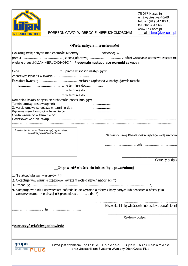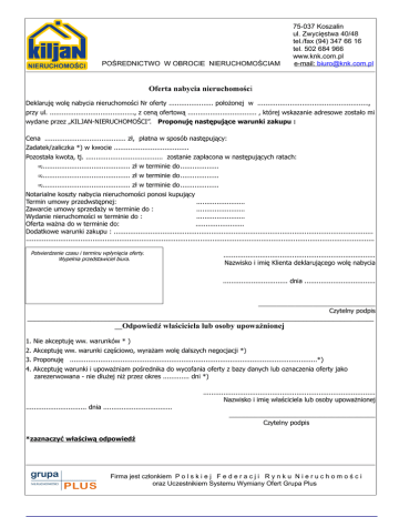 POŚREDNICTWO W OBROCIE NIERUCHOMOŚCIAM 75-037 Koszalin ul. Zwycięstwa 40/48 tel./fax (94) 347 66 16 tel. 502 684 966 www.knk.com.pl e-mail: [email protected] Oferta nabycia nieruchomości Deklaruję wolę nabycia nieruchomości Nr oferty ...................... położonej w ......................................................., przy ul. .........................................., z ceną ofertową .................................. , której wskazanie adresowe zostało mi wydane przez „KILJAN-NIERUCHOMOŚCI”. Proponuję następujące warunki zakupu : Cena ........................................ zł, płatna w sposób następujący: Zadatek/zaliczka *) w kwocie ..................................... Pozostała kwota, tj. ...................................... zostanie zapłacona w następujących ratach: •............................................ zł w terminie do................... •............................................ zł w terminie do................... •............................................ zł w terminie do................... Notarialne koszty nabycia nieruchomości ponosi kupujący Termin umowy przedwstępnej: ........................ Zawarcie umowy sprzedaży w terminie do : ........................ Wydanie nieruchomości w terminie do : ........................ Oferta ważna do w terminie do: ........................ Dodatkowe warunki zakupu : ................................................................................................................................ ............................................................................................................................................................................ Potwierdzenie czasu i terminu wpłynięcia oferty. Wypełnia przedstawiciel biura. ........................................................................... Nazwisko i imię Klienta deklarującego wolę nabycia ................................ dnia ................................... ________________________________ Czytelny podpis _____________________________________________________________________________________________ __Odpowiedź właściciela lub osoby upoważnionej 1. Nie akceptuję ww. warunków * ) 2. Akceptuję ww. warunki częściowo, wyrażam wolę dalszych negocjacji *) 3. Proponuję ..........................................................................................................................*) 4. Akceptuję warunki i upoważniam pośrednika do wycofania oferty z bazy danych lub oznaczenia oferty jako zarezerwowana - nie dłużej niż przez okres ............. dni *) ..................................................................................... Nazwisko i imię właściciela lub osoby upoważnionej .............................. dnia .................................. ________________________________________ Czytelny podpis *zaznaczyć właściwą odpowiedź Firma jest członkiem P o l s k i e j F e d e r a c j i R y n k u N i e r u c h o m o ś c i oraz Uczestnikiem Systemu Wymiany Ofert Grupa Plus