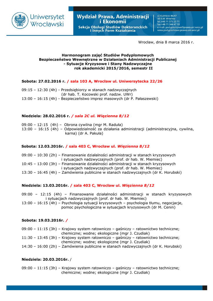 Wrocław, dnia 8 marca 2016 r. Harmonogram zajęć Studiów Podyplomowych Bezpieczeństwo Wewnętrzne w Działaniach Administracji Publicznej - Sytuacje Kryzysowe i Stany Nadzwyczajne rok akademicki 2015/2016, semestr II Sobota: 27.02.2016 r. / sala 103 A, Wrocław ul. Uniwersytecka 22/26 09:15 – 12:30 (4h) - Przedsiębiorcy w stanach nadzwyczajnych (dr hab. T. Kocowski prof. nadzw. UWr) 13:00 – 16:15 (4h) - Bezpieczeństwo imprez masowych (dr P. Pałaszewski) Niedziela: 28.02.2016 r. / sala 2C ul. Więzienna 8/12 09:00 – 12:15 (4h) – Obrona cywilna (mgr M. Raduła) 13:00 – 16:15 (4h) – Odpowiedzialność za działania administracji (administracyjna, cywilna, karna) (dr A. Pakuła) Sobota: 12.03.2016r. / sala 403 C, Wrocław ul. Więzienna 8/12 09:00 – 10:30 (2h) – Finansowanie działalności administracji w stanach kryzysowych i sytuacjach nadzwyczajnych (prof. dr hab. W. Miemiec) 10:45 – 13:00 (3h) – Finansowanie działalności administracji w stanach kryzysowych i sytuacjach nadzwyczajnych (prof. dr hab. W. Miemiec) 13:30 – 16:45 (4h) – Zamówienia publiczne w stanach nadzwyczajnych (dr K. Horubski) Niedziela: 13.03.2016r. / sala 403 C, Wrocław ul. Więzienna 8/12 09:00 – 12:15 (4h) – Finansowanie działalności administracji w stanach kryzysowych i sytuacjach nadzwyczajnych (prof. dr hab. W. Miemiec) 13:00 – 16:15 (4h) – Psychologia sytuacji kryzysowych – psychologia tłumu, negocjacje, pomoc psychologiczna w sytuacjach kryzysowych (dr M. Cenin) Sobota: 19.03.2016r. / 09:00 – 11:15 (3h) – Krajowy system ratowniczo – gaśniczy – ratownictwo techniczne; chemiczne; wodne; ekologiczne (mgr J. Czudiak) 11:30 – 13:45 (3h) – Krajowy system ratowniczo – gaśniczy – ratownictwo techniczne; chemiczne; wodne; ekologiczne (mgr J. Czudiak) 14:30 – 16:00 (2h) – Zamówienia publiczne w stanach nadzwyczajnych (dr K. Horubski) Niedziela: 20.03.2016r. / 09:00 – 11:15 (3h) – Krajowy system ratowniczo – gaśniczy – ratownictwo techniczne; chemiczne; wodne; ekologiczne (mgr J. Czudiak) 11:30 – 13:45 (3h) – Krajowy system ratowniczo – gaśniczy – ratownictwo techniczne; chemiczne; wodne; ekologiczne (mgr J. Czudiak) 14:30 – 17:45 (4h) - Ograniczenia wolności oraz praw człowieka i obywatela w stanach nadzwyczajnych (prof. dr hab. M. Jabłoński) Sobota: 09.04.2016r. / 09:00 – 11:15 (3h) – Zasady przeprowadzania akcji ratunkowych – ewakuacja (st. bryg. mgr B. Brud) 11:30 – 13:45 (3h) – Zasady przeprowadzania akcji ratunkowych – ewakuacja (st. bryg. mgr B. Brud) 14:30 – 17:45 (4h) – Psychologia sytuacji kryzysowych –psychologia tłumu, negocjacje, pomoc psychologiczna w sytuacjach kryzysowych (dr M. Cenin) Niedziela: 10.04.2016r. / 09:00 – 12:15 (4h) – Kalkulacja kosztów w działaniach zespołu ratownictwa (dr A. Klaus –Rosińska) 12:45 – 16:00 (4h) – Kalkulacja kosztów w działaniach zespołu ratownictwa (dr A. Klaus –Rosińska) Sobota: 23.04.2016r. / 09:00 – 12:15 (4h) – Procesy decyzyjne w stanach nadzwyczajnych (prof. dr hab. J. Supernat) 12:45 – 16:00 (4h) – Informacja w stanach nadzwyczajnych (mgr E. Danel) Niedziela: 24.04.2016r. / 09:00 – 11:15 (3h) – Procesy decyzyjne w stanach nadzwyczajnych (prof. dr hab. J. Supernat) 11:30 – 13:45 (3h) – Procesy decyzyjne w stanach nadzwyczajnych (prof. dr hab. J. Supernat) 14:15 – 15:45 (2h) – Psychologia sytuacji kryzysowych –psychologia tłumu, negocjacje, pomoc psychologiczna w sytuacjach kryzysowych (dr M. Cenin) W semestrze II obowiązują następujące egzaminy: 1. Psychologia sytuacji kryzysowych – psychologia tłumu, negocjacje, pomoc psychologiczna w sytuacjach kryzysowych, 2.Krajowy system ratowniczo-gaśniczy – ratownictwo techniczne; chemiczne; wodne, ekologiczne, 3. Procesy decyzyjne w stanach nadzwyczajnych, 4. Finansowanie działalności administracji w stanach kryzysowych i sytuacjach nadzwyczajnych. W celu zaliczenia semestru II karty egzaminacyjne należy złożyć w Sekcji po zakończeniu sesji egzaminacyjnej, z pełnym kompletem wpisanych ocen z zaliczeń i egzaminów. Oceny winny być wpisane cyfrowo, słownie i z datą przeprowadzonego egzaminu lub zaliczenia.