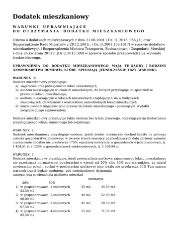 Dodatek mieszkaniowy WARUNKI UPRAWNIAJĄCE DO OTRZYMANIA DODATKU MIESZKANIOWEGO Ustawa o dodatkach mieszkaniowych z dnia 21.06.2001 ( Dz. U. 2013. 966 j.t.) oraz Rozporządzenie Rady Ministrów z 28.12.2001r. / Dz..U.2001.156.1817) w sprawie dodatków mieszkaniowych i Rozporządzenia Ministra Transportu, Budownictwa i Gospodarki Morskiej z dnia 26 kwietnia 2013 r. (Dz.U.2013.589) w sprawie sposobu przeprowadzania wywiadu środowiskowego. UPRAWNIENIA DO DODATKU MIESZKANIOWEGO MAJĄ TE OSOBY, I RODZINY /GOSPODARSTWA DOMOWE/, KTÓRE SPEŁNIAJĄ JEDNOCZEŚNIE TRZY WARUNKI. WARUNEK 1: Dodatek mieszkaniowy przysługuje: a/ najemcom oraz podnajemcom lokali mieszkalnych, b/ osobom mieszkającym w lokalach mieszkalnych, do których przysługuje im spółdzielcze prawo do lokalu mieszkalnego, c/ osobom mieszkającym w lokalach mieszkalnych znajdujących się w budynkach stanowiących ich własność i właścicielom samodzielnych lokali mieszkalnych, d/ innym osobom mającymi tytuł prawny do lokalu mieszkalnego i ponoszącym wydatki związane z jego zajmowaniem. Dodatek mieszkaniowy przysługuje także osobom bez tytułu prawnego, oczekującym na dostarczenie przysługującego lokalu zamiennego lub socjalnego. WARUNEK 2: Dodatek mieszkaniowy przysługuje osobom, jeżeli średni miesięczny dochód brutto na jednego członka gospodarstwa domowego w okresie trzech miesięcy poprzedzających datę złożenia wniosku o przyznanie dodatku nie przekracza 175% najniższej emerytury w gospodarstwie jednoosobowym, tj. 1 454,51 zł. i 125% w gospodarstwach wieloosobowych, tj. 1 038,94 zł.. WARUNEK 3: Dodatek mieszkaniowy przysługuje, jeżeli powierzchnia użytkowa zajmowanego lokalu mieszkalnego nie przekracza normatywnej powierzchni o więcej niż 30% albo 50% pod warunkiem, że udział powierzchni pokoi i kuchni w powierzchni użytkowej tego lokalu nie przekracza 60% Tym samym warunek trzeci będzie spełniony, gdy wnioskodawcy dysponują następu-jącą powierzchnią użytkową mieszkań normatyw 30% 50% 1/ w gospodarstwach 1-osobowych 35 m2 45,50 m2 52,50 m2 2/ w gospodarstwach 2-osobowych 40 m2 52,00 m2 60,00 m2 3/ w gospodarstwach 3-osobowych 45 m2 58,50 m2 67,50 m2 4/ w gospodarstwach 4-osobowych 55 m2 71,50 m2 82,50 m2 5/ w gospodarstwach 5-osobowych 65 m2 84,50 m2 97,50 m2 6/ w gospodarstwach 6-osobowych 70 m2 91,00 m2 110,50 m2 …7/ w gospodarstwach 7 osobowych 75 m2 97,50 m2 117,00 m2 Osoba, która posiada tytuł prawny do lokalu mieszkalnego i ma zaległości w opłatach za mieszkanie, a zaległości te powstały przed otrzymaniem dodatku mieszkaniowego może ubiegać się o przyznanie dodatku mieszkaniowego. W wypadku stwierdzenia, że osoba, której przyznano dodatek mieszkaniowy nie opłaca na bieżąco należności za zajmowany lokal mieszkalny przez okres pełnych 2 miesięcy, wstrzymuje się wypłatę dodatku mieszkaniowego. Jeżeli uregulowanie zaległości nie nastąpi w ciągu 3 miesięcy od daty wstrzymania, decyzja o przyznaniu dodatku mieszkaniowego wygasa. Po uregulowaniu na-leżności w wyznaczonym wyżej terminie wypłaca się dodatek mieszkaniowy za okres, w którym był wstrzymany. Osoba, której z powodu nieuregulowania należności za zajmowany lokal mieszkalny wygasła decyzja o przyznaniu dodatku mieszkaniowego, może wystąpić ponownie o jego przyznanie po uregulowaniu zaległości powstałych w okresie obowiązywania tej decyzji. Normatywną powierzchnię powierzchnie powiększa się o 15 m2, jeżeli w lokalu zamieszkuje osoba niepełnosprawna poruszająca się na wózku lub osoba niepełnosprawna, jeżeli niepełnosprawność wymaga zamieszkiwania w oddzielnym pokoju. Właściciel domu jednorodzinnego może ubiegać się o dodatek mieszkaniowy na tych samych warunkach dotyczących powierzchni użytkowej jak i osoby, które mieszkają w budynkach wielorodzinnych. Właściciel domu jednorodzinnego jest obowiązany dołączyć do wniosku o dodatek mieszkaniowy dokumenty albo oświadczenie o wielkości powierzchni użytkowej, w tym łącznej powierzchni pokoi i kuchni, oraz o wyposażeniu technicznym domu. Pracownik przeprowadzający wywiad środowiskowy może żądać od wnioskodawcy i innych członków gospodarstwa domowego złożenia oświadczenia o stanie majątkowym, zawierającego dane dotyczące posiadanych ruchomości i nieruchomości oraz zasobów pieniężnych. Można odmówić przyznania dodatku mieszkaniowego, jeżeli w wyniku przeprowadzenia wywiadu środowiskowego ustali się, że występuje rażąca dysproporcja między niskimi dochodami wykazanymi w złożonej deklaracji, a faktycznym stanem mająt-kowym wnioskodawcy. Odmowa złożenia oświadczenia stanowi podstawę do wydania decyzji o odmowie przyznania dodatku mieszkaniowego. NIE PRZYZNAJE SIĘ DODATKU MIESZKANIOWEGO, JEŻELI JEGO KWOTA BYŁABY NIŻSZA NIŻ 2% NAJNIŻSZEJ EMERYTURY, TJ. 16,62 ZŁ. Najniższa emerytura od dnia 1 marca w 2013 r. wynosi - 831,15 zł. Dochód brutto na 1 osobę w rodzinie 125% najniższej emerytury/-1 038,94 zł. Dochód brutto na 1 osobę samotnie mieszkającą 175% najniższej emerytury/ - 1 454,51 zł. Sprawy dodatków mieszkaniowych załatwiane są w Urzędzie Miasta Jelenia Góra Referat Dodatków Mieszkaniowych ul. Ptasia 2/3 pokój nr 9 w godzinach pracy Urzędu Miasta. Telefon (75) 75 46 270