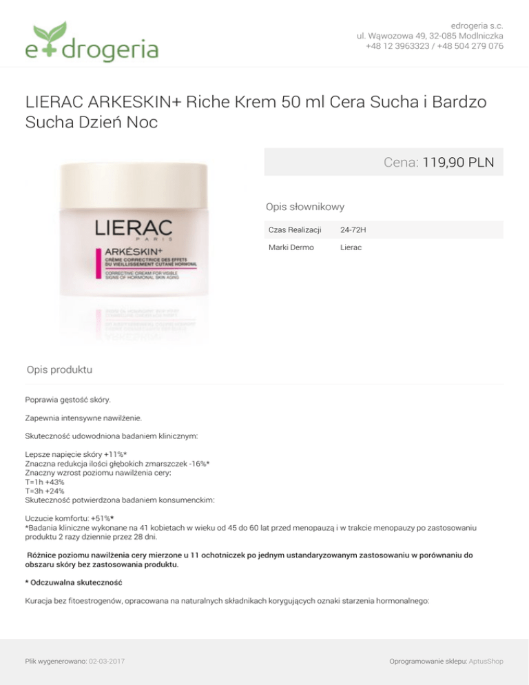 edrogeria s.c. ul. Wąwozowa 49, 32-085 Modlniczka +48 12 3963323 / +48 504 279 076 LIERAC ARKESKIN+ Riche Krem 50 ml Cera Sucha i Bardzo Sucha Dzień Noc Cena: 119,90 PLN Opis słownikowy Czas Realizacji 24-72H Marki Dermo Lierac Opis produktu Poprawia gęstość skóry. Zapewnia intensywne nawilżenie. Skuteczność udowodniona badaniem klinicznym: Lepsze napięcie skóry +11%* Znaczna redukcja ilości głębokich zmarszczek -16%* Znaczny wzrost poziomu nawilżenia cery: T=1h +43% T=3h +24% Skuteczność potwierdzona badaniem konsumenckim: Uczucie komfortu: +51%* *Badania kliniczne wykonane na 41 kobietach w wieku od 45 do 60 lat przed menopauzą i w trakcie menopauzy po zastosowaniu produktu 2 razy dziennie przez 28 dni. Różnice poziomu nawilżenia cery mierzone u 11 ochotniczek po jednym ustandaryzowanym zastosowaniu w porównaniu do obszaru skóry bez zastosowania produktu. * Odczuwalna skuteczność Kuracja bez fitoestrogenów, opracowana na naturalnych składnikach korygujących oznaki starzenia hormonalnego: Plik wygenerowano: 02-03-2017 Oprogramowanie sklepu: AptusShop edrogeria s.c. ul. Wąwozowa 49, 32-085 Modlniczka +48 12 3963323 / +48 504 279 076 CYTONACRE SP 0,5% - aktywny wyciąg z macicy perłowej, który działa wielokierunkowo na komórki skóry. Przywraca ich prawidłowe funkcjonowanie Wyciąg z SEZAMU - odżywia i odbudowuje naturalną warstwę hydrolipidową Wyciąg Z KASZTANA JADALNEGO 0,5% - zwiększa syntezę naturalnych ceramidów w skórze, zapewniając lepsze nawilżenie i odżywienie skóry Składniki NMF(naturalny czynnik nawilżający) 5% - przywracają właściwy poziom nawilżenia i zapobiegają odwodnieniu skóry Plik wygenerowano: 02-03-2017 Powered by TCPDF (www.tcpdf.org) Oprogramowanie sklepu: AptusShop