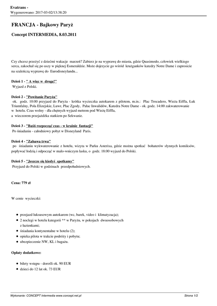 Evatrans Wygenerowano: 2017-03-02/13:38:20 FRANCJA - Bajkowy Paryż Concept INTERMEDIA, 8.03.2011 Czy chcesz przeżyć z dziećmi wakacje marzeń? Zabierz je na wyprawę do miasta, gdzie Quasimodo, człowiek wielkiego serca, zakochał się po uszy w pięknej Esmeraldzie. Może dojrzycie go wśród krużganków katedry Notre Dame i zaprosicie na szaleńczą wyprawę do Eurodisneylandu... Dzień 1 - " A więc w drogę!" Wyjazd z Polski. Dzień 2 - "Powitanie Paryża" ok. godz. 10:00 przyjazd do Paryża - krótka wycieczka autokarem z pilotem, m.in.: Plac Trocadero, Wieża Eiffla, Łuk Triumfalny, Pola Elizejskie, Luwr, Plac Zgody, Pałac Inwalidów, Katedra Notre Dame - ok. godz. 14:00 zakwaterowanie w hotelu. Czas wolny - dla chętnych wyjazd metrem pod Wieżę Eiffla, a wieczorem przejażdżka statkiem po Sekwanie. Dzień 3 - "Baśń rozpocząć czas - w krainie fantazji" Po śniadaniu - całodniowy pobyt w Disneyland Paris. Dzień 4 - "Zabawa trwa" po śniadaniu wykwaterowanie z hotelu, wizyta w Parku Asterixa, gdzie można spotkać bohaterów słynnych komiksów, popływać łodzią i odpocząć w malo-wniczym lasku, o godz. 18:00 wyjazd do Polski. Dzień 5 - "Jeszcze się kiedyś spotkamy" Przyjazd do Polski w godzinach przedpołudniowych. Cena: 779 zł W cenie wycieczki: przejazd luksusowym autokarem (wc, barek, video i klimatyzacja); 2 noclegi w hotelu kategorii ** w Paryżu, w pokojach dwuosobowych z łazienkami; śniadania kontynentalne w hotelu (2); opieka pilota w trakcie podróży i pobytu; ubezpieczenie NW, KL i bagażu. Opłaty dodatkowe: bilety wstępu - dorośli ok. 90 EUR dzieci do 12 lat ok. 73 EUR Wykonanie: CONCEPT Intermedia www.concept.net.pl Strona 1/2 Evatrans Wygenerowano: 2017-03-02/13:38:20 Wykonanie: CONCEPT Intermedia www.concept.net.pl Strona 2/2