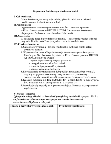 Regulamin Rodzinnego Konkursu Kolęd I. Cel konkursu. Celem konkursu jest integracja rodzin, głównie rodziców z dziećmi i podtrzymanie tradycji śpiewu kolęd. II. Organizator Organizatorem konkursu jest Parafia p.w. Św. Tomasza Apostoła w Ełku i Stowarzyszenie DUC IN ALTUM. Patronat nad konkursem obejmuje ks. Proboszcz kan. Jarosław Dąbrowski. III. Uczestnicy W konkursie mogą brać udział całe rodziny – koniecznie rodzice i dzieci przy min. liczbie osób 2 (w tym jeden rodzic jedno dziecko). IV. Przebieg konkursu 1. Uczestnicy wykonują 1 kolędę (pastorałkę) wybraną z listy kolęd podanych poniżej. 2. Wykonawców oceniać będzie komisja konkursowa powołana przez Parafię p.w. Św. Tomasza Apostoła w Ełku i Stowarzyszenie DUC IN ALTUM., biorąc pod uwagę - wybór odpowiedniej kolędy, pastorałki - zaangażowanie rodziców i dzieci - czystość i poprawność wykonania - ogólne wrażenie artystyczne 3. Dopuszcza się akompaniament lub podkład muzyczny (bez wokalu), nagrany na płytce CD opisanej: imię i nazwisko tytuł kolędy i dostarczony do zakrystii parafii przynajmniej dzień przed konkursem. 4. Konkurs odbędzie się dnia 06.01.2012 r. o godz. 12:00 w kaplicy p.w. Św. Tomasza Ap. w Ełku przy ul. 11 Listopada 28. 5.Przewiduje się nagrody za 3 pierwsze miejsca. Komisja może przyznać wyróżnienia. V. Uwagi końcowe Zgłoszenia należy składać w kancelarii parafialnej do dnia 03 stycznia 2012 r. na formularzu zgłoszeniowym dostępnym na stronie internetowej www..tomasz.elk.pl lub w zakrystii. Imiona i nazwiska występujących osób Tytuł kolędy/pastorałki VI. Spis kolęd do wyboru: 1. Przybieżeli do Betlejem. 2. Dzisiaj w Betlejem. 3. Pójdźmy wszyscy do stajenki. 4. Gdy się Chrystus rodzi. 5. Wśród nocnej ciszy. 6. Cicha noc. 7. Pasterze mili. 8. Jezus malusieńki. 9. Mędrcy świata. 10. Gwiazdo Betlejemska. 11. W żłobie leży. 12. Świeć gwiazdeczko mała. 13. Oj maluśki. 14. Mizerna cicha. 15. Bóg się rodzi. 16. Anioł pasterzom mówił. 17. Hej w dzień narodzenia 18. Ach ubogi żłobie 19. Jezusa narodzonego 20. Maleńka miłość 21. Nie było miejsca dla ciebie 22.Teraz spij dziecino mała 23.Triumfy Króla niebieskiego 24. Zaśnij Dziecino miła 1. Przybieżeli do Betlejem pasterze D D G A 1. Przybieżeli do Betlejem pasterze, D D G A grając skocznie Dzieciąteczku na lirze. D H7 Ref: Chwała na wysokości, e A7 chwała na wysokości, D G A D A D a pokój na ziemi. 2. Oddawali swe ukłony w pokorze Tobie z serca ochotnego, o Boże! Chwała na wysokości... 3. Anioł Pański sam ogłosił te dziwy, Których oni nie słyszeli, jak żywi. Chwała na wysokości... 4. Dziwili się napowietrznej muzyce i myśleli, co to będzie za Dziecię? Chwała na wysokości ... 5. Oto mu się wół i osioł kłaniają, Trzej królowie podarunki oddają. Chwała na wysokości... 6. I anieli gromadą pilnują Panna czysta wraz z Józefem pilnują Chwała na wysokości... 7. Poznali Go Mesjaszem być prawym Narodzonym dzisiaj Panem łaskawym Chwała na wysokości... 8. My go także Bogiem, Zbawcą już znamy I z całego serca wszystko kochamy Chwała na wysokości... 2. Dzisiaj w Betlejem 1. Dzisiaj w Betlejem, dzisiaj w Betlejem wesoła nowina, że Panna czysta, że Panna czysta porodziła Syna. Chrystus się rodzi, nas oswobodzi, Anieli grają, króle witają, pasterze śpiewają, bydlęta klękają, cuda, cuda ogłaszają. 2. Maryja Panna, Maryja Panna Dzieciątko piastuje, i Józef stary, i Józef stary Ono pielęgnuje. Chrystus się rodzi ... 3. Choć w stajeneczce, choć w stajeneczce Panna syna rodzi Przecież On wkrótce, przecież On wkrótce ludzi oswobodzi Chrystus się rodzi ... 4. I Trzej Królowie, i Trzej Królowie od wschodu przybyli I dary Panu, i dary Panu kosztowne złożyli Chrystus się rodzi ... 5. Pójdźmy też i my, pójdźmy też i my przywitać Jezusa Króla na królmi, Króla nad królmi uwielbić Chrystusa Chrystus się rodzi ... 6. Bądźże pochwalon, bądźże pochwalon dziś, nasz wieczny Panie Któyś złożony, któryś złożony na zielonym sianie Chrystus się rodzi ... 7. Bądź pozdrowiony, bądź pozdrowiony Boże nieskończony Wsławimy Ciebie, wsławimy Ciebie, Boże niezmierzony Chrystus się rodzi ... 18. Ach ubogi żłobie 1. Ach ubogi żłobie, Cóż ja widzę w tobie? Droższy widok niż ma niebo, W maleńkiej osobie. 2. Zbawicielu drogi, Jakżeś to ubogi, Opuściłeś śliczne niebo, Obrałeś barłogi 3. Czyżeś nie mógł Sobie, W największej ozdobie, Obrać pałacu drogiego, Nie w tym leżeć żłobie? 4. Gdy na świat przybywasz, Grzechy z niego zmywasz, A na zmycie tej sprośności, Gorzkie łzy wylewasz. 5. Któż tu nie struchleje, wszystek nie zdrętwieje któż Cię widząc płaczącego, łzą się nie zaleje, 6. Na twarz upadamy, czołem uderzamy, witając Cię w tej stajence między bydlętami, 7. Zmiłuj się nad nami, obmyj z grzechów łzami, przyjmij serca te skruszone, które Ci składamy. 19. Jezusa narodzonego D G D A7 D 1. Jezusa narodzonego wszyscy witajmy, D G D A7 D Jemu po kolędzie dary wzajem oddajmy; D G e A oddajmy wesoło, skłaniajmy swe czoło, D h G e A7 D skłaniajmy swe czoło Panu naszemu. 2. Oddajmy za złoto wiarę, czyniąc wyznanie, że to Bóg i Człowiek prawy leży na sianie; oddajmy wesoło... 3. Oddajmy też za kadzidło Panu nadzieję, że Go będziem widzieć w niebie, mówiąc to śmiele; oddajmy wesoło... 4. Oddajmy za mirę miłość na dowód tego, że Go nad wszystko kochamy, z serca całego; oddajmy wesoło... 5. Przyjmij, Jezu, na kolędę te nasze dary, przyjmij serca, dusze nasze za swe ofiary, byśmy kiedyś w niebie, posiąść mogli Ciebie posiąść mogli Ciebie na wieki wieków. 20. Maleńka miłość G h e Do naszych serc do wszystkich serc uśpionych C D G dziś zabrzmiał dzwon już człowiek obudzony G h e bo nadszedł czas i dziecię się zrodziło C D G a razem z nim maleńka przyszła miłośc. G C D REF: Maleńka miłośc w żło
