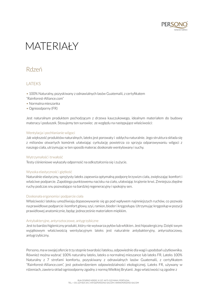 MATERIAŁY Rdzeń LATEKS • 100% Naturalny, pozyskiwany z odnawialnych lasów Guatemalii, z certyfikatem “Rainforest-Alliance.com” • Normalna mieszanka • Ognioodporny (FR) Jest naturalnym produktem pochodzącym z drzewa kauczukowego, idealnym materiałem do budowy materacy i poduszek. Stosujemy ten surowiec ze względu na następujące właściwości: Wentylacja i pochłanianie wilgoci Jak większość produktów naturalnych, lateks jest porowaty i oddycha naturalnie. Jego struktura składa się z milionów otwartych komórek ułatwiając cyrkulację powietrza co sprzyja odparowywaniu wilgoci z naszego ciała, utrzymując w ten sposób materac doskonale wentylowany i suchy. Wytrzymałość i trwałość Testy ciśnieniowe wykazały odporność na odkształcenia się i zużycie. Wysoka elastyczność i giętkość Naturalnie elastyczny, sprężysty lateks zapewnia optymalną podporę krzywizn ciała, zwiększając komfort i właściwe podparcie. Zapobiega punktowemu nacisku na ciało, ułatwiając krążenie krwi. Zmniejsza zbędne ruchy podczas snu pozwalające na bardziej regeneracyjny i spokojny sen. Doskonała ergonomia i podparcie ciała Właściwości lateksu umożliwiają dopasowywanie się go pod wpływem najmniejszych ruchów, co pozwala na prawidłowe podparcie i komfort głowy, szyi, ramion, bioder i kręgosłupa. Utrzymując kręgosłup w pozycji prawidłowej anatomicznie, będąc jednocześnie materiałem miękkim. Antybakteryjne, antyroztoczowe, antygrzybiczne Jest to bardzo higieniczny produkt, który nie wytwarza pyłów lub włókien. Jest hipoalergiczny. Dzięki swym wyjątkowym właściwością wentylacyjnym lateks jest naturalnie antybakteryjny, antyroztoczowy, antygrzybiczny. Persono, ma w swojej ofercie trzy stopnie twardości lateksu, odpowiednie dla wagi i upodobań użytkownika. Również można wybrać 100% naturalny lateks, lateks o normalnej mieszance lub lateks FR. Lateks 100% Naturalny z 7 strefami komfortu, pozyskiwany z odnawialnych lasów Guatemalii, z certyfikatem “Rainforest-Alliance.com”, jest potwierdzeniem odpowiedzialności ekologicznej. Lateks FR, używany w rdzeniach, zawiera skład ognioodporny zgodny z normą Wielkiej Brytanii. Jego właściwości są zgodne z RUA CESÁRIO VERDE, N 137, 4475-522 MAIA | PORTUGAL TEL. + 351 229 864 341 | [email protected] | WWW.PERSONO-SA.COM normą BS 5852, Crib 2. Rdzeń o grubości 12 lub 15 cm z 3 stopniami twardości (po za modelem Tranquility): • Miękki Lateks 100 % Naturalny o gęstości 70 kg/m3 Lateks normalna mieszanka o gęstości 60 kg/m3 Lateks FR o gęstości 74 kg/m3 Zalecane dla użytkowników do 65 kg wagi ciała lub wskaźniku wagi ciała (BMI) mniejszej niż 23, i/ lub stopieniu preferencji twardości materaca miękki. • Regular Lateks 100 % Naturalny o gęstości 80 kg/m3 Lateks normalna mieszanka o gęstości 70 kg/m3 Lateks FR o gęstości 92 kg/m3 Zalecane dla użytkowników między 65 kg a 80 kg wagi ciała lub wskaźniku wagi ciała (BMI) między 23 a 29, i/ lub stopieniu preferencji twardości materaca średnio twardy. • Twardy Lateks 100 % Naturalny o gęstości 90 kg/m3 Lateks normalna mieszanka o gęstości 80 kg/m3 Lateks FR o gęstości 105 kg/m3 Zalecane dla użytkowników powyżej 80 kg wagi ciała lub wskaźniku wagi ciała (BMI) powyżej 29, i/ lub stopieniu preferencji twardości materaca twardy. Rdzeń o grubości 18 cm z 7 strefamii komfortu, dostępny w 2 stopniach twardości, model Tranquility: Stosujemy lateks o grubości 18 cm, z 7 strefami komfortu o różnym stopniu twardości, ułatwiając lepsze ułożenie ciała. W naszej ofercie znajduje się lateks o dwóch stopniach twrdości, z rozróżnionymi strefami, odpowiedni do wagi ciała i upodobań użytkownika. • Miękki Lateks 100 % Naturalny o gęstości 80 kg/m3 Lateks normalna mieszanka o gęstości 65 kg/m3 Zalecane dla użytkowników do 75 kg wagi ciała lub wskaźniku wagi ciała (BMI) mniejszej lub równej 25, i/ lub stopieniu preferencji twardości materaca miękki. • Regular Lateks 100 % Naturalny o gęstości 90 kg/m3 Lateks normalna mieszanka o gęstości 70 kg/m3 Zalecane dla użytkowników powyżej 75 kg wagi ciała lub wskaźniku wagi ciała (BMI) wyższej niż 25, , i/ lub stopieniu preferencji twardości materaca średnio twardy. RUA CESÁRIO VERDE, N 137, 4475-522 MAIA | PORTUGAL TEL. + 351 229 864 341 | [email protected] | WWW.PERSONO-SA.COM SPRĘŻYNY KIESZENIOWE Sprężyny kieszeniowe są podstawowym składnikiem modelu Tenderness. Jest to system sprężyn, wykonanych z hartowanej stali, o kształcie cylindrycznym, opakowanych pojedynczo w tkaninę o dużej wytrzymałości i zgrzewanych za pomocą ultradźwięków. Sprężyny o wysokości około 14 cm są uzupełnione przez struktury poliuretanowe dając wysokość rdzenia około 17 cm. Sprężyny kieszeniowe różnią się od tradycyjnych wysokim stopniem higieny i komfortu. Jedną z dodatkowych zalet jest ich niezależne funkcjonowanie zapewniając w ten sposób odpowiednie podparcie dla ciała i wysoką stabilności. Są najnowszym osiągnięciem, „ultra-higieniczne materace sprężynowe” są dostępne w trzech stopniach twardości, odpowiednich do wagi ciała i upodobań użytkownika. • Miękki Stal sprężyn o grubości 1,8 mm, ułożonych wzdłuż– 250 sprężyn/m2. Zalecane dla użytkowników do 65 kg wagi ciała lub wskaźniku wagi ciała (BMI) mniejszym niż 23, i/ lub stopieniu preferencji twardości materaca miękki; • Regular Stal sprężyn o grubości 1,8 mm, ułożonych w sposób bardziej skoncentrowany, powodując wyższy stopień twardości– 270 sprężyn/m 2. Zalecane dla użytkowników między 65 kg a 80 kg wagi ciała lub wskaźniku wagi ciała (BMI) między 23 a 29, i/ lub stopieniu preferencji twardości materaca średnio twardy. • Twardy Stal sprężyn o grubości 2,0 mm ułożonych w sposób bardziej skoncentrowany, powodując wyższy stopień twardości – 270 sprężyn/m2; Zalecane dla u