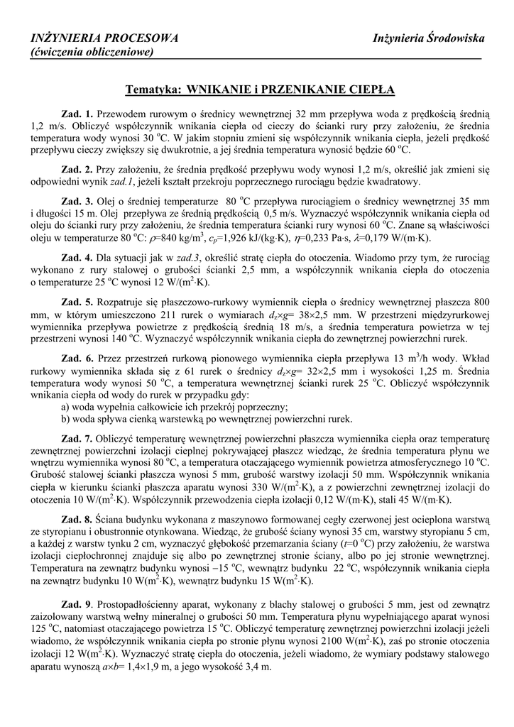 INĩYNIERIA PROCESOWA (üwiczenia obliczeniowe) InĪynieria ĝrodowiska Tematyka: WNIKANIE i PRZENIKANIE CIEPàA Zad. 1. Przewodem rurowym o Ğrednicy wewnĊtrznej 32 mm przepáywa woda z prĊdkoĞcią Ğrednią 1,2 m/s. Obliczyü wspóáczynnik wnikania ciepáa od cieczy do Ğcianki rury przy zaáoĪeniu, Īe Ğrednia temperatura wody wynosi 30 oC. W jakim stopniu zmieni siĊ wspóáczynnik wnikania ciepáa, jeĪeli prĊdkoĞü przepáywu cieczy zwiĊkszy siĊ dwukrotnie, a jej Ğrednia temperatura wynosiü bĊdzie 60 oC. Zad. 2. Przy zaáoĪeniu, Īe Ğrednia prĊdkoĞü przepáywu wody wynosi 1,2 m/s, okreĞliü jak zmieni siĊ odpowiedni wynik zad.1, jeĪeli ksztaát przekroju poprzecznego rurociągu bĊdzie kwadratowy. Zad. 3. Olej o Ğredniej temperaturze 80 oC przepáywa rurociągiem o Ğrednicy wewnĊtrznej 35 mm i dáugoĞci 15 m. Olej przepáywa ze Ğrednią prĊdkoĞcią 0,5 m/s. Wyznaczyü wspóáczynnik wnikania ciepáa od oleju do Ğcianki rury przy zaáoĪeniu, Īe Ğrednia temperatura Ğcianki rury wynosi 60 oC. Znane są wáaĞciwoĞci oleju w temperaturze 80 oC: U=840 kg/m3, cp=1,926 kJ/(kgK), K=0,233 Pas, O=0,179 W/(mK). Zad. 4. Dla sytuacji jak w zad.3, okreĞliü stratĊ ciepáa do otoczenia. Wiadomo przy tym, Īe rurociąg wykonano z rury stalowej o gruboĞci Ğcianki 2,5 mm, a wspóáczynnik wnikania ciepáa do otoczenia o temperaturze 25 oC wynosi 12 W/(m2K). Zad. 5. Rozpatruje siĊ páaszczowo-rurkowy wymiennik ciepáa o Ğrednicy wewnĊtrznej páaszcza 800 mm, w którym umieszczono 211 rurek o wymiarach dzug= 38u2,5 mm. W przestrzeni miĊdzyrurkowej wymiennika przepáywa powietrze z prĊdkoĞcią Ğrednią 18 m/s, a Ğrednia temperatura powietrza w tej przestrzeni wynosi 140 oC. Wyznaczyü wspóáczynnik wnikania ciepáa do zewnĊtrznej powierzchni rurek. Zad. 6. Przez przestrzeĔ rurkową pionowego wymiennika ciepáa przepáywa 13 m3/h wody. Wkáad rurkowy wymiennika skáada siĊ z 61 rurek o Ğrednicy dzug= 32u2,5 mm i wysokoĞci 1,25 m. ĝrednia temperatura wody wynosi 50 oC, a temperatura wewnĊtrznej Ğcianki rurek 25 oC. Obliczyü wspóáczynnik wnikania ciepáa od wody do rurek w przypadku gdy: a) woda wypeánia caákowicie ich przekrój poprzeczny; b) woda spáywa cienką warstewką po wewnĊtrznej powierzchni rurek. Zad. 7. Obliczyü temperaturĊ wewnĊtrznej powierzchni páaszcza wymiennika ciepáa oraz temperaturĊ zewnĊtrznej powierzchni izolacji cieplnej pokrywającej páaszcz wiedząc, Īe Ğrednia temperatura páynu we wnĊtrzu wymiennika wynosi 80 oC, a temperatura otaczającego wymiennik powietrza atmosferycznego 10 oC. GruboĞü stalowej Ğcianki páaszcza wynosi 5 mm, gruboĞü warstwy izolacji 50 mm. Wspóáczynnik wnikania ciepáa w kierunku Ğcianki páaszcza aparatu wynosi 330 W/(m2K), a z powierzchni zewnĊtrznej izolacji do otoczenia 10 W/(m2K). Wspóáczynnik przewodzenia ciepáa izolacji 0,12 W/(mK), stali 45 W/(mK). Zad. 8. ĝciana budynku wykonana z maszynowo formowanej cegáy czerwonej jest ocieplona warstwą ze styropianu i obustronnie otynkowana. Wiedząc, Īe gruboĞü Ğciany wynosi 35 cm, warstwy styropianu 5 cm, a kaĪdej z warstw tynku 2 cm, wyznaczyü gáĊbokoĞü przemarzania Ğciany (t=0 oC) przy zaáoĪeniu, Īe warstwa izolacji ciepáochronnej znajduje siĊ albo po zewnĊtrznej stronie Ğciany, albo po jej stronie wewnĊtrznej. Temperatura na zewnątrz budynku wynosi 15 oC, wewnątrz budynku 22 oC, wspóáczynnik wnikania ciepáa na zewnątrz budynku 10 W(m2K), wewnątrz budynku 15 W(m2K). Zad. 9. ProstopadáoĞcienny aparat, wykonany z blachy stalowej o gruboĞci 5 mm, jest od zewnątrz zaizolowany warstwą weány mineralnej o gruboĞci 50 mm. Temperatura páynu wypeániającego aparat wynosi 125 oC, natomiast otaczającego powietrza 15 oC. Obliczyü temperaturĊ zewnĊtrznej powierzchni izolacji jeĪeli wiadomo, Īe wspóáczynnik wnikania ciepáa po stronie páynu wynosi 2100 W(m2K), zaĞ po stronie otoczenia izolacji 12 W(m2K). Wyznaczyü stratĊ ciepáa do otoczenia, jeĪeli wiadomo, Īe wymiary podstawy stalowego aparatu wynoszą aub= 1,4u1,9 m, a jego wysokoĞü 3,4 m.