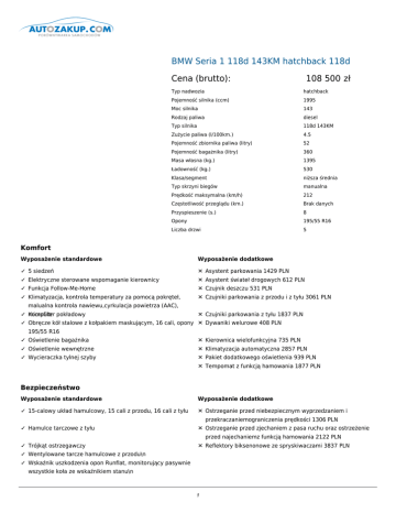 BMW Seria 1 118d 143KM hatchback 118d Cena (brutto): 108 500 zł Typ nadwozia hatchback Pojemność silnika (ccm) 1995 Moc silnika 143 Rodzaj paliwa diesel Typ silnika 118d 143KM Zużycie paliwa (l/100km.) 4.5 Pojemność zbiornika paliwa (litry) 52 Pojemność bagażnika (litry) 360 Masa własna (kg.) 1395 Ładowność (kg.) 530 Klasa/segment niższa średnia Typ skrzyni biegów manualna Prędkość maksymalna (km/h) 212 Częstotliwość przeglądu (km.) Brak danych Przyspieszenie (s.) 8 Opony 195/55 R16 Liczba drzwi 5 Komfort Wyposażenie standardowe Wyposażenie dodatkowe ✓ 5 siedzeń ✕ Asystent parkowania 1429 PLN ✓ Elektryczne sterowane wspomaganie kierownicy ✕ Asystent świateł drogowych 612 PLN ✓ Funkcja Follow-Me-Home ✕ Czujnik deszczu 531 PLN ✓ Klimatyzacja, kontrola temperatury za pomocą pokręteł, ✕ Czujniki parkowania z przodu i z tyłu 3061 PLN malualna kontrola nawiewu,cyrkulacja powietrza (AAC), ✓ Komputer microfiltr pokładowy ✕ Czujniki parkowania z tyłu 1837 PLN ✓ Obręcze kół stalowe z kołpakiem maskującym, 16 cali, opony ✕ Dywaniki welurowe 408 PLN 195/55 R16 ✓ Oświetlenie bagażnika ✕ Kierownica wielofunkcyjna 735 PLN ✓ Oświetlenie wewnętrzne ✕ Klimatyzacja automatyczna 2857 PLN ✓ Wycieraczka tylnej szyby ✕ Pakiet dodatkowego oświetlenia 939 PLN ✕ Tempomat z funkcją hamowania 1877 PLN Bezpieczeństwo Wyposażenie standardowe Wyposażenie dodatkowe ✓ 15-calowy układ hamulcowy, 15 cali z przodu, 16 cali z tyłu ✕ Ostrzeganie przed niebezpiecznym wyprzedzaniem i przekraczaniemograniczenia prędkości 1306 PLN ✓ Hamulce tarczowe z tyłu ✕ Ostrzeganie przed zjechaniem z pasa ruchu oraz ostrzeżenie ✓ Trójkąt ostrzegawczy ✕ Reflektory biksenonowe ze spryskiwaczami 3837 PLN przed najechaniemz funkcją hamowania 2122 PLN ✓ Wentylowane tarcze hamulcowe z przodu\n ✓ Wskaźnik uszkodzenia opon Runflat, monitorujący pasywnie wszystkie koła ze wskaźnikiem stanu\n 1 ✓ Wskaźnik zużycia klocka hamulcowego\n Dodatki Wyposażenie standardowe Wyposażenie dodatkowe ✓ 4-cylindrowy silnik wysokoprężny ✕ Adaptacyjne sportowy układ kierowniczy 1837 PLN ✓ 6-biegowa manualna skrzynia biegów ✕ Adaptacyjne zawieszenie M 4490 PLN ✓ Asymetrycznie dzielone i składane oparcie kanapy tylnej ✕ Aktywacja dostępu do Internetu 0 PLN (60:40) z płaską przestrzenią załadunkową pozłożeniu ✓ Białe lampy kierunkowskazów ✕ APPS 1020 PLN ✓ BMW TwinPower Turbo (zawiera system bezpośredniego ✕ Automatyczna skrzynia biegów Steptronic 8775 PLN wtrysku paliwa i turbosprężarkę) ✓ Centralny zamek z dwoma pilotami radiowym ✕ BMW Live 408 PLN zintegrowanymi w kluczyku ✓ Czarne progi drzwiowe z emblematem BMW z przodu ✕ Dodatkowe gniazda 12V 82 PLN ✓ Dynamiczne światła stop ✕ Dostęp komfortowy 1714 PLN ✓ Elektroniczna blokada dyferencjału ✕ Dzielone i składane oparcie kanapy z tyłu 1061 PLN ✓ Elektryczne szyby z przodu i z tyłu ✕ Elektryczna regulacja foteli z pamięcią ustawień 5102 PLN ✓ Filtr cząsteczek stałych ✕ Hak holowniczy ze zdejmowaną kulą 3143 PLN ✓ Funkcja Auto Start Stop ✕ Internet 408 PLN ✓ Funkcja wyłączenia poduszki powietrznej pasażera z przodu ✕ Kamera cofania 1714 PLN ✓ Gniazdo 12V na konsoli centralnej ✕ Kierownica skórzana 775 PLN ✓ Gniazdo AUX-IN w konsoli centralnej ✕ Lakier metalizowany 2694 PLN ✓ Immobilizer (EWS) ✕ Listwy akcentowe aluminium z delikatnym szlifem podłużnym 1347 PLN ✓ Kontrola wysokości świateł mijania ✕ Listwy akcentowe, białe szkło akrylowe, oksydowane srebro, matowe 0 PLN ✓ Lakier niemetalizowany ✕ Listwy akcentowe, Coral Red matowe 0 PLN ✓ Listwy ozdobne satynowo srebrne mat ✕ Listwy akcentowe, czarne błyszczące 0 PLN ✓ Lusterka zewnętrzne regulowane elektrycznie z dodatkowym ✕ Listwy akcentowe, czarne szkło akrylowe 0 PLN wbudowanym kierunkowskazem,asferyczne po stronie kierowcy ✓ Mocowanie fotelików dziecięcych ISOFIX na zewnętrznych ✕ Listwy akcentowe, oksydowane srebro, matowe 0 PLN siedzeniach tylnich ✓ Opony z funkcją jazdy awaryjnej Runflat z czujnikiem ✕ Listwy ozdobne, drewno szlachetne Fineline Stream 1755 uszkodzenia opony ✓ Oświetlenie powitalne PLN ✕ Lusterka zewnętrzne i wewnętrzne przyciemniane automatycznie 2245 PLN ✓ Osłony przeciwsłoneczne z lusterkami do makijażu, ✕ Lusterka zewnętrzne w białym 0 PLN zasuwane u kierowcy i pasażera, uchwyt na bilety, wpołączeniu z 563 ‘Pakiet oświetleniowy’ ✓ Pakiet możliwe dlapodświetlenie niepalących ✕ Lusterka zewnętrzne w kolorze czarnym 0 PLN ✓ Pakiet serwisowy BMW Service Inclusive 5 lat / 100 000 km, ✕ Lusterko wewnętrzne przyciemniane automatycznie 694 PLN pokrywa koszty serwisowania oraz robociznę ✓ Podłokietniki w drzwiach z przodu i z tyłu ✕ Obramowania Shadow Line BMW Individual, na wysoki połysk 1020 PLN ✓ Pojedyncze okrągłe końcówki układu wydechowego, matowy ✕ Obręcze kół ze stopu lekkiego Double-spoke 385 z chrom, o średnicy 55 mm, z lewej strony ogumieniem mieszanym, 18 cali 9387 PLN ✓ 2 Przełącznik właściwości jezdnych wraz z trybem ECO PRO ✕ 3 Obręcze kół ze stopu lekkiego Star-spoke 376, 16 cali 0 PLN 4 ✓ Przycisk Start/Stop, z przyciskiem MSA OFF ✕ Obręcze kół ze stopu lekkiego Star-spoke 377, 16 cali 3061 PLN ✓ Przycisk zamka centralnego ✕ Obręcze kół ze stopu lekkiego Star-spoke 379, 17 cali 3673 PLN ✓ Radio BMW Business CD, moc: 4x25 W, odtwarzanie MP3 ✕ Obręcze kół ze stopu lekkiego Star-spoke 382 z ogumieniem mieszanym, 17 cali 6938 PLN ✓ Ręczna regulacja kolumny kierownicy w pionie i w poziomie ✕ Obręcze kół ze stopu lekkiego Turbine Styling 381, 17 cali 6122 PLN ✓ Reflektory halogenowe, świateł mijania i drogowych ✕ Obręcze kół ze stopu lekkiego V-spoke 378, 16 cali 3061 PLN ✓ Schowki w konsoli środkowej z tyłu, dwa uchwyty na kubki, ✕ Obręcze kół ze stopu lekkiego V-sp