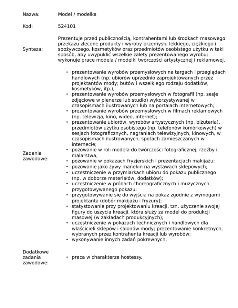 Nazwa: Model / modelka Kod: 524101 Synteza: Prezentuje przed publicznością, kontrahentami lub środkach masowego przekazu zlecone produkty i wyroby przemysłu lekkiego, ciężkiego i spożywczego, kosmetyków oraz przedmiotów osobistego użytku w taki sposób, aby uwypuklić wszelkie zalety prezentowanego wyrobu; wykonuje prace modela / modelki twórczości artystycznej i reklamowej. Zadania zawodowe: • prezentowanie wyrobów przemysłowych na targach i przeglądach handlowych (np. ubiorów uprzednio zaprojektowanych przez projektantów mody; butów i wszelkiego rodzaju dodatków, kosmetyków, itp.), • prezentowanie wyrobów przemysłowych w fotografii (np. sesje zdjęciowe w plenerze lub studio) wykorzystywanej w czasopismach ilustrowanych lub na portalach internetowych; • prezentowanie wyrobów przemysłowych w filmach reklamowych (np. telewizja, kino, wideo, internet); • prezentowanie ubiorów, wyrobów artystycznych (np. biżuteria), przedmiotów użytku osobistego (np. telefonów komórkowych) w sesjach fotograficznych, nagraniach telewizyjnych, kinowych, w czasopismach ilustrowanych, spotach zamieszczanych w internecie; • pozowanie w roli modela do twórczości fotograficznej, rzeźby i malarstwa; • pozowanie w pokazach fryzjerskich i prezentacjach makijażu; • pozowanie jako żywy manekin na wystawach sklepowych; • uczestniczenie w przymiarkach ubioru do pokazu publicznego (np. w doborze materiałów, dodatków); • uczestniczenie w próbach choreograficznych i muzycznych przygotowywanego pokazu; • przygotowywanie się do wyjścia na pokaz zgodnie z wymogami projektanta (dobór makijażu i fryzury); • statystowanie przy projektowaniu kreacji, tzn. użyczenie swojej figury do uszycia kreacji, która służy za model do produkcji masowej (w zakładach produkcyjnych); • uczestniczenie w pokazach technicznych i handlowych dla właścicieli sklepów i salonów mody; prezentowanie konkretnych, wybranych przez kontrahenta kreacji lub wyrobów; • wykonywanie innych zadań pokrewnych. Dodatkowe zadania zawodowe: • praca w charakterze hostessy.