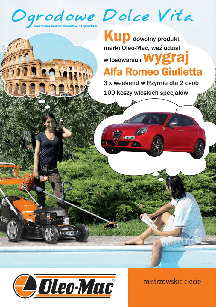 mistrzowskie cięcie Sparta 250TR G 44 PK Poręczny, lekki trymer spalinowy Niewielka, zwrotna kosiarka do średniej wielkości trawnika Wyposażenie: głowica żyłkowa Tap’n go o średnicy 105 mm Pojemność silnika: 25,4 cm3 Moc silnika: 1,2 KM - 0,9 kW Średnica osłony wału: 22 mm Waga: 4,5 kg Pojemność silnika: 140 cm3 Silnik górnozaworowy OHV Emak K500 Kosz: 60 l Wysokość cięcia: od 28 do 75 mm Waga: 23,7 kg SUPER CENA cena 799 zł 549 zł G 53 TK Allroad 4 Sparta 380T Nowoczesna, wielofunkcyjna kosiarka 4w1 z napędem i dużymi kołami. Do koszenia trawników o powierzchni do 2000m2 Mocna kosa wyposażona w tłok z dwoma pierścieniami, kuty wał korbowy i korbowód Wyposażenie: głowica żyłkowa Tap’n go o średnicy 130 mm, tarcza 3-zębna 255 mm, podwójne pasy nośne Pojemność silnika: 36,3 cm3 Moc silnika: 2,0 KM - 1,5 kW Średnica osłony wału: 28 mm Waga: 7,3 kg Pojemność silnika: 196 cm3 Silnik górnozaworowy OHV Emak K800 Funkcje: zbieranie do kosza, mielenie, boczny wyrzut, napęd Kosz: 70 l Wysokość cięcia: od 28 do 75 mm SUPER CENA 1 280 zł Ogrodowe Dolce Vita O Waga: 33,8 kg cena 1 699 zł Ogrodowe Dolce Vita GS 350 Praktyczna i prosta w obsłudze pilarka spalinowa Pojemność silnika: 38,9 cm3 Moc silnika: 2,2 KM - 1,6 kW Prowadnica: 35 cm Łańcuch: 3/8”x.050” Waga: 4,4 kg SUPER CENA 699 zł OM 92S/13H Solidny traktorek ogrodowy Żeliwna belka przednia Przekładania hydrostatyczna Sprzęgło elektromagnetyczne (dwa przeciwbieżne noże) Silnik: B&S Powerbulit 344cm3 13,5 KM Wysokość cięcia: 20-80 mm Kosz: 300 l Koła: 15 x 6 przód / 18 x 8,5 tył Sygnał dźwiękowy informujący o wypełnieniu kosza Tylni zaczep adres Twojego dealera: cena 9 990 zł Szczegóły loterii OGRODOWE DOLCE VITA określa Regulamin dostępny w punktach sprzedaży produktów marki Oleo-Mac oraz na stronie www.victus.pl VICTUS-EMAK Sp. z o.o. ul. Karpia 37, 61-619 Poznań, tel.: 61 823 83 69, fax: 61 820 51 39, [email protected] www.oleomac.pl