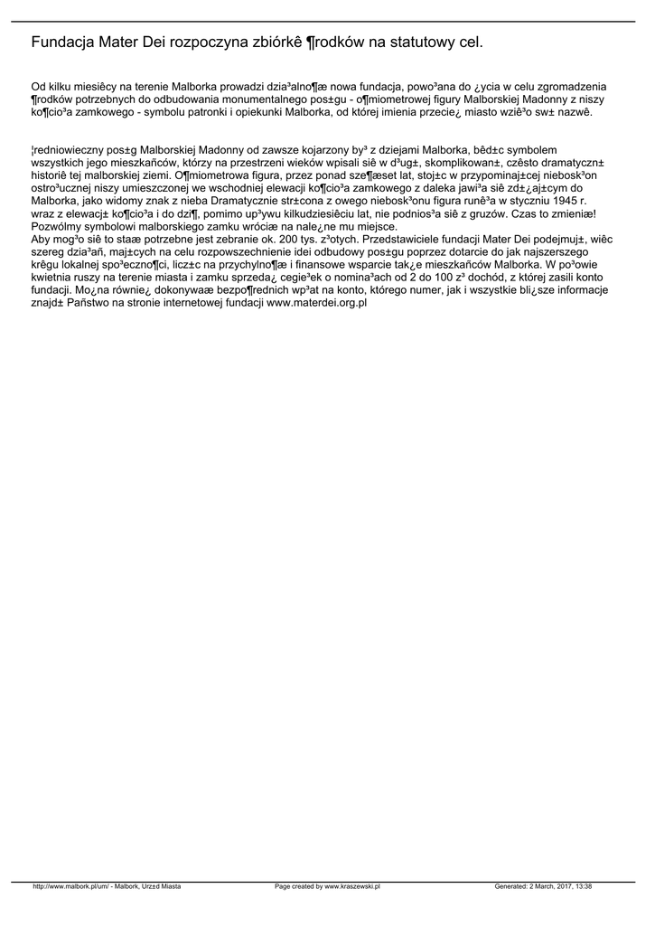 Fundacja Mater Dei rozpoczyna zbiórkê ¶rodków na statutowy cel. Od kilku miesiêcy na terenie Malborka prowadzi dzia³alno¶æ nowa fundacja, powo³ana do ¿ycia w celu zgromadzenia ¶rodków potrzebnych do odbudowania monumentalnego pos±gu - o¶miometrowej figury Malborskiej Madonny z niszy ko¶cio³a zamkowego - symbolu patronki i opiekunki Malborka, od której imienia przecie¿ miasto wziê³o sw± nazwê. ¦redniowieczny pos±g Malborskiej Madonny od zawsze kojarzony by³ z dziejami Malborka, bêd±c symbolem wszystkich jego mieszkañców, którzy na przestrzeni wieków wpisali siê w d³ug±, skomplikowan±, czêsto dramatyczn± historiê tej malborskiej ziemi. O¶miometrowa figura, przez ponad sze¶æset lat, stoj±c w przypominaj±cej niebosk³on ostro³ucznej niszy umieszczonej we wschodniej elewacji ko¶cio³a zamkowego z daleka jawi³a siê zd±¿aj±cym do Malborka, jako widomy znak z nieba Dramatycznie str±cona z owego niebosk³onu figura runê³a w styczniu 1945 r. wraz z elewacj± ko¶cio³a i do dzi¶, pomimo up³ywu kilkudziesiêciu lat, nie podnios³a siê z gruzów. Czas to zmieniæ! Pozwólmy symbolowi malborskiego zamku wróciæ na nale¿ne mu miejsce. Aby mog³o siê to staæ potrzebne jest zebranie ok. 200 tys. z³otych. Przedstawiciele fundacji Mater Dei podejmuj±, wiêc szereg dzia³añ, maj±cych na celu rozpowszechnienie idei odbudowy pos±gu poprzez dotarcie do jak najszerszego krêgu lokalnej spo³eczno¶ci, licz±c na przychylno¶æ i finansowe wsparcie tak¿e mieszkañców Malborka. W po³owie kwietnia ruszy na terenie miasta i zamku sprzeda¿ cegie³ek o nomina³ach od 2 do 100 z³ dochód, z której zasili konto fundacji. Mo¿na równie¿ dokonywaæ bezpo¶rednich wp³at na konto, którego numer, jak i wszystkie bli¿sze informacje znajd± Pañstwo na stronie internetowej fundacji www.materdei.org.pl http://www.malbork.pl/um/ - Malbork, Urz±d Miasta Page created by www.kraszewski.pl Generated: 2 March, 2017, 13:38