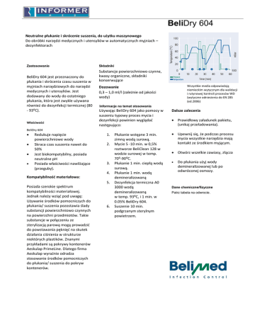 BeliDry 604 Neutralne płukanie i skrócenie suszenia, do użytku maszynowego Do obróbki narzędzi medycznych i utensyliów w automatycznych myjniach – dezynfektorach Zastosowanie BeliDry 604 jest przeznaczony do płukania i skrócenia czasu suszenia w myjniach narzędziowych do narzędzi medycznych i utensyliów. Jest dodawany do wody do ostatniego płukania, która jest zwykle używana również do dezynfekcji termicznej (80 - 93⁰C). Właściwości Składniki Substancje powierzchniowo czynne, kwasy organiczne, składniki konserwujące Informacje na temat stosowania Używając BeliDry 604 jako pomocy w suszeniu typowy proces mycia i dezynfekcji powinien wyglądać następująco: BeliDry 604 Redukuje napięcie powierzchniowe wody Skraca czas suszenia nawet do 50% Jest biokompatybilny, posiada neutralne pH Posiada właściwości nawilżające (przeguby). 1. 2. 3. 4. Kompatybilność materiałowa: 5. Posiada szerokie spektrum kompatybilności materiałowej. Jednak należy wziąć pod uwagę: Używanie środków pomocniczych do płukania/ suszenia pozostawia ślady substancji powierzchniowo czynnych na powierzchni przedmiotów. Takie substancje w połączeniu ze sterylizacją parową mogą prowadzić do powstawania pęknięć na skutek działania ciśnienia w strukturze niektórych plastików. Znanymi przykładami są pokrywy kontenerów Aeskulap PrimeLine. Dlatego firma Aeskulap wyraźnie odradza stosowanie środków pomocniczych do płukania/ suszenia do pokryw kontenerów. Wszystkie media odpowiadają niemieckim wytycznym dla walidacji i rutynowej kontroli procesów WD (wytyczne odniesienia do EN 285 (ed.2006) Dozowanie 0,3 – 1,0 ml/l (zależnie od jakości wody) 6. Płukanie wstępne 3 min. zimną wodą surową. Mycie 5 -10 min. w 0,5% roztworze BeliClean 128 w wodzie surowej w temp. 70⁰-90⁰C. Płukanie 1 min. ciepłą wodą surową. Płukanie 1 min. wodą demineralizowaną Dezynfekcja termiczna A0 3000 wodą demineralizowaną w temp. 93⁰C, i 1 min. w 0.05% BeliDry 604. Suszenie 10 min. podgrzanym sterylnym powietrzem. Dalsze zalecenia Prawidłowy załadunek pakietu, (unikaj przeładowania). Upewnij się, że podczas procesu mycia wszystkie narzędzia mają kontakt ze środkiem myjącym. Otwórz wszelkie zawiasy, złącza Do płukania użyj wody demineralizowanej lub po odwróconej osmozy. Dane chemiczne/fizyczne Patrz tabela na odwrocie. Dodatkowe informacje: Informacje dotycząc bezpieczeństwa pracy, przechowywania, usuwania odpadów znajdują się w karcie charakterystyki substancji niebezpiecznej. Proszę skorzystać z naszego know – how! Proszę się z nami skontaktować, aby zastosować nasze produkty do Państwa specyficznych zastosowań. Dostępność: Proszę o kontakt z firmą: INFORMER MED Sp. z o.o. ul. Winogrady 118 61-626 Poznań Tel. 61 66 43 850 Fax 61 66 43 855 Email: [email protected] Wszystkie informacje oparte są na naszej aktualnej wiedzy i nie stanowią prawnie wiążącego zapewnienia o określonych właściwościach produktu. Dane fizyko- chemiczne: pH 1% roztwór w wodzie demineralizowanej Gęstość koncentrat Wygląd koncentrat Około 7,9 1.0 g/ml Przezroczysty, bezbarwny do lekko zółtego Wszystkie informacje oparte są na naszej aktualnej wiedzy i nie stanowią prawnie wiążącego zapewnienia o określonych właściwościach produktu. Rozwiązania systemowe dla mycia, dezynfekcji i sterylizacji w opiece zdrowotnej i laboratoriach farmaceutycznych Autoryzowany dystrybutor firmy BELIMED: Informer Med Sp. z o.o., ul. Winogrady 118, 61-626 Poznań, tel. 61 66 43 850, fax. 61 66 43 855 Email: [email protected], www.informer-med.com.pl