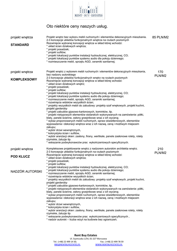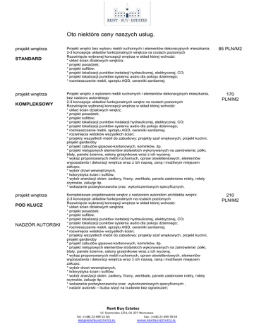 Oto niektóre ceny naszych usług. projekt wnętrza STANDARD projekt wnętrza KOMPLEKSOWY projekt wnętrza POD KLUCZ NADZÓR AUTORSKI Projekt wnętrz bez wyboru mebli ruchomych i elementów dekoracyjnych mieszkania. 2-3 koncepcje układów funkcjonalnych wnętrza na rzutach poziomych Rozwinięcie wybranej koncepcji wnętrza w skład której wchodzi: * układ ścian działowych wnętrza; * projekt posadzek; * projekt sufitów; * projekt lokalizacji punktów instalacji hydraulicznej, elektrycznej, CO; * projekt lokalizacji punktów systemu audio dla pokoju dziennego; * rozmieszczenie mebli, sprzętu AGD, ceramiki sanitarnej; 85 PLN/M2 Projekt wnętrz z wyborem mebli ruchomych i elementów dekoracyjnych mieszkania, bez nadzoru autorskiego 2-3 koncepcje układów funkcjonalnych wnętrz na rzutach poziomych Rozwinięcie wybranej koncepcji wnętrza w skład której wchodzi: * układ ścian działowych wnętrz; * projekt posadzek; * projekt sufitów; * projekt lokalizacji punktów instalacji hydraulicznej, elektrycznej, CO; * projekt lokalizacji punktów systemu audio dla pokoju dziennego; * rozmieszczenie mebli, sprzętu AGD, ceramiki sanitarnej; * rozwinięcia widoków wszystkich ścian; * projekty wszystkich mebli do zabudowy: projekty szaf wnękowych, projekt kuchni, projekt garderoby * projekt zabudów gipsowo-kartonowych, kominków, itp. * projekt nietypowych elementów stolarskich wykonywanych na zamówienie: półki, blaty, panele ścienne, osłony grzejnikowe wraz z ich wyceną; * wykaz proponowanych mebli ruchomych, opraw oświetleniowych, elementów wyposażenia i dekoracji wnętrza wraz z ich nazwą, ceną i możliwym miejscem zakupu; * wybór drzwi wewnętrznych, * kolorystyka ścian i sufitów, * wybór aranżacji okien: zasłony, firany, wertikale, panele zasłonowe rolety, rolety rzymskie, żaluzje itp. * wskazanie podwykonawców prac wykończeniowych specyficznych. 170 PLN/M2 Kompleksowe projektowanie wnętrz z nadzorem autorskim architekta wnętrz. 2-3 koncepcje układów funkcjonalnych na rzutach poziomych Rozwinięcie wybranej koncepcji wnętrza w skład której wchodzi: * układ ścian działowych wnętrza; * projekt posadzek; * projekt sufitów; * projekt lokalizacji punktów instalacji hydraulicznej, elektrycznej, CO; * projekt lokalizacji punktów systemu audio dla pokoju dziennego; * rozmieszczenie mebli, sprzętu AGD, ceramiki sanitarnej; * rozwinięcia widoków wszystkich ścian; * projekty wszystkich mebli do zabudowy: projekty szaf wnękowych, projekt kuchni, projekt garderoby * projekt zabudów gipsowo-kartonowych, kominków, itp. * projekt nietypowych elementów stolarskich wykonywanych na zamówienie: półki, blaty, panele ścienne, osłony grzejnikowe wraz z ich wyceną; * wykaz proponowanych mebli ruchomych, opraw oświetleniowych, elementów wyposażenia i dekoracji wnętrza wraz z ich nazwą, ceną i możliwym miejscem zakupu; * wybór drzwi wewnętrznych, * kolorystyka ścian i sufitów, * wybór aranżacji okien: zasłony, firany, wertikale, panele zasłonowe rolety, rolety rzymskie, żaluzje itp. * wskazanie podwykonawców prac wykończeniowych specyficznych , * nadzór autorski – liczba wizyt na budowie bez ograniczeń; 210 PLN/M2 Rent Buy Estates Ul. Szymczaka 1/54, 01‐227 Warszawa Tel.: (+48) 22 499 14 50; Fax.: (+48) 22 499 78 59 [email protected] WWW.RENTBUYESTATES.PL Cennik robocizny. sprzątanie po remoncie do wprowadzenia 35 PLN/GODZ układanie płytek 75 PLN/M2 malowanie 10 PLN/M2 gładz gipsowa 25 PLN/M2 tynk 25 PLN/M2 wylewki cementowe 25 PLN/M2 wylewki samopoziomujące 20 PLN/M2 skrobanie starych farb 12 PLN/M2 skuwanie płytek 35 PLN/M2 sufity podwieszane g-k 45 PLN/M2 sufity podwieszane Amstrąg 35 PLN/M2 ścianki działowe g-k 65 PLN/M2 punkt elektryczny 50 PLN/SZT montaż gniazdka 10 PLN/SZT montaż lamp żyrandoli 40 PLN/SZT punkt hydrauliczny 150 PLN/SZT montaż stelaża wc 300 PLN/SZT montaż umywalki 120 PLN/SZT montaż wc 120 PLN/SZT montaż wanny 300 PLN/SZT montaż brodzik+kabina 300 PLN/SZT montaż drzwi 170 PLN/SZT demontaż drzwi 80 PLN/SZT układanie paneli 22 PLN/M2 montaż listew 8 PLN/MB Rent Buy Estates Ul. Szymczaka 1/54, 01‐227 Warszawa Tel.: (+48) 22 499 14 50; Fax.: (+48) 22 499 78 59 [email protected] WWW.RENTBUYESTATES.PL