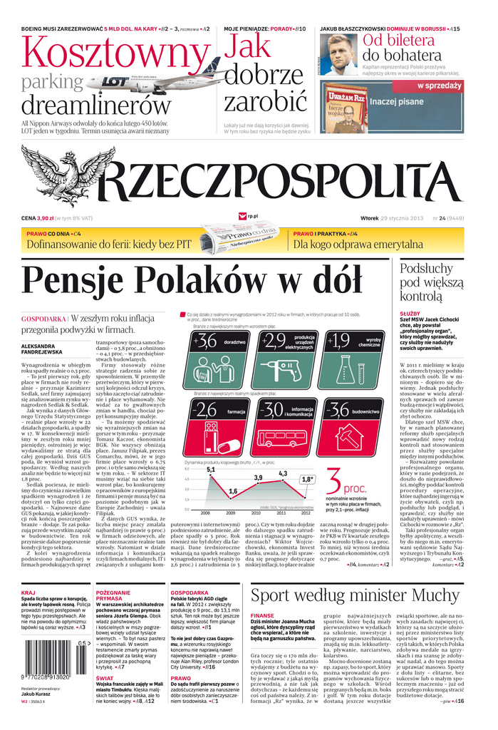 Kosztowny parking MOJE PIENIĄDZE: PORADY>B10 dreamlinerów dobrze zarobić All Nippon Airways odwołały do końca lutego 450 lotów. LOT jeden w tygodniu. Termin usunięcia awarii nieznany Lokaty już nie dają korzyści jak dawniej. W tym roku bez ryzyka nie będzie zysku Jak JAKUB BŁASZCZYKOWSKI DOMINUJE W BORUSSII >A15 Od biletera do bohatera PIOTR NOWAK BOEING MUSI ZAREZERWOWAĆ 5 MLD DOL. NA KARY >B2 – 3, rozmowa >A2 Kapitan reprezentacji Polski przeżywa najlepszy okres w swojej karierze piłkarskiej. ◊ rp.pl CENA 3,90 zł (w tym 8% VAT) PRAWO CO DNIA >C4 Dofinansowanie do ferii: kiedy bez PIT Wtorek 29 stycznia 2013 PRAWO I PRAKTYKA >D4 Dla kogo odprawa emerytalna Pensje Polaków w dół przegoniła podwyżki w firmach. Wynagrodzenia w ubiegłym roku spadły realnie o 0,3 proc. – To jest pierwszy rok, gdy płace w firmach nie rosły realnie – przyznaje Kazimierz Sedlak, szef firmy zajmującej się analizowaniem rynku wynagrodzeń Sedlak & Sedlak. Jak wynika z danych Głównego Urzędu Statystycznego – realnie płace wzrosły w 22 działach gospodarki, a spadły w 17. W konsekwencji mieliśmy w zeszłym roku mniej pieniędzy, ostrożniej je więc wydawaliśmy ze stratą dla całej gospodarki. Dziś GUS poda, ile wyniósł wzrost gospodarczy. Według naszych analiz nie będzie to więcej niż 1,8 proc. Sedlak pociesza, że mieliśmy do czynienia z niewielkim spadkiem wynagrodzeń i że dotyczył on tylko części gospodarki. – Najnowsze dane GUS pokazują, w jakiej kondycji rok kończą poszczególne branże – dodaje. Te zaś pokazują przede wszystkim zapaść w budownictwie. Ten rok przyniesie dalsze pogorszenie kondycji tego sektora. Z kolei wynagrodzenia podniesiono najbardziej w firmach produkujących sprzęt KRAJ Spada liczba spraw o korupcję, ale kwoty łapówek rosną. Policja prowadzi mniej postępowań w tego typu przestępstwach. Ale nie ma powodu do optymizmu: łapówki są coraz wyższe. >A3 transportowy (poza samochodami) – o 3,8 proc., a obniżono – o 4,1 proc. – w przedsiębiorstwach budowlanych. Firmy stosowały różne strategie radzenia sobie ze spowolnieniem. W przemyśle przetwórczym, który w pierwszej kolejności odczuł kryzys, szybko zaczęto ciąć zatrudnienie i płace wyhamowały. Nie widać za to gwałtownych zmian w handlu, chociaż popyt konsumpcyjny maleje. – Tu możemy spodziewać się wyraźniejszych zmian na gorsze w tym roku – przyznaje Tomasz Kaczor, ekonomista BGK. Nie wszyscy obniżają płace. Janusz Filipiak, prezes Comarchu, mówi, że w jego firmie płace wzrosły o 6,75 proc. i o tyle samo zwiększą się w tym roku. – W sektorze IT musimy wziąć na siebie taki wzrost płac, bo konkurujemy o pracowników z europejskimi firmami i pensje muszą być na poziomie podobnym jak w Europie Zachodniej – uważa Filipiak. Z danych GUS wynika, że liczba miejsc pracy zmalała najbardziej (o prawie 9 proc.) w firmach odzieżowych, ale płace nieznacznie realnie tam wzrosły. Natomiast w dziale informacja i komunikacja (czyli firmach medialnych, IT i związanych z usługami kom- POŻEGNANIE PRYMASA W warszawskiej archikatedrze pochowano wczoraj prymasa seniora Józefa Glempa. Obok władz państwowych i kościelnych w mszy pogrzebowej wzięły udział tysiące wiernych. – To był nasz pasterz – wspominali. W swoim testamencie zmarły prymas podziękował za łaskę wiary i przeprosił za pochopną krytykę. >A7 ŚWIAT Redaktor prowadzący: Jakub Kurasz W2 | 35063 X Wojska francuskie zajęły w Mali miasto Timbuktu. Klęska malijskich talibów jest bliska, ale to nie koniec wojny. >A8, A12 Podsłuchy pod większą kontrolą SŁUŻBY Szef MSW Jacek Cichocki chce, aby powstał „profesjonalny organ”, który mógłby sprawdzać, czy służby nie nadużyły swoich uprawnień. GOSPODARKA | W zeszłym roku inflacja ALEKSANDRA FANDREJEWSKA nr 24 (9448) puterowymi i internetowymi) podniesiono zatrudnienie, ale płace spadły o 3 proc. Rok również nie był dobry dla farmacji. Dane średnioroczne wskazują na spadek realnego wynagrodzenia w tej branży (o 2,6 proc.) i zatrudnienia (o 3 GOSPODARKA Polskie fabryki AGD ciągle na fali. W 2012 r. zwiększyły produkcję o 9 proc., do 13,1 mln sztuk. Ten rok może być jeszcze lepszy, większość firm planuje dalszy wzrost. >B1 To nie jest dobry czas Gazpromu, a wizerunku rosyjskiego koncernu nie naprawią nawet największe pieniądze – przekonuje Alan Riley, profesor London City University. >B16 PRAWO Do sądu trafił pierwszy pozew o zadośćuczynienie za naruszenie dóbr osobistych zanieczyszczeniem środowiska. >C1 proc.). Czy w tym roku dojdzie do dalszego spadku zatrudnienia i stagnacji w wynagrodzeniach? Wiktor Wojciechowski, ekonomista Invest Banku, uważa, że jeśli sprawdzą się prognozy dotyczące niskiej inflacji, to płace realnie zaczną rosnąć w drugiej połowie roku. Prognozuje jednak, że PKB w IV kwartale zeszłego roku wzrosło tylko o 0,4 proc. To mniej, niż wynosi średnia oczekiwań ekonomistów, czyli 0,7 proc. >B4, komentarz >A2 W 2011 r. mieliśmy w kraju ok. czterech tysięcy podsłuchiwanych osób. Ile w minionym – dopiero się dowiemy. Jednak podsłuchy stosowane w wielu aferalnych sprawach od zawsze budzą emocje i wątpliwości, czy służby nie zakładają ich zbyt ochoczo. Dlatego szef MSW chce, by w ramach planowanej reformy służb specjalnych wprowadzić nowy rodzaj kontroli nad stosowaniem przez służby specjalne między innymi podsłuchów. – Rozważamy powołanie profesjonalnego organu, który w razie podejrzeń, że doszło do nieprawidłowości, mógłby poddać kontroli procedury operacyjne, które najbardziej ingerują w życie obywateli, czyli np. podsłuchy lub podgląd, i sprawdzić, czy służby nie nadużyły uprawnień – mówi Cichocki w rozmowie z „Rz”. Taki profesjonalny organ byłby apolityczny, a weszliby do niego m.in. emerytowani sędziowie Sądu Najwyższego i Trybunału Konstytucyjnego. —graż, >A5, ko