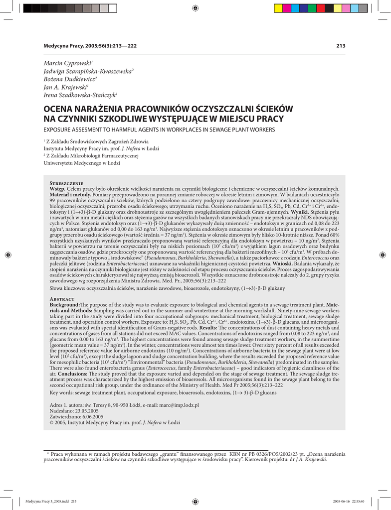 Medycyna Pracy, 2005;56(3):213 — 222 213 Marcin Cyprowski1 Jadwiga Szarapińska-Kwaszewska2 Bożena Dudkiewicz2 Jan A. Krajewski1 Irena Szadkowska-Stańczyk1 OCENA NARAŻENIA PRACOWNIKÓW OCZYSZCZALNI ŚCIEKÓW NA CZYNNIKI SZKODLIWE WYSTĘPUJĄCE W MIEJSCU PRACY EXPOSURE ASSESMENT TO HARMFUL AGENTS IN WORKPLACES IN SEWAGE PLANT WORKERS 1 Z Zakładu Środowiskowych Zagrożeń Zdrowia Instytutu Medycyny Pracy im. prof. J. Nofera w Łodzi 2 Z Zakładu Mikrobiologii Farmaceutycznej Uniwersytetu Medycznego w Łodzi Streszczenie Wstęp. Celem pracy było określenie wielkości narażenia na czynniki biologiczne i chemiczne w oczyszczalni ścieków komunalnych. Materiał i metody. Pomiary przeprowadzono na porannej zmianie roboczej w okresie letnim i zimowym. W badaniach uczestniczyło 99 pracowników oczyszczalni ścieków, których podzielono na cztery podgrupy zawodowe: pracownicy mechanicznej oczyszczalni; biologicznej oczyszczalni; przerobu osadu ściekowego; utrzymania ruchu. Oceniono narażenie na H2S, SO2, Pb, Cd, Cr3+ i Cr6+, endotoksyny i (1→3)-b-D glukany oraz drobnoustroje ze szczególnym uwzględnieniem pałeczek Gram-ujemnych. Wyniki. Stężenia pyłu i zawartych w nim metali ciężkich oraz stężenia gazów na wszystkich badanych stanowiskach pracy nie przekraczały NDS obowiązujących w Polsce. Stężenia endotoksyn oraz (1→3)-b-D glukanów wykazywały dużą zmienność – endotoksyn w granicach od 0,08 do 223 ng/m3, natomiast glukanów od 0,00 do 163 ng/m3. Najwyższe stężenia endotoksyn oznaczono w okresie letnim u pracowników z podgrupy przerobu osadu ściekowego (wartość średnia = 37 ng/m3). Stężenia w okresie zimowym były blisko 10-krotnie niższe. Ponad 60% wszystkich uzyskanych wyników przekraczało proponowaną wartość referencyjną dla endotoksyn w powietrzu – 10 ng/m3. Stężenia bakterii w powietrzu na terenie oczyszczalni były na niskich poziomach (102 cfu/m3) z wyjątkiem lagun osadowych oraz budynku zagęszczania osadów, gdzie przekroczyły one proponowaną wartość referencyjną dla bakterii mezofilnych – 105 cfu/m3. W próbach dominowały bakterie typowo „środowiskowe” (Pseudomonas, Burkholderia, Shewanella), a także paciorkowce z rodzaju Enterococcus oraz pałeczki jelitowe (rodzina Enterobacteriaceae) uznawane za wskaźniki higienicznej czystości powietrza. Wnioski. Badania wykazały, że stopień narażenia na czynniki biologiczne jest różny w zależności od etapu procesu oczyszczania ścieków. Proces zagospodarowywania osadów ściekowych charakteryzował się najwyższą emisją bioaerozoli. Wszystkie oznaczone drobnoustroje należały do 2. grupy ryzyka zawodowego wg rozporządzenia Ministra Zdrowia. Med. Pr., 2005;56(3):213–222 Słowa kluczowe: oczyszczalnia ścieków, narażenie zawodowe, bioaerozole, endotoksyny, (1→3)-β-D glukany Abstract Background:The purpose of the study was to evaluate exposure to biological and chemical agents in a sewage treatment plant. Materials and Methods: Sampling was carried out in the summer and wintertime at the morning workshift. Ninety-nine sewage workers taking part in the study were divided into four occupational subgroups: mechanical treatment, biological treatment, sewage sludge treatment, and operation control workers. Exposure to: H2S, SO2, Pb, Cd, Cr3+, Cr6+, endotoxins, (1→3)-b-D glucans, and microorganisms was evaluated with special identification of Gram-negative rods. Results: The concentrations of dust containing heavy metals and concentrations of gases from all stations did not exceed MAC values. Concentrations of endotoxins ranged from 0.08 to 223 ng/m3, and glucans from 0.00 to 163 ng/m3. The highest concentrations were found among sewage sludge treatment workers, in the summertime (geometric mean value = 37 ng/m3). In the winter, concentrations were almost ten times lower. Over sixty percent of all results exceeded the proposed reference value for airborne endotoxins (10 ng/m3). Concentrations of airborne bacteria in the sewage plant were at low level (102 cfu/m3), except the sludge lagoon and sludge concentration building, where the results exceeded the proposed reference value for mesophilic bacteria (105 cfu/m3) “Environmental” bacteria (Pseudomonas, Burkholderia, Shewanella) predominated in the samples. There were also found enterobacteria genus (Enterococcus, family Enterobacteriaceae) – good indicators of hygienic cleanliness of the air. Conclusions: The study proved that the exposure varied and depended on the stage of sewage treatment. The sewage sludge treatment process was characterized by the highest emission of bioaerosols. All microorganisms found in the sewage plant belong to the second occupational risk group, under the ordinance of the Ministry of Health. Med Pr 2005;56(3):213–222 Key words: sewage treatment plant, occupational exposure, bioaerosols, endotoxins, (1→ 3)-β-D glucans Adres 1. autora: św. Teresy 8, 90-950 Łódź, e-mail: [email protected] Nadesłano: 23.05.2005 Zatwierdzono: 6.06.2005 © 2005, Instytut Medycyny Pracy im. prof. J. Nofera w Łodzi * Praca wykonana w ramach projektu badawczego „grantu” finansowanego przez KBN nr PB 0326/PO5/2002/23 pt. „Ocena narażenia pracowników oczyszczalni ścieków na czynniki szkodliwe występujące w środowisku pracy”. Kierownik projektu: dr J.A. Krajewski. Medycyna Pracy 3_2005.indd 213 2005-06-16 22:55:40 214 M. Cyprowski Nr 3 WSTĘP W ciągu ostatnich dziesięciu lat obserwuje się wzrost zainteresowania problemami narażenia pracowników oczyszczalni ścieków na czynniki biologiczne szkodliwe dla zdrowia, występujące w środowisku pracy. Rozporządzenie Ministra Zdrowia (1) w sprawie szkodliwych czynników biologicznych dla zdrowia w środowisku pracy oraz ochrony zdrowia pracowników zawodowo narażonych na te czynniki, które wciela w życie zapisy Dyrektywy 54/2000 Unii Europejskiej (2) o czynnikach biologicznych w środowisku pracy, dotyczy m.in. tych zagadni
