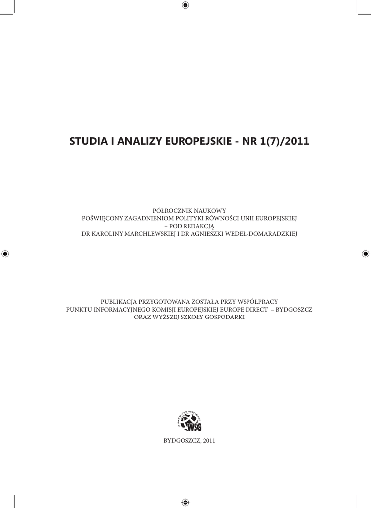 STUDIA I ANALIZY EUROPEJSKIE - NR 1(7)/2011 PÓŁROCZNIK NAUKOWY POŚWIĘCONY ZAGADNIENIOM POLITYKI RÓWNOŚCI UNII EUROPEJSKIEJ – POD REDAKCJĄ DR KAROLINY MARCHLEWSKIEJ I DR AGNIESZKI WEDEŁ-DOMARADZKIEJ PUBLIKACJA PRZYGOTOWANA ZOSTAŁA PRZY WSPÓŁPRACY PUNKTU INFORMACYJNEGO KOMISJI EUROPEJSKIEJ EUROPE DIRECT – BYDGOSZCZ ORAZ WYŻSZEJ SZKOŁY GOSPODARKI BYDGOSZCZ, 2011 RECENZENT TOMU 2(8)/2011 Prof. dr hab. Grażyna Ulicka II RECENZENT TOMU 2(8)/2011 dr hab. Alfred Lutrzykowski, Prof. UMK REDAKCJA NAUKOWA TOMU 2(8)/2011 dr Karolina Marchlewska, dr Agnieszka Wedeł-Domaradzka RADA NAUKOWA „STUDIÓW I ANALIZ EUROPEJSKICH”: Prof. dr hab. Roman Bäcker – Uniwersytet Mikołaja Kopernika Prof. dr hab. Ryszard Borowicz – Uniwersytet Mikołaja Kopernika Prof. dr hab. Zdzisław Mach – Uniwersytet Jagielloński Prof. dr hab. Krystyna Michałowska-Gorywoda – Szkoła Główna Handlowa Prof. dr hab. Andrzej Kaleta – Uniwersytet Mikołaja Kopernika Prof. Aleksander Kozlov – Saint Petersburg State Polytechnical University Prof. dr hab. Wielisława Warzywoda-Kruszyńska – Uniwersytet Łódzki Prof. dr hab. Grażyna Ulicka – Uniwersytet Warszawski Prof. dr hab. Andrzej Szahaj – Uniwersytet Mikołaja Kopernika Prof. dr hab. Zenon Wiśniewski – Uniwersytet Mikołaja Kopernika Prof. dr hab. Ryszard Zięba – Uniwersytet Warszawski Dr hab. Zbigniew Czachór, prof. UAM – Uniwersytet im. Adam Mickiewicza Dr hab. Krzysztof Piątek, prof. UMK – Uniwersytet Mikołaja Kopernika ZESPÓŁ REDAKCYJNY „STUDIÓW I ANALIZ EUROPEJSKICH”: REDAKTOR NACZELNY dr Karolina Marchlewska ZESPÓŁ TEMATYCZNY (REDAKTORZY MERYTORYCZNI) dr Michał Cichoracki, dr Marek Chamot, prof. WSG, dr Karolina Marchlewska, dr Marzena Sobczak-Michałowska, prof. WSG, dr Ilona Urbany-Popiołek, dr Agnieszka Wedeł-Domaradzka SEKRETARZE mgr Marta Tybura, mgr Joanna Wójtowicz REDAKTOR STATYSTYCZNY prof. dr hab. Magdalena Osińska REDAKTORZY JĘZYKOWI dr Małgorzata Zamojska – język polski mgr Joanna Jercha-Malinowska, mgr Agnieszka Wyciechowska – język angielski REDAKCJA TECHNICZNA Adam Kujawa Copyright © by Wydawnictwo Uczelniane Wyższej Szkoły Gospodarki w Bydgoszczy, Bydgoszcz 2011 ISSN 2081-5530 Wydawnictwo Uczelniane Wyższej Szkoły Gospodarki w Bydgoszczy 85-229 Bydgoszcz, ul. Garbary 2 tel. 52 567 00 47, 52 567 00 49 www.wsg.byd.pl, [email protected] EUROPEAN STUDIES AND ANALYSES – NO. 1(7)/2011 SCIENTIFIC SEMI-ANNUAL DEDICATED TO THE ISSUES OF GENDER EQUALITY POLICY IN THE EUROPEAN UNION EDITED BY KAROLINA MARCHLEWSKA, PH.D. AND AGNIESZKA WEDEŁ-DOMERADZKA, PH.D. J PUBLICATION PREPARED BY THE EUROPEAN INFORMATION RELAY EUROPE DIRECT – BYDGOSZCZ IN COOPERATION WITH THE UNIVERSITY OF ECONOMY BYDGOSZCZ, 2011 PEER REVIEWER – VOLUME 1(7)/2011 Prof. dr hab. Grażyna Ulicka SECOND PEER REVIEWER – VOLUME 1(7)/2011 dr hab. Alfred Lutrzykowski, Prof. UMK ACADEMIC EDITING – VOLUME 1(7)/2011 dr Karolina Marchlewska, dr Agnieszka Wedeł-Domaradzka EDITORIAL BOARD OF ”EUROPEAN STUDIES AND ANALYSES”: Prof. dr hab. Roman Bäcker – Nicolaus Copernicus University Prof. dr hab. Ryszard Borowicz – Nicolaus Copernicus University Prof. dr hab. Zdzisław Mach – Jagiellonian University Prof. dr hab. Krystyna Michałowska-Gorywoda – Warsaw School of Economics Prof. dr hab. Andrzej Kaleta – Nicolaus Copernicus University Prof. Aleksander Kozlov – Saint Petersburg State Polytechnical University Prof. dr hab. Wielisława Warzywoda-Kruszyńska – University of Lodz Prof. dr hab. Grażyna Ulicka – University of Warsaw Prof. dr hab. Andrzej Szahaj – Nicolaus Copernicus University Prof. dr hab. Zenon Wiśniewski – Nicolaus Copernicus University Prof. dr hab. Ryszard Zięba – University of Warsaw Dr hab. Zbigniew Czachór, prof. UAM – Adam Mickiewicz University Dr hab. Krzysztof Piątek, prof. UMK – Nicolaus Copernicus University EDITORIAL TEAM OF “EUROPEAN STUDIES AND ANALYSES”: EDITOR-IN -CHIEF Karolina Marchlewska, Ph.D. EDITORIAL TEAM Michał Cichoracki, Ph.D., Marek Chamot, Ph.D., Karolina Marchlewska, Ph.D., Marzena Sobczak-Michałowska, Ph.D., Ilona Urbany-Popiołek Ph.D., Agnieszka Wedeł-Domaradzka, Ph.D. SECRETARIES Marta Tybura, M.Sc., Joanna Wojtowicz, M.Sc. STATISTICAL EDITOR Prof. dr hab. Magdalena Osińska LANGUAGE EDITOR Małgorzata Zamojska, Ph.D. – Polish Joanna Jercha-Malinowska, M.Sc and Agnieszka Wyciechowska, M.A. – English TECHNICAL EDITOR Adam Kujawa Copyright © by Wydawnictwo Uczelniane Wyższej Szkoły Gospodarki w Bydgoszczy, Bydgoszcz 2011 ISSN 2081-5530 SPIS TREŚCI KAROLINA MARCHLEWSKA, AGNIESZKA WEDEŁ-DOMARADZKA .............................................. 9 Wstęp OBSZAR BADAWCZO-NAUKOWY MARIUSZ BURKACKI .................................................................................................................................... 17 Wsparcie Unii Europejskiej w zakresie działań na rzecz równouprawnienia kobiet i mężczyzn JUSTYNA ADRIANNA OŻÓG ...................................................................................................................... 27 Zasada równości pracowników w Unii Europejskiej. Prawa i obowiązki osób korzystających z możliwości swobodnego przemieszczania się między państwami Unii Europejskiej w poszukiwaniu pracy MAREK REWIZORSKI ................................................................................................................................... 45 Prawne aspekty zakazu dyskryminacji na rynku pracy w Unii Europejskiej DAGMARA CHORAŚ ..................................................................................................................................... 57 Prawne gwarancje równości kobiet i mężczyzn na rynku pracy ARLETA TERPIŁOWSKA-DWORCZAK ..................................................................................................... 71 Równość płci w Unii Europejskiej z perspektywy wynagrodzeń kobiet i mężczyzn GRZEGORZ LIBOR ...............
