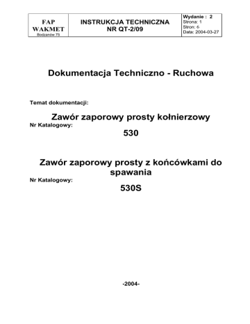 Dokumentacja Techniczno - Ruchowa Zawór zaporowy prosty