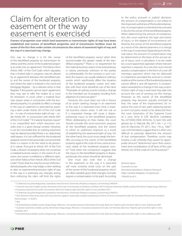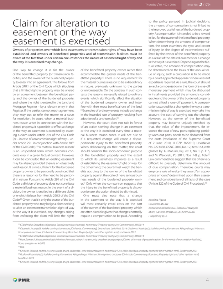 Thursday / 04 / 02 / 2016 Claim for alteration to easement or the way easement is exercised Owners of properties over which land easements or transmission rights of way have been established and owners of benefitted properties and of transmission facilities must be aware of the fact that under certain circumstances the nature of easement/right of way and the way it is exercised may change. One way to change it is for the owner of the benefitted property (or transmission facilities) and the owner of the burdened property to enter into an agreement. This follows from Article 248.1 of the Civil Code which stipulates that a limited right in property may be altered by an agreement between the benefitted party and the owner of the burdened property; and where the right is entered in the Land and Mortgage Register – by a relevant entry in that Register. If the parties cannot reach agreement, they may opt to refer the matter to a court for resolution. In court, when a material business reason arises in connection with the burdened property, it is possible to effect a change in the way an easement is exercised by asserting a claim under Article 291 of the Civil Code (or – in case of a transmission right of way – under Article 291 in conjunction with Article 3054 of the Civil Code).[1] “A material business reason” is an unspecified term which becomes concrete only in a given factual context. However, it can be concluded that an existing easement may be altered provided there is an objectively valid reason. It is not sufficient for the burdened property owner to be personally convinced that there is a reason or for the need to be personal in nature. Pursuant to Article 291 of the Civil Code, a division of property does not constitute a material business reason. In the event of a division, the owner is entitled to a different claim, one which follows from Article 290.3 of the Civil Code.[2] Given that it is only the owner of the burdened properly who may lodge a claim seeking to alter an easement/transmission right of way or the way it is exercised, any changes arising from enforcing the claim will limit the rights of the benefitted property owner rather than accommodate the greater needs of the benefitted property.[3] There is no requirement for the material business reason to be extraordinary in nature, previously unknown to the parties or unforeseeable. On the contrary, in such contexts the reasons are usually related to ordinary events which significantly affect the situation of the burdened property owner and interfere with their most beneficial use of the land. [4] Examples of ordinary events include a change in the intended use of property resulting from adoption of a land-use plan.[5] However, the court does not rule in favour of an action seeking change in an easement or the way it is exercised every time a material business reason arises. It will not rule so if a requested change will cause a disproportionate injury to the benefitted property. When deliberating on that matter, the court should consider the socio-economic purpose of the benefitted property and the extent to which its usefulness improves as a result of establishing the easement/right of way. On the other hand, the court must weigh the benefits accruing to the owner of the benefitted property against the scale of new, serious business needs of the burdened property owner.6] Only when the comparison suggests that the injury to the benefitted property is disproportionate, the action should be dismissed. One must also note that a change in the easement or the way it is exercised will most certainly entail costs on the part of the owner of the burdened property, which are often sizeable given that changes normally require a compensation to be paid. According Issue No. 2 (179) to the policy pursued in judicial decisions, the amount of compensation is not linked to the improved usefulness of the burdened property. A compensation is intended to be a reward in lieu for the owner of the benefitted property. When determining the amount of compensation, the court examines the type and extent of injury, i.e. the degree of inconvenience suffered by the owner of the benefitted property as a result of the altered easement or a change in the way it is exercised. Depending on the factual status, the amount of compensation may be determined on the basis of the annual value of injury; such a calculation is to be made by a court-appointed appraiser where relevant expertise is required. As a rule, the court should award a compensation in the form of a one-off monetary payment which may be disbursed in instalments provided the amount is considerable and the owner of the burdened property cannot afford a one-off payment. A compensation awarded for a change in the way a transmission right of way is exercised may take into account the cost of carrying out the change. However, as the owner of the benefitted property may become unjustly enriched by that, the value of the improvement, for instance the cost of new parts replacing partially worn out parts, needs to be deducted from the costs (resolution of the Supreme Court of 2 June 2010, III CZP 36/2010, LexisNexis No. 2273458, OSNC 2010, No. 12, item 163, with glosses by: G. Matusik, Rej. 2011, No. 1, p. 115, and M. Warcinski, PS 2011, Nos. 7-8, p. 166).[7] Law commentators suggest that it is often very difficult to precisely determine the amount of due compensation. Therefore, courts may employ a rule whereby they award “an appropriate amount” determined upon their assessment and consideration of all facts of the case (Article 322 of the Code of Civil Procedure).[8] Karolina Figura Counselor at Law Kancelaria Adwokatow i Radcow Prawnych Miller, Canfield, W.Babicki, A.Chełchowski i Wspolnicy sp. k. Cf. Balwicka-Szczyrba Malgorzata, Sasiedztwo nieruchomosci. Komentarz [Property contiguity. Commentary], WK2014 Ciszewski Jerzy (ed.), Kodeks cywilny. Komentarz [Civil code. Commentary], 2nd e