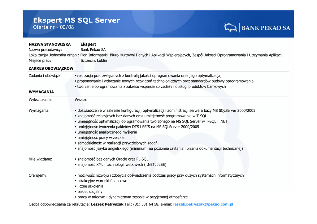 Ekspert MS SQL Server Oferta nr – 00/08 NAZWA STANOWISKA Nazwa pracodawcy: Lokalizacja/ Jednostka organ.: Miejsce pracy: Ekspert Bank Pekao SA Pion Informatyki, Biuro Hurtowni Danych i Aplikacji Wspierających, Zespół Jakości Oprogramowania i Utrzymania Aplikacji Szczecin, Lublin ZAKRES OBOWIĄZKÓW Zadania i obowiązki: § realizacja prac związanych z kontrolą jakości oprogramowania oraz jego optymalizacją § proponowanie i wdrażanie nowych rozwiązań technologicznych oraz standardów budowy oprogramowania § tworzenie oprogramowania z zakresu wsparcia sprzedaży i obsługi produktów bankowych WYMAGANIA Wykształcenie: Wyższe Wymagania: § § § § § § § § Mile widziane: § znajomość baz danych Oracle oraz PL-SQL § znajomość XML i technologii webowych ( .NET, J2EE) Oferujemy: § § § § § doświadczenie w zakresie konfiguracji, optymalizacji i administracji serwera bazy MS SQLServer 2000/2005 znajomość relacyjnych baz danych oraz umiejętność programowania w T-SQL umiejętność optymalizacji oprogramowania tworzonego na MS SQL Server w T-SQL i .NET, umiejętność tworzenia pakietów DTS i SSIS na MS SQLServer 2000/2005 umiejętność analitycznego myślenia umiejętność pracy w zespole samodzielność w realizacji przydzielonych zadań znajomość języka angielskiego (minimum: na poziomie czytania i pisania dokumentacji technicznej) możliwość rozwoju i zdobycia doświadczenia podczas pracy przy dużych systemach informatycznych atrakcyjne warunki finansowe liczne szkolenia pakiet socjalny praca w młodym i dynamicznym zespole w przyjemnej atmosferze Osoba odpowiedzialna za rekrutację: Leszek Petryszak Tel.: (81) 531 64 58, e-mail: [email protected] Ekspert Oracle Oferta nr – 00/08 NAZWA STANOWISKA Nazwa pracodawcy: Lokalizacja/ Jednostka organ.: Miejsce pracy: Ekspert Bank Pekao SA Pion Informatyki, Biuro Hurtowni Danych i Aplikacji Wspierających, Zespół Jakości Oprogramowania i Utrzymania Aplikacji Warszawa, Szczecin, Lublin ZAKRES OBOWIĄZKÓW Zadania i obowiązki: § realizacja prac związanych z kontrolą jakości oprogramowania oraz jego optymalizacją § proponowanie i wdrażanie nowych rozwiązań technologicznych oraz standardów budowy oprogramowania § tworzenie oprogramowania z zakresu wsparcia sprzedaży i obsługi produktów bankowych WYMAGANIA Wykształcenie: Wyższe Wymagania: § § § § § § § § Mile widziane: § znajomość bazy danych DB2 i MSSQL § znajomość języka T-SQL dla MSSQL Oferujemy: § § § § § znajomość języka SQL i doświadczenie w optymalizacji zapytań SQL na bazie Oracle doświadczenie w zakresie konfiguracji i optymalizacji serwera bazy Oracle EE w wersji 9i, 10g umiejętność programowania w PL-SQL, Java znajomość systemu Unix oraz języków skryptowych umiejętność analitycznego myślenia umiejętność pracy w zespole samodzielność w realizacji przydzielonych zadań znajomość języka angielskiego (minimum: na poziomie czytania i pisania dokumentacji technicznej) możliwość rozwoju i zdobycia doświadczenia podczas pracy przy dużych systemach informatycznych atrakcyjne warunki finansowe liczne szkolenia pakiet socjalny praca w młodym i dynamicznym zespole w przyjemnej atmosferze Osoba odpowiedzialna za rekrutację: Leszek Petryszak Tel.: (81) 531 64 58, e-mail: [email protected] Developer MSSQL/.NET Oferta nr – 00/08 NAZWA STANOWISKA Nazwa pracodawcy: Lokalizacja/ Jednostka organ.: Miejsce pracy: Programista Bank Pekao SA Pion Informatyki, Biuro Hurtowni Danych i Aplikacji Wspierających, Zespół Rozwoju Systemów Webowych Szczecin ZAKRES OBOWIĄZKÓW Zadania i obowiązki: § tworzenie oprogramowania z zakresu wsparcia sprzedaży i obsługi produktów bankowych WYMAGANIA Wykształcenie: Wyższe Wymagania: § § § § znajomość relacyjnych baz danych oraz umiejętność programowania w T-SQL, VB.NET, C# umiejętność analitycznego myślenia umiejętność pracy w zespole znajomość języka angielskiego (minimum: na poziomie czytania i pisania dokumentacji technicznej) Mile widziane: § znajomość baz danych Oracle oraz PL-SQL § znajomość XML i technologii webowych ( .NET) Oferujemy: § § § § § możliwość rozwoju i zdobycia doświadczenia podczas pracy przy dużych systemach informatycznych atrakcyjne warunki finansowe liczne szkolenia pakiet socjalny praca w młodym i dynamicznym zespole w przyjemnej atmosferze Osoba odpowiedzialna za rekrutację: Adam Majtyka Tel.: (91) 440 00 44, e-mail: [email protected] Junior Developer J2EE Oferta nr – 00/08 NAZWA STANOWISKA Nazwa pracodawcy: Lokalizacja/ Jednostka organ.: Miejsce pracy: Programista Bank Pekao SA Pion Informatyki, Biuro Hurtowni Danych i Aplikacji Wspierających, Zespół Rozwoju Systemów Webowych Szczecin ZAKRES OBOWIĄZKÓW Zadania i obowiązki: § tworzenie oprogramowania z zakresu wsparcia i automatyzacji procesów sprzedaży i obsługi produktów bankowych, § praca przy rozwoju systemów klasy CRM/EIS/MIS WYMAGANIA Wykształcenie: Wyższe Wymagania: §umiejętność programowania obiektowego, §znajomość java (1.4) oraz podstaw SQL, §doświadczenie w programowaniu aplikacji webowych (JSP, HTML, JavaScript), §umiejętność pracy w zespole oraz analitycznego myślenia, §znajomość języka angielskiego (minimum: na poziomie czytania dokumentacji), Mile widziane: §znajomość wzorców projektowych i architektury wielowarstwowej, §doświadczenie w programowaniu aplikacji z wykorzystaniem technologii J2EE (JDBC, EJB 2.1), §znajomość framework (Struts, Tiles), §znajomość środowiska Eclipse Oferujemy: § § § § § możliwość rozwoju i zdobycia doświadczenia podczas pracy przy dużych systemach informatycznych atrakcyjne warunki finansowe liczne szkolenia pakiet socjalny praca w młodym i dynamicznym zespole w przyjemnej atmosferze Osoba odpowiedzialna za rekrutację: Sambor Kuźma Tel.: (91) 440 01 25, e-mail: [email protected] Developer J2EE Oferta nr – 00/08 NAZWA STANOWISKA Nazwa pracod