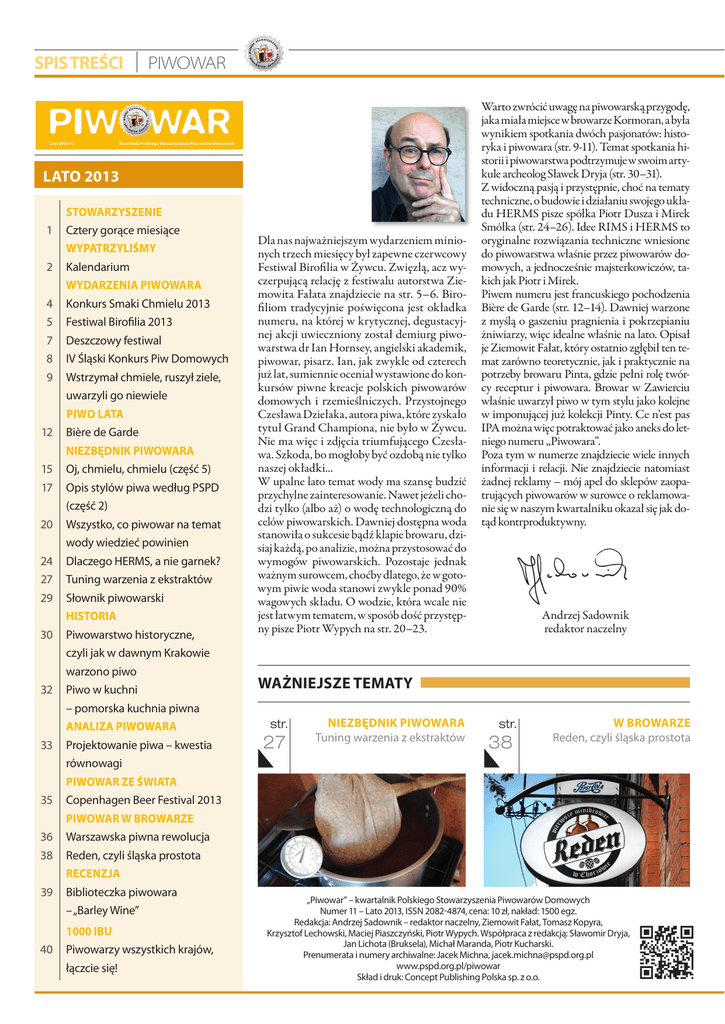 SPIS TREŚCI Lato 2013 (11) PIWOWAR Kwartalnik Polskiego Stowarzyszenia Piwowarów Domowych lato 2013 STOWARZYSZENIE 1 Cztery gorące miesiące WYPATRZYLIŚMY 2Kalendarium WYDARZENIA PIWOWARA 4 Konkurs Smaki Chmielu 2013 5 Festiwal Birofilia 2013 7 Deszczowy festiwal 8 IV Śląski Konkurs Piw Domowych 9 Wstrzymał chmiele, ruszył ziele, uwarzyli go niewiele PIWO LATA 12Bière de Garde NIEZBĘDNIK PIWOWARA 15Oj, chmielu, chmielu (część 5) 17 Opis stylów piwa według PSPD (część 2) 20Wszystko, co piwowar na temat wody wiedzieć powinien 24 Dlaczego HERMS, a nie garnek? 27 Tuning warzenia z ekstraktów 29 Słownik piwowarski historia 30Piwowarstwo historyczne, Dla nas najważniejszym wydarzeniem minionych trzech miesięcy był zapewne czerwcowy Festiwal Birofilia w Żywcu. Zwięzłą, acz wyczerpującą relację z festiwalu autorstwa Ziemowita Fałata znajdziecie na str. 5–6. Birofiliom tradycyjnie poświęcona jest okładka numeru, na której w krytycznej, degustacyjnej akcji uwieczniony został demiurg piwowarstwa dr Ian Hornsey, angielski akademik, piwowar, pisarz. Ian, jak zwykle od czterech już lat, sumiennie oceniał wystawione do konkursów piwne kreacje polskich piwowarów domowych i rzemieślniczych. Przystojnego Czesława Dziełaka, autora piwa, które zyskało tytuł Grand Championa, nie było w Żywcu. Nie ma więc i zdjęcia triumfującego Czesława. Szkoda, bo mogłoby być ozdobą nie tylko naszej okładki... W upalne lato temat wody ma szansę budzić przychylne zainteresowanie. Nawet jeżeli chodzi tylko (albo aż) o wodę technologiczną do celów piwowarskich. Dawniej dostępna woda stanowiła o sukcesie bądź klapie browaru, dzisiaj każdą, po analizie, można przystosować do wymogów piwowarskich. Pozostaje jednak ważnym surowcem, choćby dlatego, że w gotowym piwie woda stanowi zwykle ponad 90% wagowych składu. O wodzie, która wcale nie jest łatwym tematem, w sposób dość przystępny pisze Piotr Wypych na str. 20–23. Warto zwrócić uwagę na piwowarską przygodę, jaka miała miejsce w browarze Kormoran, a była wynikiem spotkania dwóch pasjonatów: historyka i piwowara (str. 9-11). Temat spotkania historii i piwowarstwa podtrzymuje w swoim artykule archeolog Sławek Dryja (str. 30–31). Z widoczną pasją i przystępnie, choć na tematy techniczne, o budowie i działaniu swojego układu HERMS pisze spółka Piotr Dusza i Mirek Smółka (str. 24–26). Idee RIMS i HERMS to oryginalne rozwiązania techniczne wniesione do piwowarstwa właśnie przez piwowarów domowych, a jednocześnie majsterkowiczów, takich jak Piotr i Mirek. Piwem numeru jest francuskiego pochodzenia Bière de Garde (str. 12–14). Dawniej warzone z myślą o gaszeniu pragnienia i pokrzepianiu żniwiarzy, więc idealne właśnie na lato. Opisał je Ziemowit Fałat, który ostatnio zgłębił ten temat zarówno teoretycznie, jak i praktycznie na potrzeby browaru Pinta, gdzie pełni rolę twórcy receptur i piwowara. Browar w Zawierciu właśnie uwarzył piwo w tym stylu jako kolejne w imponującej już kolekcji Pinty. Ce n’est pas IPA można więc potraktować jako aneks do letniego numeru „Piwowara”. Poza tym w numerze znajdziecie wiele innych informacji i relacji. Nie znajdziecie natomiast żadnej reklamy – mój apel do sklepów zaopatrujących piwowarów w surowce o reklamowanie się w naszym kwartalniku okazał się jak dotąd kontrproduktywny. Andrzej Sadownik redaktor naczelny czyli jak w dawnym Krakowie warzono piwo 32Piwo w kuchni WAŻNIEJSZE TEMATY – pomorska kuchnia piwna analiza piwowarA 33Projektowanie piwa – kwestia str. 27 Niezbędnik Piwowara Tuning warzenia z ekstraktów str. 38 w browarze Reden, czyli śląska prostota równowagi piwowar ze świata 35Copenhagen Beer Festival 2013 PIWOWAR w browarze 36Warszawska piwna rewolucja 38 Reden, czyli śląska prostota RECENZJA 39Biblioteczka piwowara – „Barley Wine” 1000 IBU 40 Piwowarzy wszystkich krajów, łączcie się! „Piwowar” – kwartalnik Polskiego Stowarzyszenia Piwowarów Domowych Numer 11 – Lato 2013, issn 2082-4874, cena: 10 zł, nakład: 1500 egz. Redakcja: Andrzej Sadownik – redaktor naczelny, Ziemowit Fałat, Tomasz Kopyra, Krzysztof Lechowski, Maciej Piaszczyński, Piotr Wypych. Współpraca z redakcją: Sławomir Dryja, Jan Lichota (Bruksela), Michał Maranda, Piotr Kucharski. Prenumerata i numery archiwalne: Jacek Michna, [email protected] www.pspd.org.pl/piwowar Skład i druk: Concept Publishing Polska sp. z o.o.