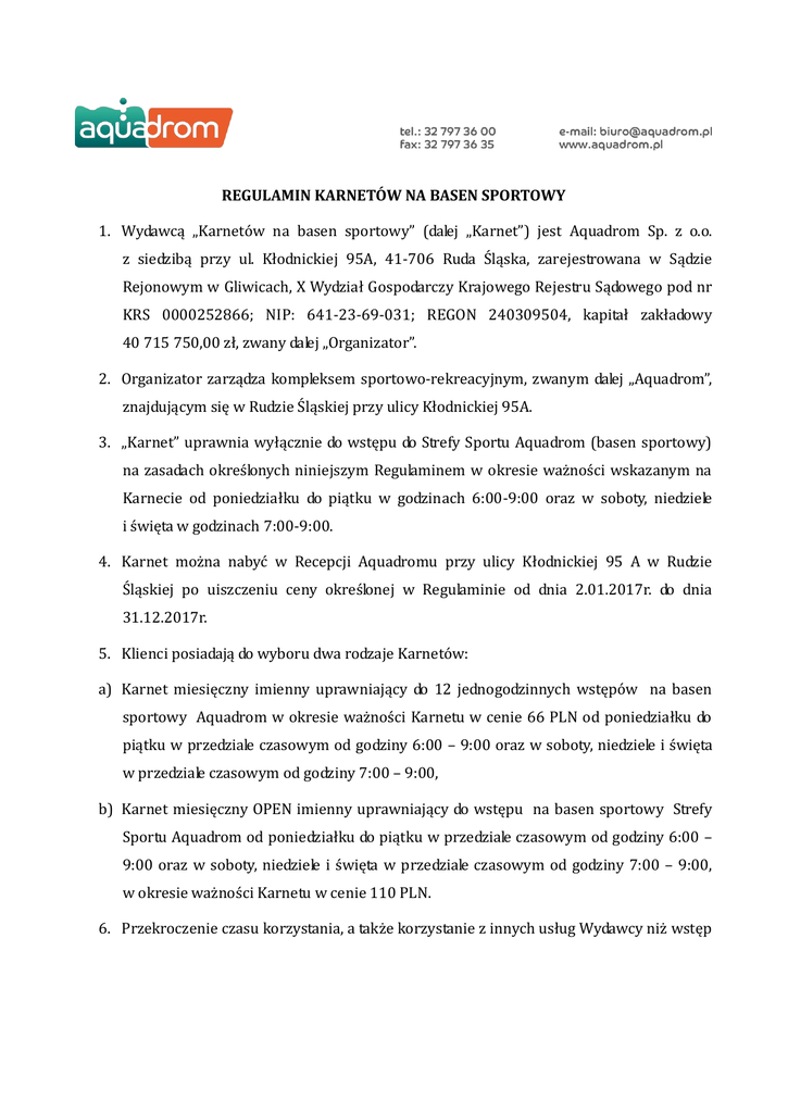 REGULAMIN KARNETÓW NA BASEN SPORTOWY 1. Wydawcą „Karnetów na basen sportowy” (dalej „Karnet”) jest Aquadrom Sp. z o.o. z siedzibą przy ul. Kłodnickiej 95A, 41-706 Ruda Śląska, zarejestrowana w Sądzie Rejonowym w Gliwicach, X Wydział Gospodarczy Krajowego Rejestru Sądowego pod nr KRS 0000252866; NIP: 641-23-69-031; REGON 240309504, kapitał zakładowy 40 715 750,00 zł, zwany dalej „Organizator”. 2. Organizator zarządza kompleksem sportowo-rekreacyjnym, zwanym dalej „Aquadrom”, znajdującym się w Rudzie Śląskiej przy ulicy Kłodnickiej 95A. 3. „Karnet” uprawnia wyłącznie do wstępu do Strefy Sportu Aquadrom (basen sportowy) na zasadach określonych niniejszym Regulaminem w okresie ważności wskazanym na Karnecie od poniedziałku do piątku w godzinach 6:00-9:00 oraz w soboty, niedziele i święta w godzinach 7:00-9:00. 4. Karnet można nabyć w Recepcji Aquadromu przy ulicy Kłodnickiej 95 A w Rudzie Śląskiej po uiszczeniu ceny określonej w Regulaminie od dnia 2.01.2017r. do dnia 31.12.2017r. 5. Klienci posiadają do wyboru dwa rodzaje Karnetów: a) Karnet miesięczny imienny uprawniający do 12 jednogodzinnych wstępów na basen sportowy Aquadrom w okresie ważności Karnetu w cenie 66 PLN od poniedziałku do piątku w przedziale czasowym od godziny 6:00 – 9:00 oraz w soboty, niedziele i święta w przedziale czasowym od godziny 7:00 – 9:00, b) Karnet miesięczny OPEN imienny uprawniający do wstępu na basen sportowy Strefy Sportu Aquadrom od poniedziałku do piątku w przedziale czasowym od godziny 6:00 – 9:00 oraz w soboty, niedziele i święta w przedziale czasowym od godziny 7:00 – 9:00, w okresie ważności Karnetu w cenie 110 PLN. 6. Przekroczenie czasu korzystania, a także korzystanie z innych usług Wydawcy niż wstęp do Strefy Sportu, w tym przejście do innej Strefy, powoduje konieczność zapłaty za świadczone przez Wystawcę usługi zgodnie z cennikiem Wydawcy. 7. Karnet jest ważny 1 miesiąc od momentu jego aktywacji dokonanej podczas zakupu Karnetu. 8. Cena uiszczona za Karnet nie podlega zwrotowi, a niewykorzystana w ramach nabytego Karnetu wartość usług nie podlega wymianie na środki pieniężne, w przypadku niewykorzystania Karnetu w okresie jego ważności. 9. Nabywca karnetu przyjmuje do wiadomości i wyraża zgodę na to, iż Zarządzający (Organizator ) może czasowo ograniczyć wejście Klientów do Aquadromu z powodu osiągnięcia maksymalnej ilości osób korzystających. 10. Organizator ma prawo do zmiany niniejszego regulaminu. 11. Aquadrom nie gwarantuje dostępu do każdej strefy, atrakcji i urządzeń w każdym czasie, w szczególności z powodu konieczności prowadzenia remontów lub konserwacji, względnie wykorzystania poszczególnych stref lub atrakcji dla dedykowanych zajęć. Każda osoba zamierzająca korzystać z Aquadromu może uzyskać informację o zakresie usług świadczonych w danym czasie bądź występujących w tej mierze ograniczeń, a decyzje co do korzystania z Aquadromu podejmuje na własne ryzyko. 12. Nabywca przyjmuje do wiadomości i akceptuje, że korzystając z Karnetu zobowiązany jest do przestrzegania oraz podlegania ograniczeniom przewidzianym w Regulaminie korzystania z Aquadromu dostępnym w recepcji Aquadromu oraz na stronie internetowej Aquadromu. 13. Reklamacje dotyczące usługi rozpatrywane będą w terminie 14 dni od daty złożenia reklamacji w Biurze Obsługi Klienta (BOK) znajdującym się w Aquadromie. 14. Regulamin dostępny jest w recepcji Aquadromu oraz na stronie internetowej Aquadromu www.aquadrom.pl