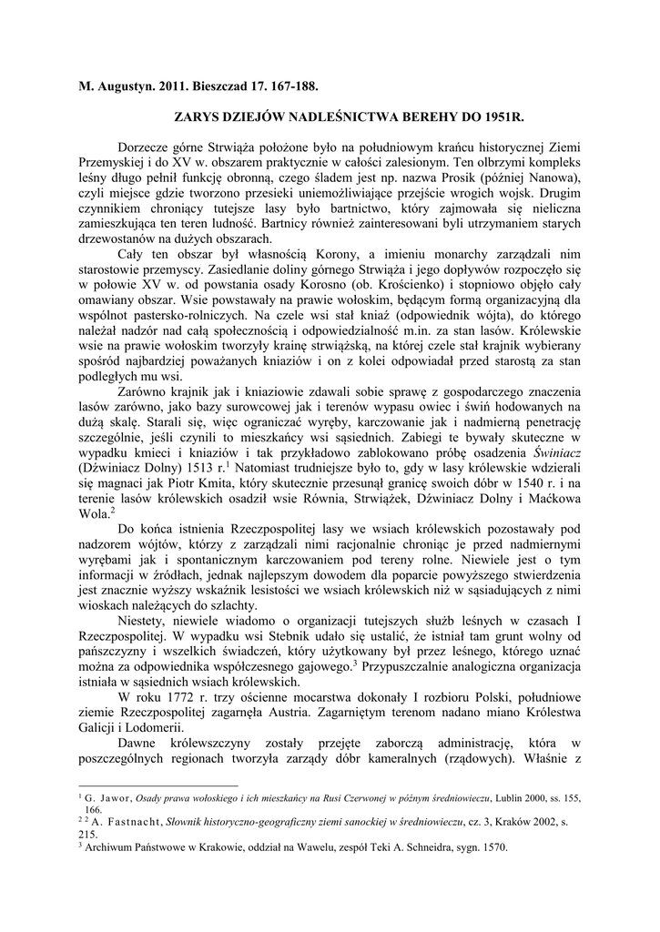 M. Augustyn. 2011. Bieszczad 17. 167-188. ZARYS DZIEJÓW NADLEŚNICTWA BEREHY DO 1951R. Dorzecze górne Strwiąża położone było na południowym krańcu historycznej Ziemi Przemyskiej i do XV w. obszarem praktycznie w całości zalesionym. Ten olbrzymi kompleks leśny długo pełnił funkcję obronną, czego śladem jest np. nazwa Prosik (później Nanowa), czyli miejsce gdzie tworzono przesieki uniemożliwiające przejście wrogich wojsk. Drugim czynnikiem chroniący tutejsze lasy było bartnictwo, który zajmowała się nieliczna zamieszkująca ten teren ludność. Bartnicy również zainteresowani byli utrzymaniem starych drzewostanów na dużych obszarach. Cały ten obszar był własnością Korony, a imieniu monarchy zarządzali nim starostowie przemyscy. Zasiedlanie doliny górnego Strwiąża i jego dopływów rozpoczęło się w połowie XV w. od powstania osady Korosno (ob. Krościenko) i stopniowo objęło cały omawiany obszar. Wsie powstawały na prawie wołoskim, będącym formą organizacyjną dla wspólnot pastersko-rolniczych. Na czele wsi stał kniaź (odpowiednik wójta), do którego należał nadzór nad całą społecznością i odpowiedzialność m.in. za stan lasów. Królewskie wsie na prawie wołoskim tworzyły krainę strwiążską, na której czele stał krajnik wybierany spośród najbardziej poważanych kniaziów i on z kolei odpowiadał przed starostą za stan podległych mu wsi. Zarówno krajnik jak i kniaziowie zdawali sobie sprawę z gospodarczego znaczenia lasów zarówno, jako bazy surowcowej jak i terenów wypasu owiec i świń hodowanych na dużą skalę. Starali się, więc ograniczać wyręby, karczowanie jak i nadmierną penetrację szczególnie, jeśli czynili to mieszkańcy wsi sąsiednich. Zabiegi te bywały skuteczne w wypadku kmieci i kniaziów i tak przykładowo zablokowano próbę osadzenia Świniacz (Dźwiniacz Dolny) 1513 r.1 Natomiast trudniejsze było to, gdy w lasy królewskie wdzierali się magnaci jak Piotr Kmita, który skutecznie przesunął granicę swoich dóbr w 1540 r. i na terenie lasów królewskich osadził wsie Równia, Strwiążek, Dźwiniacz Dolny i Maćkowa Wola.2 Do końca istnienia Rzeczpospolitej lasy we wsiach królewskich pozostawały pod nadzorem wójtów, którzy z zarządzali nimi racjonalnie chroniąc je przed nadmiernymi wyrębami jak i spontanicznym karczowaniem pod tereny rolne. Niewiele jest o tym informacji w źródłach, jednak najlepszym dowodem dla poparcie powyższego stwierdzenia jest znacznie wyższy wskaźnik lesistości we wsiach królewskich niż w sąsiadujących z nimi wioskach należących do szlachty. Niestety, niewiele wiadomo o organizacji tutejszych służb leśnych w czasach I Rzeczpospolitej. W wypadku wsi Stebnik udało się ustalić, że istniał tam grunt wolny od pańszczyzny i wszelkich świadczeń, który użytkowany był przez leśnego, którego uznać można za odpowiednika współczesnego gajowego.3 Przypuszczalnie analogiczna organizacja istniała w sąsiednich wsiach królewskich. W roku 1772 r. trzy ościenne mocarstwa dokonały I rozbioru Polski, południowe ziemie Rzeczpospolitej zagarnęła Austria. Zagarniętym terenom nadano miano Królestwa Galicji i Lodomerii. Dawne królewszczyny zostały przejęte zaborczą administrację, która w poszczególnych regionach tworzyła zarządy dóbr kameralnych (rządowych). Właśnie z 1 G. J a wo r , Osady prawa wołoskiego i ich mieszkańcy na Rusi Czerwonej w późnym średniowieczu, Lublin 2000, ss. 155, 166. A. F as t nac h t , Słownik historyczno-geograficzny ziemi sanockiej w średniowieczu, cz. 3, Kraków 2002, s. 215. 3 Archiwum Państwowe w Krakowie, oddział na Wawelu, zespół Teki A. Schneidra, sygn. 1570. 22 powodu wysokiej lesistości obszar nad Strwiążem i Wiarem uznany został za wyjątkowo cenny, jednak problemem było duże rozczłonkowanie klucza. Z problemu tego wybrnięto dokonując w 1776 r. zamiany z księżną Zofią Lubomirską, która za starostwo rohatyńskie i Werchratę oddała Dobromil z przyległymi wsiami.4 W ten sposób powstał rozległy zwarty kompleks dóbr kameralnych z centrum w Dobromilu, w którym prowadzono produkcję soli w warzelniach w Lacku oraz gospodarkę leśną. W większości wsi na dawnych folwarkach wójtowskich założono kolonie, do których sprowadzono osadników z Niemiec. Władze austriackie teren ten wysoko ceniły. W XIX w. z powodów kłopotów budżetowych, większość majątków rządowych wyprzedano wbrew protestom społeczeństwa polskiego. Kompleks dobromilski zachował nadal status dób państwowych. W Kamerze Dobromilskiej wprowadzono organizację wewnętrzną na wzór austriacki, większość wyższych urzędników również sprowadzono z Austrii i Czech. Językiem oficjalnym był niemiecki, jednak w praktyce w sprawach niższej rangi używano polskiego. Do zarządzania lasami mianowany został nadleśniczy Johann Freiherr v. Scherzer, któremu podlegało 11 leśniczych kierujących gospodarką leśną na dość dużych obszarach. Powstało wówczas leśnictwo Krościenko – Berehy, które obejmowało 6443 morgi i 585 sążni kw. (3708,16 ha) wokół wsi Berehy Dolne, Łodyna, Bandrów, Stebnik, Krościenko, Wolica i Liskowate. Według dostępnej dokumentacji dokonano tego w roku 1801 i datę tę uznać można za początkową dla omawianego nadleśnictwa. Pierwszym leśniczym był Dominik Paszyński rezydujący w Krościenku.5 Pełniejsze dane w kwestii struktury lokalnej administracji leśnej posiadamy z 1806 r. Była ona trzystopniowa, na czele administracji leśnej stał nadleśniczy w Dobromilu, którym był w tymże roki Josef Kolbe. Zaznaczyć tu trzeba, że jednostka ta była bardzo duża obszarowo i zarządzała lasami państwowymi nie tylko w okolicach Dobromila, ale i koło Mrzygłodu, Sanoka i nad górną Osławą. Drugi szczebel zarządzania stanowili leśniczowie I klasy. Omawiany obszar podlegał pod Michaela Habermanna ze Starzawy, natomiast leśni