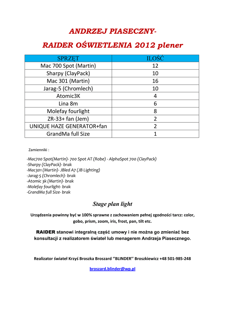 ANDRZEJ PIASECZNYRAIDER OŚWIETLENIA 2012 plener SPRZĘT Mac 700 Spot (Martin) Sharpy (ClayPack) Mac 301 (Martin) Jarag-5 (Chromlech) Atomic3K Lina 8m Molefay fourlight ZR-33+ fan (Jem) UNIQUE HAZE GENERATOR+fan GrandMa full Size ILOŚĆ 12 10 16 10 4 6 8 2 2 1 Zamienniki : -Mac700 Spot(Martin)- 700 Spot AT (Robe) - AlphaSpot 700 (ClayPack) -Sharpy (ClayPack)- brak -Mac301 (Martin)- JBled A7 (JB Lighting) -Jarag-5 (Chromlech)- brak -Atomic 3k (Martin)- brak -Molefay fourlight- brak -GrandMa full Size- brak Stage plan light Urządzenia powinny być w 100% sprawne z zachowaniem pełnej zgodności tarcz: color, gobo, prism, zoom, iris, frost, pan, tilt etc. RAIDER stanowi integralną część umowy i nie można go zmieniać bez konsultacji z realizatorem świateł lub menagerem Andrzeja Piasecznego. Realizator świateł Krzyś Broszka Broszard ‘’BLINDER’’ Broszkiewicz +48 501-985-248 [email protected] opis Truss Kontra: 5x Mac700 Spot (rys. kolor green), 4x Molefay fourlight (rys. kolor orange) 0,5m poniżej lini Mac700 Spot; Truss Middle: 5x Mac 700 Spot (rys. kolor green), miedzy nimi zawieszonych jest 6 rękawów (rys. kolor blue) o średnicy 60 cm (w zakresie zespołu), do tego niezbędne jest 6 lin zamocowanych na rampie tak by można było bez problemu je wciągną; Truss Front: 2x Mac 700 Spot (rys. kolor green), 8x Mac301 (rys. kolor cyjan) , 4x Molefay fourlight (rys. kolor orange) ; Floor: - back- 6x Mac301(rys. kolor cyjan) pod rękawami, 10x Jarag-5 (rys. kolor yellow) miedzy rękawami po dwa na przerwę, 4x Atomic 3k (rys. kolor violet) pod Jaragami, 2x ZR-33+ fan; - middle- 10x Sharpy (rys. kolor L. blue); - front- 2x Mac301(rys. kolor cyjan) skrajnie na podstawach 0,8m skrajnie z przodu sceny (przestrzał na Andrzeja Piasecznego), 2xHaizer+fan z przodu w skrajnych punktach sceny; KONSOLETA: sprawna, z działającymi suwakami, motorami, encoderami, ekrany skalibrowane, czyste, stół powinien posiadać sprawny UPS; konsoleta ustawiona na środku w odległości ¾ placu od sceny, podwyższenie na wysokości co najmniej 1,5m; URZĄDZENIA: w 100% sprawne, działające, w pełni nadające się do użytku; urządzenia powinny posiadać osobny adres DMX, przy czym urządzenia typu Jarag- 5 w trybie 25 kanałowym, Mac 301 w 19 kanałowym trybie (S16 dla JBled); ZESPÓŁ: rozstawiony na scenie zgodnie z plotem; podest tylny na wysokość 30-40 cm na całej długości sceny!!! o szerokości 3m, stabilny stanowiący jedną całość, solidnie skręcony lub ściągnięty pasem, zapewniający bezpieczeństwo, płaski, w razie potrzeby wysłonięty czarnym płótnem; zespół rozstawiony jest zgodnie z następującym ustawieniem- z przodu od lewej klawisz, na środku Andrzej Piaseczny, po prawej perkusja, lekko z tyłu obok klawiszowca Dominika (sam voc), z tyłu na podeście od lewej gitara+voc, bass, gitara; SCENA: min 12x10m o wysokości co najmniej 1,5m, z czarną podłogą wysłoniętą czarnym płótnem, tył sceny oraz boki muszą być w całości czarnym materiałem, na scenie ani wokół niej nie mogą wisieć żadne reklamy, banery oraz nic co zakłócało by jej wygląd, na scenie z obu stron znajdują się schody w ¾ od frontu sceny, stabilne solidnie zamocowane z poręczami; Pozdrawiam dziękuje