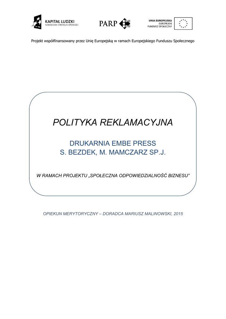 Projekt współfinansowany przez Unię Europejską w ramach Europejskiego Funduszu Społecznego POLITYKA REKLAMACYJNA DRUKARNIA EMBE PRESS S. BEZDEK, M. MAMCZARZ SP.J. W RAMACH PROJEKTU „SPOŁECZNA ODPOWIEDZIALNOŚĆ BIZNESU” OPIEKUN MERYTORYCZNY – DORADCA MARIUSZ MALINOWSKI, 2015 1. CEL POLITYKI REKLAMACYJNEJ Celem opracowania polityki reklamacyjnej jest wdrożenie sprawnego i skutecznego postępowania w przypadku reklamacji zgłoszonej przez Klienta. 2. SKŁADOWE PROCEDURY REKLAMACYJNEJ Na elementy procedury reklamacyjnej składają się: opis postępowania przyjęcia reklamacji, proces założenia Formularza Niezgodności, zasady postępowania z reklamowanym towarem oraz działań korygujących. Zapisy polityki reklamacyjnej obowiązują pracowników Biura Obsługi Klienta, dział Prepress, dział Zaopatrzenia, Kierowników Komórek Organizacyjnych, które są odpowiedzialne za wykonanie działań korygujących. 3. ODPOWIEDZIALNOŚĆ I KONTROLA 1. Osobą odpowiedzialną za przestrzeganie zapisów polityki reklamacyjnej jest Kierownik Biura Obsługi Klienta. 2. Osobą odpowiedzialną za wykonanie działań korekcyjnych ustalonych w procesie postępowania reklamacyjnego jest Kierownik Komórki Organizacyjnej biorącej udział w postępowaniu reklamacyjnym. 4. POSTĘPOWANIE PRZYJĘCIA REKLAMACJI 1. Klient może zgłosić reklamację: W formie pisemnej, Poprzez kontakt telefoniczny do BOK, Poprzez formularz wysłany e-mailem. 2. Przy zgłoszeniu reklamacji klient zobowiązany jest wskazać poniższe dane: Dane osobiste, Dane adresowe, Kontakt, Datę zamówienia, Numer zlecenia, Nazwę produktu, Datę dostawy reklamowanego towaru. 5. PROCEDURA ZAŁOŻENIA FORMULARZA NIEZGODNOŚCI 1. Zgłoszenie reklamacji przez Klienta rozpoczyna procedurę założenia Formularza Niezgodności przez Pracownika BOK bazując na danych otrzymanych od Klienta. 2. Zwrot reklamowanego towaru od Klienta stanowi podstawę do podjęcia działań w procesie rozpatrywania reklamacji. 3. Potwierdzeniem zwrotu jest zapis w Formularzu Niezgodności wykonany przez pracownika Magazynu. 4. Formularz niezgodności jest uzupełniany przez pracownika BOK, który wpisuje wszystkie dane dotyczące produktu. 5. Formularz niezgodności zawiera dane dotyczące produktu: Zwrócona ilość towaru, Opis sytuacji, powód reklamacji, Osoby biorące udział w procesie produkcyjnym. 6. Do Formularza Niezgodności dołącza się kopię Formularza Zgłoszenia Reklamacji. 6. POSTĘPOWANIE Z REKLAMOWANYM TOWAREM/WYROBEM 1. Przegląd i weryfikacja Formularza niezgodności przez Komisję. 2. Komisja składa się z: Kierownika BOK, Kierowników Komórek Organizacyjnych i przedstawicieli działu Prepress. 3. Komisja podejmuje decyzję o sposobie przeprowadzenia działań korygujących. Kierownik BOK zatwierdza pisemnie decyzję dotyczącą tego rozwiązania. 4. Komisja wyjaśnia przyczyny zaistniałej sytuacji dotyczącej reklamacji. Osoby odpowiedzialne za jej powstanie również składają wyjaśnienia. Komisja pisemnie zatwierdza wyjaśnienia. 5. Wyciągnięcie wniosków i podjęcie działań korygujących w celu eliminacji podobnych błędów w przyszłości. 7. POSTĘPOWANIE KOŃCOWE 1. Po podjęciu działań korygujących następuje wyliczenie kosztów przeprowadzonej korekty oraz ponowne rozliczenie zlecenia. 2. Formularze Zgłoszenia Reklamacji oraz Formularze Niezgodności przechowywane są w segregatorach w BOK oraz rejestrowane są w formie elektronicznej. 8. ZAŁĄCZNIKI 1. Formularz Zgłoszenia Reklamacji 2. Formularz Niezgodności Formularz Zgłoszenia Reklamacji WYPEŁNIA ZGŁASZAJĄCY REKLAMACJĘ Nazwa klienta (Imię i Nazwisko) lub nazwa firmy (NIP): .............................................................................................................................. .............................................................................................................................. .............................................................................................................................. Dane teleadresowe klienta: .............................................................................................................................. .............................................................................................................................. Kontakt Tel.: ......................................................................................................... E-mail: .................................................................................................................. Opis reklamacji:.................................................................................................... .............................................................................................................................. Żądania:................................................................................................................ Data zamówienia:................................................................................................. Numer zlecenia:................................................................................................... Nazwa produktu:.................................................................................................. Data dostawy reklamowanego towaru:................................................................ Podpis:................................................................................................................. WYPEŁNIA PRZYJMUJĄCY REKLAMACJĘ Nr zgłoszenia: ...................................................................................................... Data zgłoszenia:................................................................................................... Podpis osoby odbierającej zgłoszenie reklamacyjne:.......................................... Do kogo przekazano zgłoszenie reklamacyjne:................................................... Formularz Niezgodno