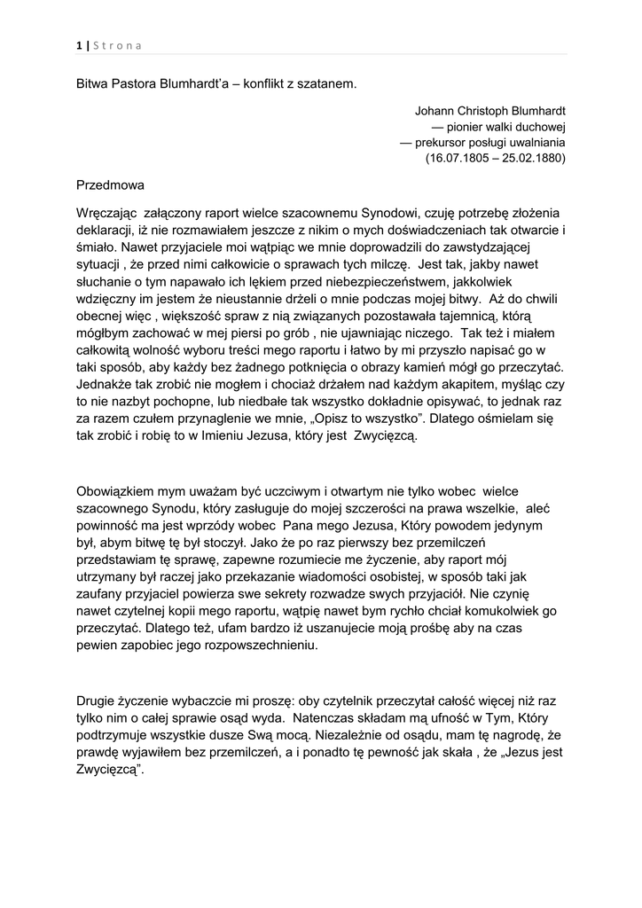 1|Strona Bitwa Pastora Blumhardt’a – konflikt z szatanem. Johann Christoph Blumhardt — pionier walki duchowej — prekursor posługi uwalniania (16.07.1805 – 25.02.1880) Przedmowa Wręczając załączony raport wielce szacownemu Synodowi, czuję potrzebę złoŜenia deklaracji, iŜ nie rozmawiałem jeszcze z nikim o mych doświadczeniach tak otwarcie i śmiało. Nawet przyjaciele moi wątpiąc we mnie doprowadzili do zawstydzającej sytuacji , Ŝe przed nimi całkowicie o sprawach tych milczę. Jest tak, jakby nawet słuchanie o tym napawało ich lękiem przed niebezpieczeństwem, jakkolwiek wdzięczny im jestem Ŝe nieustannie drŜeli o mnie podczas mojej bitwy. AŜ do chwili obecnej więc , większość spraw z nią związanych pozostawała tajemnicą, którą mógłbym zachować w mej piersi po grób , nie ujawniając niczego. Tak teŜ i miałem całkowitą wolność wyboru treści mego raportu i łatwo by mi przyszło napisać go w taki sposób, aby kaŜdy bez Ŝadnego potknięcia o obrazy kamień mógł go przeczytać. JednakŜe tak zrobić nie mogłem i chociaŜ drŜałem nad kaŜdym akapitem, myśląc czy to nie nazbyt pochopne, lub niedbałe tak wszystko dokładnie opisywać, to jednak raz za razem czułem przynaglenie we mnie, „Opisz to wszystko”. Dlatego ośmielam się tak zrobić i robię to w Imieniu Jezusa, który jest Zwycięzcą. Obowiązkiem mym uwaŜam być uczciwym i otwartym nie tylko wobec wielce szacownego Synodu, który zasługuje do mojej szczerości na prawa wszelkie, aleć powinność ma jest wprzódy wobec Pana mego Jezusa, Który powodem jedynym był, abym bitwę tę był stoczył. Jako Ŝe po raz pierwszy bez przemilczeń przedstawiam tę sprawę, zapewne rozumiecie me Ŝyczenie, aby raport mój utrzymany był raczej jako przekazanie wiadomości osobistej, w sposób taki jak zaufany przyjaciel powierza swe sekrety rozwadze swych przyjaciół. Nie czynię nawet czytelnej kopii mego raportu, wątpię nawet bym rychło chciał komukolwiek go przeczytać. Dlatego teŜ, ufam bardzo iŜ uszanujecie moją prośbę aby na czas pewien zapobiec jego rozpowszechnieniu. Drugie Ŝyczenie wybaczcie mi proszę: oby czytelnik przeczytał całość więcej niŜ raz tylko nim o całej sprawie osąd wyda. Natenczas składam mą ufność w Tym, Który podtrzymuje wszystkie dusze Swą mocą. NiezaleŜnie od osądu, mam tę nagrodę, Ŝe prawdę wyjawiłem bez przemilczeń, a i ponadto tę pewność jak skała , Ŝe „Jezus jest Zwycięzcą”. 2|Strona Sprawozdanie Gottliebin Dittus której rzecz tyczy, jest niezamęŜna, bez środków do Ŝycia, lat ma dwadzieścia i osiem. Mieszkała z dwiema siostrami i wpół ślepym bratem. Wszyscy starsi niŜ ona sama. Razem mieszkali przez lata cztery w skromnym mieszkaniu na pierwszym piętrze w Möttlingen. Dzięki swym predyspozycjom oraz staraniom swych chrześcijańskich rodziców ma dobre podstawowe wykształcenie, pomimo nawet iŜ szkoła, do której uczęszczała, najlepszą nie była. Pouczenia, które przyjęła od mego poprzednika Pastora Dr. Barth, obecnie mieszkającego w Calw, zbudowały w jej sercu dobre chrześcijańskie fundamenty. Wspominała go przy okazji kaŜdej z wielką wdzięcznością. Po zakończeniu edukacji przez czas jakiś pociągał ją świat, jednakŜe reputację miała nieposzlakowaną. Pracowała jako słuŜka w wielu domach, gdzie pamiętają o niej do dzisiejszego dnia z szacunkiem, a to dzięki zaufaniu którem moŜna ją było obdarzyć. Ze względu na dziwną chorobę nerek, na którą cierpiała w latach 1836-1838, stała się bardziej zdecydowaną i zaangaŜowaną chrześcijanką. W tym teŜ czasie za sprawą Pastora Dr. Barth i Wikarego Stotz wielu wielce powaŜanych lekarzy podjęło próbę leczenia jej przypadłości. Miało to miejsce tuŜ przed moim osiedleniem się tu, tzn. w czerwcu 1838 roku. W tym czasie wiodła skromne i ciche Ŝycie u boku brata swego i sióstr, tutaj w Möttlingen. Kochano ją i powaŜano za jej chrześcijańskie poznanie i przymioty. Gottliebin cierpiała na szereg związanych z jej chorobą dolegliwości. Gdy tylko przekroczyła próg wyŜej wspomnianego mieszkania, do którego przeprowadziła się w lutym, odczuła dziwny wpływ na siebie, o czym później mi opowiedziała. Nasiliło się to gdy później miała wraŜenie, Ŝe widzi i słyszy dziwaczne, i złe rzeczy. RównieŜ jej brat i siostry to zauwaŜali. JuŜ od pierwszego dnia gdy modliła się przy stole, „przyjdź Panie Jezu, bądź gościem naszym” doznała ataku drgawek i upadła bez czucia na podłogę. Co często słyszano w sypialni, bawialni oraz w kuchni to odgłosy tupania i tarcia. Czasem hałasy owe straszyły biedne rodzeństwo przez noc całą, a i sąsiadów z góry niepokoiły, chociaŜ wszyscy oni nie dozwalali aby rzeczy te stały się ogólnie znanymi. Gottliebin doświadczała równieŜ sensacji w swym ciele. Na przykład: nocą ręce jej wbrew woli jej wyginały się: widziała równieŜ postaci i małe światła, i inne. Wydaje się z jej relacji, Ŝe późniejsze opętanie wtedy właśnie miało swój początek. GdyŜ od tego czasu zaczęło się jej niewytłumaczalne i odraŜające wręcz obrzydliwe zachowanie w wielu miejscach ludzi odstręczające. Jednak nikt tak naprawdę nie dbał o tej sieroty sprawę, więc ją samej sobie pozostawiono. RównieŜ Gottliebin swe dziwne doświadczenia w całkowitej tajemnicy zatrzymywała. Było tak, aŜ do jesieni 1841 roku kiedy to Gottliebin przyszła do mnie po duszpasterską poradę, gdyŜ nocne nękania zbytnio ją juŜ utrapiły. Podówczas jednakŜe mówiła o swej sytuacji bardzo ogólnikowo, tak Ŝe nie mogłem wyciągnąć od niej nic co byłoby warte uwagi. Nie mogłem teŜ udzielić jej satysfakcjonującej rady. Z drugiej strony Gottliebin liczyła w 3|Strona owym czasie na to, iŜ szczere wyznanie dotyczące jej wcześniejszego Ŝycia uwolni ją od obecnego ucisku poprzez spowiedź właśnie. W grudniu tegoŜ roku, i