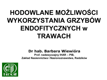 HODOWLANE MOŻLIWOŚCI WYKORZYSTANIA GRZYBÓW ENDOFITYCZNYCH w TRAWACH Dr hab. Barbara Wiewióra Prof. nadzwyczajny IHAR – PIB, Zakład Nasiennictwa i Nasionoznawstwa, Radzików Plan prezentacji • • • • • • • Endofity - ogólna charakterystyka… Występowanie endofitów w roślinach … Możliwości produkowania ergowaliny… Zasiedlenie nasion… Przeżywalność w czasie przechowywania… Podatność na stresy środowiskowe… Podsumowanie badań….. • Grzyby endofityczne to mikroorganizmy, które część lub całe swoje życie zasiedlają bezobjawowo tkanki swoich gospodarzy. • Do typowych endofitów zaliczane są gatunki z rodzaju Neotyphodium takie jak: - N. lolii Latch, Christensen & Samuels współżyjące z Lolium perenne, - N. coenophialum Morgan-Jones & Gams występujące w roślinach Festuca arundinacea, - N. uncinatum Gams, Petroni & Schmidt zasiedlające F. pratensis. • Są również doniesienia o zasiedlaniu gatunków w rodzajach: Bromus, Agrostis, Elymus, Anthoxanthum, Deschampsia, Koeleria, Holcus oraz Phleum pratense i Poa pratensis występujących na naturalnych użytkach. Ogólnie szacuje się że ok. 290 gatunków traw może być zasiedlanych przez endofity (Leuchtmann,1992). W skali całego świata zasiedlane może być od 20 – 30% gatunków traw. Grzyby te przenoszone są z nasionami, a ich grzybnia zasiedla głównie warstwę aleuronową …(White, 1987; Siegel i in., 1985) Charakterystycznie poskręcana grzybnia Neotyphodium sp. widoczna w warstwie aleuronowej ziarniaka Współżycie traw z grzybami endofitycznymi ma aspekty dodatnie i ujemne. - Endofity przynoszą trawom wiele korzyści, wzbudzając np. mechanizmy tolerancji na suszę oraz regeneracji uszkodzeń po długotrwałej suszy, jak również wpływają na oszczędną gospodarkę azotem i lepszą przyswajalność fosforu (Malinowski i Belesky, 2000). Poza tym trawy zasiedlone przez endofity są odporne na szkodniki, nicienie oraz niektóre choroby (Siegel i in., 1985). - Jednak obecność endofitów w roślinach może stanowić zagrożenie dla zwierząt roślinożernych. Stwierdzono, że niektóre z wytwarzanych przez te grzyby alkaloidów są toksyczne, a ich nagromadzenie w paszy może wpływać na stan zdrowotny zwierząt gospodarskich (Siegel i in., 1985). • Szkodliwość endofitów związana jest z wytwarzanymi przez te grzyby alkaloidami: - alkaloidy ergotynowe (klawiny, kwas lizergowy i jego amidy, ergopeptyny), - nasycone aminopirolopiraziny (loliny), indolditerpenoidy (lolitrem) (diterpeny indolu, paxilina, paxitriole, lolitriol), • alkaloidy pirolopirazynowe (peramina, która posiada właściwości odstraszające owady, jednocześnie nie wpływa ujemnie na zdrowotność zwierząt roślinożernych). • Mogą one wpływać zarówno na bezkręgowce (głównie peramina), jak i kręgowce (głównie lolitrem B i ergowalina), w tym bydło (Siegel i in., 1990; Stuedemann i Hoveland, 1988), dla którego są toksyczne i powodują stany chorobowe, a nawet mogą stanowić duże zagrożenie dla życia. • Znane są dwie groźne choroby u bydła, których czynnikiem sprawczym są alkaloidy wytwarzane przez endofity współżyjące z trawami na pastwiskach: “ryegrass staggers syndrome” i “fescue toxicosis” (Siegel i in., 1985). „Fescue toxicosis” (Cross, 2000; Ball, 2007) - objawy to zmniejszone pobieranie paszy, mniejszy przyrost masy ciała, obniżona produkcja mleka, wzrost temperatury ciała, wzmożone pocenie się i ślinienie czy obniżenie wydajności reprodukcyjnej - odpowiedzialne są alkaloidy ergotynowe produkowane przez endofity zasiedlające kostrzewę trzcinową i życicę trwałą, odpowiednio N. coenophialum i N. lolli. „Ryegrass staggers syndrome” (Malinowski i Belesky, 2000) - objawy to spadek produkcji mleka (6%–15%) i obniżenie wagi ciała, atakuje układ nerwowy zwierząt powodując jego niesprawność, której częstym objawem jest paraliż tylnych kończyn. - związana z obecnością lolitremu, który jest wytwarzany przez endofity zasiedlające głównie życicę trwałą - N. lolli. HODOWLA TRAW ZASIEDLONYCH PRZEZ ENDOFITY - wprowadzanie do roślin endofitów wpływających na zwiększenie odporności na stresy biotyczne i abiotyczne (w trawach przeznaczonych do celów trawnikowych) - wprowadzanie do roślin endofitów wytwarzających alkaloidy podnoszące odporność traw na stresy biotyczne, jednocześnie nie wywołujących chorób u zwierząt hodowlanych (w trawach pastewnych) NASZE BADANIA DOTYCZĄCE ENDOFITÓW TRAW - ocena występowania endofitów w nasionach odmian i rodów oraz w roślinach traw zbiorowisk trawiastych w Polsce, zbadanie przeżywalności endofitów w nasionach po przechowywaniu w różnych warunkach środowiska oraz ocena przydatności wybranych metod ich eliminacji, - określenie zdolności endofitów występujących w ekotypach polskich traw do produkowania szkodliwego alkaloidu – ergowaliny, - ocena przydatności zasiedlonych przez te grzyby ekotypów w hodowli traw gazonowych. Materiał badawczy: • badania przeprowadzono w latach 2007-2010 na materiale roślinnym i na nasionach, • 645 ekotypów traw w formie roślin zebranych podczas ekspedycji lub otrzymanych z Ogrodu Botanicznego IHAR w Bydgoszczy, • 127 ekotypów pozyskanych w formie nasion oraz 367 prób nasion odmian i rodów otrzymanych od hodowców, plantatorów i firm nasiennych. Zebrane ekotypy zarówno w formie roślin, jak i nasion, należały do 26 gatunków traw i pochodziły z 266 miejsc w Polsce Ekspedycje w różne regiony kraju, pozyskiwanie ekotypów traw … świętkorzyskie podlaskie mazowieckie zachodniopomorskie Umieszczenie ekotypów w kolekcji polowej pojedynków w IHAR-PIB w Radzikowie … Identyfikacja mikroskopowa obecności grzybni endofitów w roślinach … (Saha i in., 1988) W oparciu o wyniki identyfikacji mikroskopowej opisywano nast. cechy … • Analizy dotyczące alkaloidów wytwarzanych przez endofity zostały wy