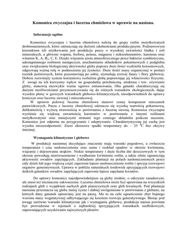Komonica zwyczajna i lucerna chmielowa w uprawie na nasiona. Informacje ogólne Komonica zwyczajna i lucerna chmielowa należą do grupy roślin motylkowatych drobnonasiennych, które odznaczają się dużymi zdolnościami produkcyjnymi. Podstawowym kierunkiem ich użytkowania jest produkcja paszy o wysokiej zawartości białka i soli mineralnych, a głównie wapnia, fosforu, potasu, magnezu i mikroelementów, karotenu oraz witamin K, A, B2, C, E. Dzięki wiązaniu azotu atmosferycznego przez bakterie symbiotyczne, udostępnianego roślinom następczym, uruchamianiu składników pokarmowych z podglebia oraz zwiększaniu biologicznej aktywności gleby poprzez duże ilości wydzielin korzeniowych, odgrywają ważną rolę w podnoszeniu jej żyzności. Duże ilości masy organicznej w postaci resztek pożniwnych, które pozostawiają po sobie, stymulują rozwój fauny i flory glebowej. Dobrze rozwinięty system korzeniowy rozluźnia glebę poprawiając jej właściwości fizyczne. Z uwagi na ich korzystny wpływ na gospodarkę próchniczną, strukturę i tzw. ożywienie gleby, stanowią niezwykle ważne ogniwo zmianowania. Oba gatunki charakteryzują się dużymi możliwościami przystosowywania się do różnych warunków ekologicznych, dając wysokie plony w gorszych warunkach glebowo-klimatycznych, nieodpowiednich do uprawy koniczyn oraz lucerny siewnej i mieszańcowej. W uprawie polowej lucerna chmielowa stanowi cenny komponent mieszanek pastwiskowych. Pasza z lucerny chmielowej odznacza się wysoką wartością pokarmową, delikatnością i wyższą strawnością w porównaniu z lucerną siewną. Komonica zwyczajna wyróżnia się większą zawartością karotenów w porównaniu z innymi roślinami motylkowatymi oraz mniejszymi stratami tego cennego składnika podczas suszenia. Komonica jest odporna na przygryzanie i udeptywanie. Charakterystyczną jej cechą jest wysoka mrozoodporność. Znosi okresowe spadki temperatury do – 25 0C bez okrywy śnieżnej. Wymagania klimatyczne i glebowe W produkcji nasiennej decydujące znaczenie mają warunki pogodowe, a zwłaszcza temperatura i czas nasłonecznienia oraz suma i rozkład opadów w okresie kwitnienia, wiązania i dojrzewania strąków. Niskie temperatury i duża liczba dni deszczowych w tym okresie powodują nierównomierne i wydłużone kwitnienie roślin, a także silnie ograniczają aktywność owadów zapylających. Zakładanie plantacji na polach nasłonecznionych przez cały dzień lub jego większą część zapewnia lepsze nasłonecznienie roślin i sprzyja rozwojowi organów generatywnych. Uprawa w pobliżu naturalnych środowisk sprzyjających rozwojowi dzikich gatunków owadów zapylających zapewnia lepsze zapylanie kwiatów. Do uprawy komonicy najodpowiedniejsze są gleby średnie, o odczynie zasadowym, ale znosi też nieznaczne zakwaszenie. Lucerna chmielowa może być uprawiana na wszystkich rodzajach gleb z wyjątkiem suchych gleb piaszczystych oraz gleb kwaśnych. Pod plantacje nasienne przeznacza się gleby mniej żyzne i słabiej uwilgotnione w porównaniu z glebami, na których dany gatunek uprawiany jest na paszę. Ma to na celu ograniczenie zbyt bujnego wzrostu masy wegetatywnej odbywającego się kosztem rozwoju generatywnego. Biorąc pod uwagę zarówno warunki klimatyczne jak i wymagania glebowe, produkcja nasion powinna być prowadzona w rejonach o najbardziej sprzyjających warunkach siedliskowych, zapewniających uzyskiwanie najwyższych plonów. Agrotechnika ogólna Komonicę i lucernę na nasiona uprawia się w siewie czystym. W płodozmianie umieszcza się je na ogół w trzecim roku po nawożeniu obornikiem. Uprawa bezpośrednio po zastosowaniu obornika może powodować nadmierny wzrost części nadziemnej prowadzący do wylegania roślin, zmniejszenie liczby wytwarzanych pędów nasiennych, a także sprzyja silnemu zachwaszczeniu plantacji. Dobrym przedplonem dla upraw nasiennych są rośliny pastewne zbierane na zieloną masę, za wyjątkiem roślin motylkowatych oraz zboża. Zbyt częsta uprawa tego samego gatunku na jednym polu prowadzi do tzw. zmęczenia gleby. Główną przyczyną tego zjawiska jest nagromadzenie się w glebie bakteriofagów, patogenów grzybowych i szkodników, dlatego też przerwa w uprawie powinna wynosić 4-6 lat. Natomiast uprawa różnych gatunków roślin motylkowatych na tym samym polu nie może odbywać się częściej niż co 3-4 lata. W uprawach nasiennych konieczne jest także zachowanie izolacji przestrzennej od plantacji tego samego lub innego gatunku, którego pyłek może prowadzić do zapylenia. Zgodnie z Rozporządzeniem Ministra Rolnictwa i Rozwoju Wsi w sprawie rejestracji odmian i udzielania ochrony wyłącznego prawa do odmiany oraz wytwarzania i kontroli materiału siewnego, w produkcji materiału elitarnego odległość od innych plantacji, jeśli powierzchnia rozmnożenia nie przekracza 2 ha, powinna być nie mniejsza niż 200 m, a w przypadku plantacji większych 100 m. Przy produkcji materiału kwalifikowanego stosuje się odpowiednio odległość 100 i 50 m. W praktyce zaleca się jednak zachowanie większej odległości od innych upraw nasiennych, która, niezależnie od wielkości plantacji, powinna wynosić 200-300 m. Przygotowanie pola i nawożenie Przygotowanie stanowiska dla plantacji nasiennej wymaga dużej staranności i powinno zmierzać do możliwie głębokiego spulchnienia gleby. Okres jesienny powinien być wykorzystany na dokładne niszczenie chwastów, wysiew nawozów oraz wykonanie orki przedzimowej. Wiosenne zabiegi uprawowe powinny prowadzić do ograniczania strat wody, niszczenia kiełkujących chwastów oraz spulchnienia wierzchniej warstwy gleby i wyrównania powierzchni pola. Wapń. Jednym z warunków dobrego rozwoju roślin, zapewniających uzyskiwanie wysokich plonów nasion w kolejnych latach użytkowania plantacji, jest obojętny lub lekko alkaliczny odczyn gleby. Wapń jest podstawowym składnikiem pokarmowym roślin motylkow