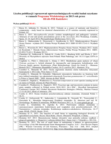 Liczba publikacji i opracowań upowszechniających wyniki badań uzyskane w ramach Programu Wieloletniego za 2013 rok przez IHAR-PIB Radzików: Wykaz publikacji IHAR : 1. 2. 3. 4. 5. 6. 7. 8. 9. 10. 11. 12. 13. 14. 15. 16. Boros D., Jabłonka O., Myszka K. 2013. Triticale as a source of nutrients and bioactive components - study based on chemical characteristics of 29 varieties currently registered in Poland. J47. Boros L. 2013. Mycosphaerella pinodes isolates morphological and pathogenic variation. Abstracts of oral and poster presentations given at the Ascochyta 2012 Workshop, Córdoba, Spain, 22–26 April 2012; Phytopathologia Mediterranea 52(1): 225. Boros L., Małuszyńska E., Drzewiecki J., Szydłowska A. 2013. Międzynarodowe Przepisy Oceny Nasion - wydanie 2013. Polska Wersja Wydania 2013. ISBN 83-891172-61-5. Wydanie 2013/1 Boros L., Wiewióra B. 2013. Międzynarodowe Przepisy Oceny Nasion. Wydanie 2013. Aneks do Rozdziału 7 Metody Oceny Zdrowotności Nasion. Polska Wersja Wydania 2013. ISBN83-891172-62-3. Wydanie 2013/1. Chmielarz M., Sobkowiak S., Dębski K., Cooke D.E.L., Brurberg M.B. and Śliwka J. 2013. Diversity of Phytophthora infestans from Poland. Plant Pathology. doi: 10.1111/ppa.12076 (w druku) Czaplicki A., Pilch J., Żebrowski J., Zimny J. 2013. Metabolome grain analysis of wheat Triticum aestivum L. hybrid obtained by interspecific and intergeneric hybridization with Poaceae family species. Konferencja „Plant Biotechnology: Green for Good II – Olomouc Biotech 2013”, Ołomuniec (Republika Czeska), 16-21 czerwca 2013. Abstracts: 59 p. Czembor E., Matusiak M. 2013. Ocena zagrożenia skażenia ziarna kukurydzy toksynami fuzaryjnymi w 2012 roku. Wieś Jutra 2: 51-53. Czembor E., Matusiak M. Ochodzki. Odporność mieszańców kukurydzy na fuzariozę kolb przy infekcji naturalnej i po zakażeniach sztucznych Fusarium graminearum i F. verticillioides w Polsce w latach 2008 – 2009. złożona do Biul. IHAR Czembor E., Stępień Ł., Waśkiewicz A. Fusarium temperatum as a new species causing ear rot on maize in Poland. złożona do Plant Disease Czembor E., Waśkiewicz A., Stępień Ł. 2013. Fusarium spp. and mycotoxin contents in maize grain samples collected in Poland across 2010–2012. (in:) ISM - MycoRed International Conference Europe 2013 Global Mycotoxin Reduction Strategies (Włochy, Martina Franca) 17-31.05.2013, Book of Abstracts: 194. Czerko Z. 2013. Ocena trwałości przechowalniczej odmian ziemniaka. Ziemniak Polski 1: 46-51. Czerko Z., Goliszewski W., Jankowska J., Lutomirska B., Nowacki W., Trawczyński C., Zarzyńska K.: Metodyka Integrowanej Produkcji ziemniaka. Pr. zbiorowa pod red. W. Nowackiego. Wydanie II zmienione. PIORIN Warszawa 2013, ss. 75; www.piorin.gov.pl Czerko Z., Grudzińska M., Zgórska K. 2013. Porównanie odmian ziemniaka z zaawansowanym materiałem hodowlanym pod względem strat przechowalniczych. (W:) Nasiennictwo i ochrona ziemniaka. Konferencja naukowo-szkoleniowa. Dźwirzyno, 16-17 maja. IHAR, ZNiOZ, Bonin: 39-41. Dostatny D. F., 2013. The function of small farms in supporting biological diversity of agricultural ecosystems. Roczn. Ekon.Rolni. i Rozw. Obszarów Wiejskich. w druku Dostatny D.F. 2013. Biocenotyczne funkcje chwastów oraz potrzeba ochrony rzadkich i ginących gatunków w: Bogactwo i ochrona dzikiej flory i fauny (red. J. Tyburski), s. 303-316. Dostatny D., 2013. The role of small farms in maintaining a balance in agroecosystems Proceedings of the19th International Farm Management Congress. Vol.1 - Peer Review Papers (PR) - Warsaw University of Life Sciences, Warszawa - July 21st - 26th, 2013. Artykuł dostępny również na stronie internetowej: http://www.ifmaonline.org/pages/congress.php 17. 18. 19. 20. 21. 22. 23. 24. 25. 26. 27. 28. 29. 30. 31. 32. 33. 34. 35. 36. Dostatny D.F., Kordulasińska I., Małuszyńska E. 2013. „Survival rate of Avena fatua L. in laboratory, in greenhouses and in field conditions” publikacja wysłana do recenzji. Erlichowski T. 2013. Nowe zagrożenie w uprawie ziemniaka. Agrotechnika 6: 37. Erlichowski T. 2013. Ocieplenie klimatu a występowanie szkodników glebowych ziemniaka. Farmer 2: 410-412. Erlichowski T. 2013. Stonka nadal groźna. Wiad. Rolnicze Polska 6(100): 20. Erlichowski T. 2013. Wymieniaj sadzeniaki. Wiad. Rolnicze Polska 3(97): 18. Erlichowski T. 2013. Zaprawianie bulw – sposób na szkodniki glebowe. Wiad. Rolnicze Polska 4(98): 22-23. Erlichowski T. 2013. Zaprawianie bulw ziemniaka – ochrona ważna przed sadzeniem. AgroNews, Gazeta interaktywna nr 7: 36-41. [http://www.gazeta07.agronews.com.pl/] Erlichowski T., Jakubowska M. 2013. Monitoring szkodliwości rolnic (Noctuinae) w uprawach ziemniaka – zmiany zachodzące w ostatnich latach. Ziemniak Polski 1: 23-28. Gawińska-Urbanowicz H. 2013. Wrażliwość odmian ziemniaka na sprawców z rodzaju Alternaria w testach laboratoryjnych. (W:) Nasiennictwo i ochrona ziemniaka. Konferencja naukowo-szkoleniowa. Dźwirzyno, 16-17 maja. IHAR, ZNiOZ, Bonin: 104-106. Gawińska-Urbanowicz H., Kapsa J. 2013. Wyniki monitorowania grzybów z rodzaju Alternaria w uprawach ziemniaka. 53 Sesja Nauk. IOR PIB. Poznań 7-8.02.2013, IOR Poznań Streszczenia: 43. Gawińska-Urbanowicz H., Kapsa J. 2013. Wyniki monitorowania grzybów z rodzaju Alternaria w uprawach ziemniaka. Prog. Plant Prot. 53(3): 527-532. Gilon M., Arseniuk E. 2013. Natural field infections of wheat and triticale by complex of fungi Stagonospora nodorum and Septoria tritici in Poland. (in:) 8th International Triticale Symposium w Ghent, Belgia, June 10-14, 2013, Book of Abstracts: 68-69. Gilon M., Arseniuk E. 2013. Występowanie i stopień naturalnego porażenia Stagonospora nodorum na pszenicy i pszenżycie w Polsce. Konferencja: Nauka dla hodowli roślin i nasiennictwa, Zakopane 4-8.02.2013r., Książka streszczeń: 206-207. Grudzińska M. 2013. Światło przyczyną zazielenienia ziemniaków. Wiadomości Rolnicze 3: 14. Grudzińska M. 2013. Wpływ S-carvone na