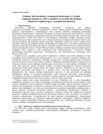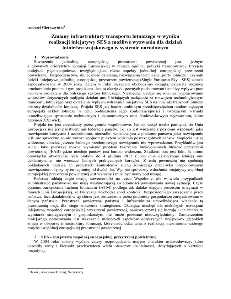 Andrzej Gieroczyński 1 Zmiany infrastruktury transportu lotniczego w wyniku realizacji inicjatywy SES a możliwe wyzwania dla działań lotnictwa wojskowego w systemie narodowym 1. Wprowadzenie Stworzenie jednolitej europejskiej przestrzeni powietrznej jest jednym z głównych priorytetów Komisji Europejskiej w ramach ogólnej polityki transportowej. Przyjęto podejście pięciostopniowe, uwzględniające różne aspekty jednolitej europejskiej przestrzeni powietrznej: bezpieczeństwo, skuteczność działania, rozwiązania techniczne, porty lotnicze i czynnik ludzki. Inicjatywa jednolitej europejskiej przestrzeni powietrznej (Single European Sky - SES) została zapoczątkowana w 2004 roku. Zatem w roku bieżącym obchodzimy okrągłą, dziesiątą rocznicę uruchomienia prac nad tym projektem. Jest to okazja do pewnych podsumowań i analizy wpływu prac nad tym projektem dla polskiego sektora lotniczego. Niezbędne wydaje się również wypracowanie wniosków dotyczących podjęcia działań umożliwiających nadążanie za rozwojem technologicznym transportu lotniczego oraz określenie wpływu wdrażania inicjatywy SES na inne niż transport lotniczy obszary działalności lotniczej. Projekt SES jest bardzo ambitnym przedsięwzięciem modernizującym europejski sektor lotniczy w celu podniesienia jego konkurencyjności i tworzącym warunki umożliwiające sprostanie technicznym i ekonomicznym oraz środowiskowym wyzwaniom, które przynosi XXI wiek. Projekt ten jest zarządzany przez gremia wspólnotowe. Jednak wciąż trzeba pamiętać, że Unia Europejska nie jest państwem ani federacją państw. To, co jest widziane z poziomu wspólnoty jako rozwiązanie korzystne i uzasadnione, nierzadko widziane jest z poziomu państwa jako rozwiązanie jeśli nie sprzeczne, to nie zawsze spójne z punktem widzenia poszczególnych państw. Napięcia już są widoczne, chociaż jeszcze żadnego przełomowego rozwiązania nie wprowadzono. Przykładów jest wiele. Jako pierwszy można wymienić problem tworzenia funkcjonalnych bloków przestrzeni powietrznej (FAB) gdzie niechęć państw jest bardzo widoczna. Skutkiem zaś jest fakt, że mimo obowiązku utworzenia tych bloków do 4 grudnia 2012 r., do dnia dzisiejszego istnieją one deklaratywnie, nie wnosząc żadnych praktycznych korzyści. Z całą pewnością nie spełniają pokładanych nadziei. O protestach kontrolerów ruchu lotniczego przeciwko proponowanym rozwiązaniom słyszymy co najmniej od dwóch lat. Wymiar społeczny wdrażania inicjatywy wspólnej europejskiej przestrzeni powietrznej jest wyraźny i musi być brany pod uwagę. Państwa oddają część swojej suwerenności na rzecz Wspólnoty, ale w wielu przypadkach administracje państwowe nie mają wystarczającej świadomości powstawania nowej sytuacji. Część systemu zarządzania ruchem lotniczym (ATM) podlega tak daleko idącym procesom integracji w ramach Unii Europejskiej, że faktyczne wychodzą spod kontroli i bezpośredniego zarządzania przez państwa, lecz działalność w tej sferze jest prowadzona przez podmioty gospodarcze zarejestrowane w danym państwie. Przestrzeń powietrzna państwa i infrastruktura umożliwiająca władanie tą przestrzenią mają dla niego znaczenie strategiczne. Okazując niechęć dla niektórych rozwiązań inicjatywy wspólnej europejskiej przestrzeni powietrznej, państwa czymś się kierują i ich interes w wymiarze strategicznym i gospodarczym nie może pozostać nieuwzględniony. Zamierzeniem niniejszego opracowania jest wskazanie niektórych aspektów dotyczących wyjątkowo głębokich zmian w obszarze infrastruktury lotniczej, które nadchodzą wraz z realizacją niezmiernie ważnego projektu wspólnej europejskiej przestrzeni powietrznej. 2. SES – inicjatywa wspólnej europejskiej przestrzeni powietrznej W 2004 roku zostały wydane cztery rozporządzenia mające charakter ustawodawczy, które określiły ramy i kierunki przekształceń wielu obszarów działalności, decydujących o kształcie inicjatywy: 1 Dr inż., Akademia Obrony Narodowej. Rozporządzenie (WE) nr 549/2004 Parlamentu Europejskiego i Rady z dnia 10 marca 2004 r. ustanawiające ramy tworzenia jednolitej europejskiej przestrzeni powietrznej (rozporządzenie ramowe). Rozporządzenie (WE) nr 550/2004 Parlamentu Europejskiego i Rady z dnia 10 marca 2004 r. w sprawie zapewniania służb żeglugi powietrznej w jednolitej europejskiej przestrzeni powietrznej (rozporządzenie w sprawie zapewniania służb). Rozporządzenie (WE) nr 551/2004 Parlamentu Europejskiego i Rady z dnia 10 marca 2004 w sprawie organizacji i użytkowania przestrzeni powietrznej w jednolitej europejskiej przestrzeni powietrznej (rozporządzenie w sprawie przestrzeni powietrznej). Rozporządzenie (WE) nr 552/2004 Parlamentu Europejskiego i Rady z dnia 10 marca 2004 r. w sprawie interoperacyjności Europejskiej Sieci Zarządzania Ruchem Lotniczym (rozporządzenie w sprawie interoperacyjności). Przypomnijmy, że podstawowym założeniem było osiągnięcie trzech celów określanych jako: poprawa standardów bezpieczeństwa w zakresie ruchu lotniczego, wspieranie zrównoważonego rozwoju systemu transportu lotniczego, poprawa ogólnej skuteczności działania europejskiego systemu ATM i służb żeglugi powietrznej. Jako założenia projektu wymienia się trzykrotny wzrost wydajności, podniesienie poziomu bezpieczeństwa o rząd wielkości, dziesięcioprocentowe zmniejszenie negatywnego wpływu transportu lotniczego na środowisko oraz zmniejszenie o 50% kosztów zarządzania ruchem lotniczym (ATM). Zgodnie z pierwotnymi założeniami cele inicjatywy powinny być osiągnięte do 2020 roku. Dokonując pewnego uproszczenia, można wyróżnić następujące obszary objęte regulacjami dotyczącymi inicjatywy wspólnej europejskiej przestrzeni powietrznej: ustanawianie i zakres kompetencji państwowych władz nadzorujących, działanie komitetu ds. jednolitej europejskiej przestrzeni powietrznej, s