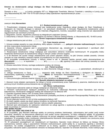 Umowa na dostarczanie usługi dostępu do Sieci Osiedlowej z dostępem do Internetu w pakiecie …......... nr …...................... Zawarta w dniu ….......... w Łomży pomiędzy IST s.c. Małgorzata Trawińska, Mariusz Trawiński z siedzibą w Łomży przy ulicy Mazowieckiej 6G, NIP 718-15-70-229 zwanym dalej Operatorem reprezentowanym przez: ….................... a: ….................... …............................... zwanym dalej Abonentem § 1. Rodzaj świadczonych usług 1. Przedmiotem niniejszej umowy (Umowa) jest świadczenie przez Operatora usługi dostępu do Sieci Osiedlowej z Dostępem do Internetu (Usługa) w zakresie i na warunkach określonych w Umowie, Regulaminie świadczenia usługi dostępu do Sieci Osiedlowej z dostępem do Internetu (Regulamin), Cenniku wszystkich usług (Cennik) lub odpowiednich regulaminach lub cennikach promocji. 2. Regulamin, Cennik, regulaminy promocji są integralnymi częściami Umowy. 3. Dokumenty o których mowa w ust. 2 dostępne są również w Biurze Obsługi Klienta, ul. Mazowiecka 6G, 18-400 Łomża § 2. Termin rozpoczęcia świadczenia usługi 1. Usługa świadczona jest od dnia: …................... § 3. Czas trwania umowy 1. Umowa zostaje zawarta na czas określony, który upływa z końcem …..... pełnych okresów rozliczeniowych, liczonych od dnia rozpoczęcia świadczenia Usługi. 2. Zawarcie Umowy związane jest z przyznaniem Abonentowi ulg, określonych w regulaminach i cennikach ofert promocyjnych w wysokości: …............... zł (słownie: …....................................... zł) 3. Rozpoczęcie świadczenia Usługi następuje pod warunkiem istnienia możliwości technicznych. W przypadku braku możliwości technicznych do świadczenia Usługi w danym Lokalu Umowa wygasa. 4. O ile Abonent nie wyrazi innego oświadczenia woli przed upływem okresu, na jaki Umowa została zawarta, Umowa zawarta na czas określony uważana będzie za przedłużoną na czas nieokreślony. 5. W przypadku przedłużenia Umowy, o którym mowa w ust. 4, Abonent będzie ponosił opłaty abonamentowe za Abonament …............. w wysokości ….............. zł (…........................zł), zgodnej z cennikiem dla umowy zawartej na czas nieokreślony. 6. Zmiana warunków Umowy, wymaga podpisania aneksu do Umowy. § 4. Pakiet taryfowy 1. Na podstawie Umowy Operator świadczy na rzecz Abonenta Usługę w Opcji …..............o parametrach, określonych w Cenniku. 2. Usługa świadczona w Opcji ….............. zapewnia stały dostęp do Sieci Osiedlowej z dostępem do Internetu z maksymalną szybkością transmisji do …......... Mbit/s do komputera Abonenta(download) i do ….............. Mbit/s od komputera Abonenta (upload); oraz brakiem limitu transferu. 3. Cena promocyjna podczas trwania Umowy na czas określony za Abonament ….......... zł (….......................... zł.). § 5. Sposób składania zamówień na usługi 1. Abonent może składać zamówienie na Usługi w formie przewidzianej przez Operatora tj. pisemnie, telefonicznie lub za pomocą innych środków porozumiewania się na odległość. § 6. Okres rozliczeniowy 1. Rozpoczęcie naliczania opłat za Usługę następuje po aktywacji Usługi. 2. Okresem rozliczeniowym, będącym podstawą do rozliczenia należności Abonenta wobec Operatora, jest miesiąc kalendarzowy. Rozliczenie następuje według dat wskazanych na fakturze VAT. 3. Operator wystawia faktury VAT za każdy okres rozliczeniowy. 4. Faktury VAT za Usługę, doręczane są Abonentowi przesyłką pocztową w granicach Rzeczpospolitej Polskiej lub w inny sposób uzgodniony przez Strony. 5. Termin płatności wynosi 14 dni od dnia wystawienia faktury VAT. 6. Za dzień zapłaty uważa się dzień wpływu środków na rachunek Operatora. 7. Za opóźnienie w uiszczaniu opłat Operator nalicza odsetki ustawowe. 8. Abonent jest zobowiązany do wpłacania należności za usługi zgodnie z wystawioną fakturą, w Biurze Obsługi Klienta bądź na poniższy nr rachunku bankowego: PKO BANK POLSKI 49 1020 1332 0000 1502 0346 87 58 9. W przypadku, gdy Abonent dokonuje wpłaty za pomocą przelewu bankowego, zobowiązany jest podać swój numer Abonenta, określony na dokumencie płatniczym oraz podać numer dokumentu, za który następuje wpłata. W przypadku braku takiego wskazania, wpłata zostanie rozliczona na poczet zaległości wynikających z najstarszych faktur VAT, wraz z odsetkami. W przypadku braku możliwości zidentyfikowania Abonenta dokonującego wpłaty, zostanie ona zwrócona przez Operatora do banku, który zrealizował wpłatę. 10. W sytuacjach szczególnych lub niezależnych od Operatora, Operator może doliczyć do faktury za bieżący Okres rozliczeniowy wartość usług z poprzednich Okresów rozliczeniowych, jeżeli opłaty te, w wysokości zgodnej z cennikami Operatora, nie zostały uwzględnione w fakturach za te okresy, zgodnie z wymaganiami przepisów podatkowych. W przypadku naliczenia opłat z poprzednich okresów na bieżącej fakturze, Operator na wniosek Abonenta, może rozłożyć jego należność na raty, o ile wartość tych opłat na fakturze, przekroczy wartość abonamentu płaconego aktualnie przez tego Abonenta, przy czym liczba rat będzie nie większa niż liczba miesięcy, za które Abonentowi nie była wystawiona faktura VAT. 11. W przypadku nieotrzymania faktury VAT za okres rozliczeniowy, Abonent powinien niezwłocznie zgłosić ten fakt w Biurze Obsługi Klienta. § 7. Tryb i warunki dokonywania zmian umowy 1. Operator umożliwia zmianę opcji Usługi oraz okresu na jaki została zawarta Umowa poprzez podpisanie odpowiedniego Aneksu w Biurze Obsługi Klienta. 2. Zamówienie, dotyczące zmiany Opcji w kolejnym Okresie rozliczeniowym, powinno zostać złożone nie później, niż do 15 dnia Okresu rozliczeniowego poprzedzającego Okres Rozliczeniowy, w którym zmiana ma nastąpić. Zamówienia na zmianę Opcji, złożone później niż do 15 d