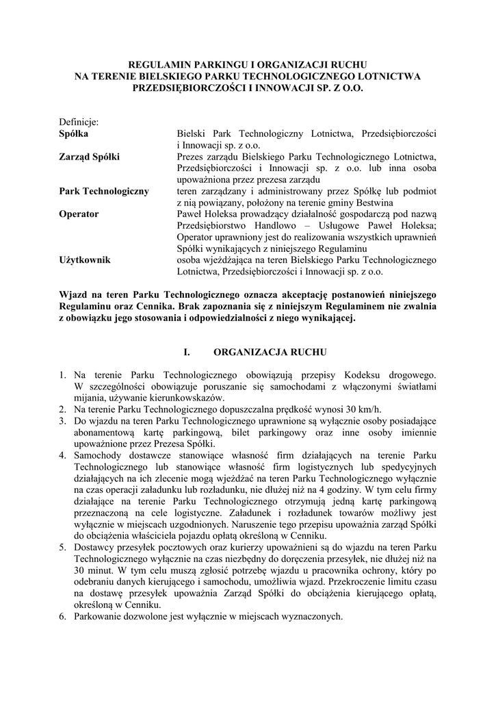 REGULAMIN PARKINGU I ORGANIZACJI RUCHU NA TERENIE BIELSKIEGO PARKU TECHNOLOGICZNEGO LOTNICTWA PRZEDSIĘBIORCZOŚCI I INNOWACJI SP. Z O.O. Definicje: Spółka Zarząd Spółki Park Technologiczny Operator Użytkownik Bielski Park Technologiczny Lotnictwa, Przedsiębiorczości i Innowacji sp. z o.o. Prezes zarządu Bielskiego Parku Technologicznego Lotnictwa, Przedsiębiorczości i Innowacji sp. z o.o. lub inna osoba upoważniona przez prezesa zarządu teren zarządzany i administrowany przez Spółkę lub podmiot z nią powiązany, położony na terenie gminy Bestwina Paweł Holeksa prowadzący działalność gospodarczą pod nazwą Przedsiębiorstwo Handlowo – Usługowe Paweł Holeksa; Operator uprawniony jest do realizowania wszystkich uprawnień Spółki wynikających z niniejszego Regulaminu osoba wjeżdżająca na teren Bielskiego Parku Technologicznego Lotnictwa, Przedsiębiorczości i Innowacji sp. z o.o. Wjazd na teren Parku Technologicznego oznacza akceptację postanowień niniejszego Regulaminu oraz Cennika. Brak zapoznania się z niniejszym Regulaminem nie zwalnia z obowiązku jego stosowania i odpowiedzialności z niego wynikającej. I. ORGANIZACJA RUCHU 1. Na terenie Parku Technologicznego obowiązują przepisy Kodeksu drogowego. W szczególności obowiązuje poruszanie się samochodami z włączonymi światłami mijania, używanie kierunkowskazów. 2. Na terenie Parku Technologicznego dopuszczalna prędkość wynosi 30 km/h. 3. Do wjazdu na teren Parku Technologicznego uprawnione są wyłącznie osoby posiadające abonamentową kartę parkingową, bilet parkingowy oraz inne osoby imiennie upoważnione przez Prezesa Spółki. 4. Samochody dostawcze stanowiące własność firm działających na terenie Parku Technologicznego lub stanowiące własność firm logistycznych lub spedycyjnych działających na ich zlecenie mogą wjeżdżać na teren Parku Technologicznego wyłącznie na czas operacji załadunku lub rozładunku, nie dłużej niż na 4 godziny. W tym celu firmy działające na terenie Parku Technologicznego otrzymują jedną kartę parkingową przeznaczoną na cele logistyczne. Załadunek i rozładunek towarów możliwy jest wyłącznie w miejscach uzgodnionych. Naruszenie tego przepisu upoważnia zarząd Spółki do obciążenia właściciela pojazdu opłatą określoną w Cenniku. 5. Dostawcy przesyłek pocztowych oraz kurierzy upoważnieni są do wjazdu na teren Parku Technologicznego wyłącznie na czas niezbędny do doręczenia przesyłek, nie dłużej niż na 30 minut. W tym celu muszą zgłosić potrzebę wjazdu u pracownika ochrony, który po odebraniu danych kierującego i samochodu, umożliwia wjazd. Przekroczenie limitu czasu na dostawę przesyłek upoważnia Zarząd Spółki do obciążenia kierującego opłatą, określoną w Cenniku. 6. Parkowanie dozwolone jest wyłącznie w miejscach wyznaczonych. 7. Pozostawienie pojazdu w miejscu do tego nieprzeznaczonym upoważnia Zarząd Spółki do założenia blokady koła lub – w przypadku stworzenia zagrożenia w ruchu pojazdów lub ruchu lotniczym – do odholowania pojazdu na koszt Użytkownika. Zdjęcie blokady nastąpi po uiszczeniu przez Użytkownika opłaty określonej w Cenniku. 8. Obowiązuje całkowity zakaz wjazdu na płytę lotniska i infrastrukturę lotniskową, za wyjątkiem osób posiadających imienne upoważnienie Zarządu Spółki. Naruszenie powyższego przepisu upoważnia Zarząd Spółki do naliczenia opłaty określonej w Cenniku oraz odholowania pojazdu na koszt właściciela. 9. Wjazd na teren Parku Technologicznego w sposób pozwalający na uniknięcie opłaty parkingowej uprawnia Zarząd Spółki do obciążenia Użytkownika opłatą określoną w Cenniku. 10. Na terenie Parku Technologicznego zabronione jest naprawianie, mycie, odkurzanie samochodu, wymiana wody chłodzącej, paliwa lub oleju jak również zanieczyszczanie terenu. 11. Naliczenie na podstawie niniejszego Regulaminu opłat za naruszenie jego postanowień, nie wyłącza możliwości dochodzenia przez Spółkę lub Operatora odszkodowania uzupełniającego na zasadach ogólnych. 12. Na terenie Parku Technologicznego, w tym parkingu zabronione jest: - używania otwartego ognia oraz picie alkoholu - magazynowania paliw, substancji łatwopalnych i pustych pojemników po paliwie, w sposób nieuzgodniony z Zarządem Spółki - tankowanie pojazdów - pozostawienie samochodu z pracującym silnikiem - parkowanie pojazdów z nieszczelnymi układami - przebywanie osób nieupoważnionych - przebywanie w czasie przekraczającym ten, który jest konieczny do odstawienia lub wyprowadzenia samochodu z parkingu. II. ORGANIZACJA PARKINGU 1. Parking na ternie Parku Technologicznego jest parkingiem płatnym, niestrzeżonym. 2. Szczegółowe postanowienia dotyczące odpłatności zawiera Cennik, który stanowi Załącznik do niniejszego Regulaminu. 3. Parking zarządzany jest przez Operatora. 4. Teren parkingu, wjazdy i wyjazdy kontrolowane są przez pracowników ochrony i system telewizyjny. Nagrania są archiwizowane przez okres jednego miesiąca. 5. Do korzystania z parkingu uprawnia abonamentowa karta parkingowa lub bilet opłaty parkingowej. 6. Warunkiem najmu miejsca parkingowego jest: a) podpisanie umowy z Operatorem na najem miejsca w systemie abonamentowym lub b) najem miejsca w systemie godzinowym za pobraniem biletu parkingowego 7. Karta parkingowa uprawnia do korzystania z parkingu w systemie całodobowym, we wszystkie dni tygodnia. Cena abonamentu określona jest w umowie na najem miejsca parkingowego. 8. Opłata za parkowanie naliczana jest zgodnie z wywieszonym Cennikiem. Opłata naliczana jest za każdą rozpoczętą godzine. 9. Pojazd może zajmować tylko jedno miejsce parkingowe. W przypadku zajęcia więcej niż jednego miejsca, opłata za parkowanie naliczana jest za każde zajęte miejsce parkingowe. 10. Pojazd może opuścić parking tylko po dokonaniu opłaty za parkowanie. 11. Osoba przedkładająca kartę parki