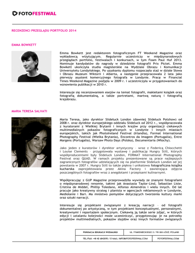 RECENZENCI PRZEGLĄDU PORTFOLIO 2014 EMMA BOWKETT Emma Bowkett jest redaktorem fotograficznym FT Weekend Magazine oraz wykładowcą wizytującym. Regularnie uczestniczy w międzynarodowych przeglądach portfolio, festiwalach i konkursach, w tym Foam Paul Huf 2013. Nominuje kandydatów do nagrody w dziedzinie fotografii Prix Pictet. Emma Bowkett ukończyła studia magisterskie na Wydziale Obrazu i Komunikacji Uniwersytetu Londyńskiego. Po uzyskaniu dyplomu rozpoczęła staż w dziale Słowa i Obrazu Muzeum Wiktorii i Alberta, a następnie przepracowała 2 lata jako pierwszy asystent komercyjnego fotografa w Londynie. Pracę w Financial Times Weekend Magazine podjęła w 2009 r. i uczestniczyła w przygotowaniach do wznowienia publikacji w 2010 r. Interesuje się recenzowaniem esejów na temat fotografii, makietami książek oraz fotografią dokumentalną, a także portretami, martwą naturą i fotografią krajobrazu. MARIA TERESA SALVATI Maria Teresa, jako dyrektor Slideluck London (dawniej Slideluck Potshow) od 2008 r. oraz dyrektor europejskiego oddziału Slideluck od 2012 r., współpracowała z kuratorami z Wielkiej Brytanii i innych krajów przy organizacji ciekawych multimedialnych pokazów fotograficznych w Londynie i innych miastach europejskich, takich jak PhotoIreland Festival (Irlandia), Format International Photography Festival (Wielka Brytania), Encontros da Imagem (Portugalia), Entre Margens (Portugalia), Warsaw Photo Days (Polska), Documentaria (Włochy). Jako jeden z kuratorów i dyrektor artystyczny – wraz z Federicą Chiocchetti i Louise Clements – przygotowała wystawę i publikację Hungry Still, których współproducentami były Slideluck London, FORMAT International Photography Festival oraz QUAD. W ramach projektu prezentowane są prace najlepszych zagranicznych fotografów udzielających się na platformie Slideluck London od jej powstania w 2007 r. Hungry Still to także piękna i unikatowa fotograficzna książka kucharska zaprojektowana przez Akina Factory i zawierająca zdjęcia poszczególnych fotografów wraz z anegdotami i przepisami kulinarnymi. Współpracując z GUP Magazine przeprowadziła wywiady ze znanymi fotografami o międzynarodowej renomie, takimi jak Anastasia Taylor-Lind, Sebastian Liste, Cristina de Middel, Phillip Toledano, Alfonso Almendros i wielu innych. Od lat pracuje jako kreatywny strateg i planista w agencjach reklamowych w Londynie, Mediolanie i Bari. Ma mnóstwo pomysłów dotyczących tworzenia kultury marki oraz sztuki narracji. Interesuje się projektami związanymi z kreacją narracji – od fotografii dokumentalnej po artystyczną, w tym projektami konceptualnymi, personalnymi, kreatywnymi i reportażem społecznym. Ciekawią ją także serie zdjęć, w których edycji i ustalaniu kolejności może uczestniczyć, przygotowując je na potrzeby projektów multimedialnych, pokazów slajdów oraz innych formatów związanych z narracją, takich jak projekty, które mogą ukazać się w czasopismach, dla których pisze artykuły, które może zabrać na inne wystawy Slideluck na świecie, lub nadające się do wykorzystania w książce. ZUZANA LAPITKOWA Zuzana Lapitková pracuje jako niezależna kurator wystaw fotograficznych. Mieszka w Bratysławie. Jest magistrem archeologii i historii sztuki. Przez pięć lat pracowała w Środkowoeuropejskim Domu Fotografii jako kurator i kierownik projektów. W tym okresie należała do zespołu kuratorów Europejskiego Miesiąca Fotografii, zarządzała międzynarodowym projektem „Historia Europejskiej Fotografii” oraz pracowała w zespole Miesiąca Fotografii w Bratysławie. Jako niezależna kurator, organizuje wystawy (Bilancia 1950-2012, wystawa zbiorowa Stowarzyszenia Słowackich Profesjonalnych Fotografów, Bratysława 2012, Koszyce 2013), pobyty artystów (Shandora Hassana w Bańskiej Szczawnicy w 2012 r.) oraz wydaje albumy z pracami fotografów (Máté Bartha, Common Nature, 2014 r.) Zuzana Lapitková jest szczególnie zainteresowana kreatywnym podejściem w fotografii i multimediach, sztuką przekraczającą tradycyjne granice kategorii w fotografii oraz sztuką wizualną i uprawianą w obszarach styku różnych mediów. ANNA-KAISA RASTENBERGER Anna-Kaisa Rastenberger jest Naczelnym Kuratorem Fińskiego Muzeum Fotografii – czołowego muzeum fotografii w Finlandii. Oprócz opieki nad głównymi wystawami – prezentującymi głównie współczesną sztukę fotograficzną – Rastenberger odpowiada także za program galerii dla młodych fotografików. W swojej karierze Rastenberger była kuratorem międzynarodowych wystaw fotografii współczesnej (np. 4. Biennale w Moskwie, projekty specjalne), a jej artykuły ukazywały się w kilku międzynarodowych publikacjach. Rastenberger jest członkiem zarządu największego międzynarodowego centrum rezydencyjnego w Finlandii (HIAP – Helsinki International Artist Programme). Rastenberger jest ekspertem w dziedzinie współczesnej skandynawskiej sztuki fotograficznej, a w bieżącym roku planuje złożenie pracy doktorskiej. Jest popularnym wykładowcą zapraszanym przez wyższe uczelnie i instytucje sztuki w Europie. Wcześniej Rastenberger przez pięć lat pracowała naukowo w Fińskiej Akademii, była kuratorem edukacyjnym w Muzeum Sztuki w Helsinkach, a także redaktor naczelną fińskiego czasopisma o kulturze wizualnej KUVA. Publikowała artykuły o fińskiej i skandynawskiej współczesnej fotografii. Chciałabym spotkać fotografów mających silną wizję podejścia konceptualnego lub estetycznego. Jestem zainteresowana obejrzeniem zarówno gotowych serii, jak i prac będących dopiero w przygotowaniu. Będę pracować nad wystawami tematycznymi, odwołującymi się do niektórych znanych koncepcji, takich jak „ciemnia”, „fotografia z ukrycia” i „feminizm”, a także aktualizującymi te koncepcje. Uwielbiam oglądać projekty, słuchać uwag oraz wymieniać się przemyśleniami z fotografami zajmującymi się tym