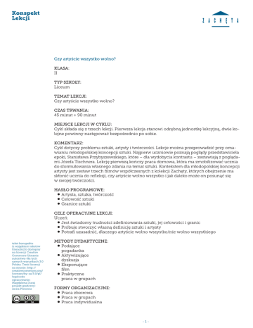 Konspekt Lekcji Czy artyście wszystko wolno? KLASA: II TYP SZKOŁY: Liceum TEMAT LEKCJI: Czy artyście wszystko wolno? CZAS TRWANIA: 45 minut + 90 minut MIEJSCE LEKCJI W CYKLU: Cykl składa się z trzech lekcji. Pierwsza lekcja stanowi odrębną jednostkę lekcyjną, dwie kolejne powinny następować bezpośrednio po sobie. KOMENTARZ: Cykl dotyczy problemu sztuki, artysty i twórczości. Lekcje można przeprowadzić przy omawianiu młodopolskiej koncepcji sztuki. Najpierw uczniowie poznają poglądy przedstawiciela epoki, Stanisława Przybyszewskiego, które – dla wydobycia kontrastu – zestawiają z poglądami Józefa Tischnera. Lekcję pierwszą kończy praca domowa, która ma zmobilizować ucznia do sformułowania własnego zdania na temat sztuki. Kontekstem dla młodopolskiej koncepcji artysty jest zestaw trzech filmów współczesnych z kolekcji Zachęty, których obejrzenie ma skłonić ucznia do refleksji, czy artyście wolno wszystko i jak daleko może on posunąć się w swojej twórczości. HASŁO PROGRAMOWE: ∞Artysta, sztuka, twórczość ∞Celowość sztuki ∞Granice sztuki CELE OPERACYJNE LEKCJI: Uczeń: ∞Jest świadomy trudności zdefiniowania sztuki, jej celowości i granic ∞Próbuje stworzyć własną definicję sztuki i artysty ∞Potrafi uzasadnić, dlaczego artyście wolno wszystko/nie wolno wszystkiego tekst konspektu (z wyjątkiem tekstów literackich) dostepny na licencji Creative Commons Uznanie autorstwa-Na tych samych warunkach 3.0 Polska. Treść licencji na stronie: http:// creativecommons.org/ licenses/by-sa/3.0/pl/ legalcode opracowanie: Magdalena Duraj projekt graficzny: Anna Piwowar METODY DYDAKTYCZNE: ∞Podające pogadanka ∞Aktywizujące dyskusja ∞Eksponujące film ∞Praktyczne praca w grupach FORMY ORGANIZACYJNE: ∞Praca zbiorowa ∞Praca w grupach ∞Praca indywidualna -1- Konspekt Lekcji ŚRODKI DYDAKTYCZNE: ∞Słowne tekst drukowany ∞Słuchowo-wzrokowe telewizor i odtwarzacz dvd / laptop i projektor multimedialny PRZEBIEG LEKCJI I: 1. Sprawdzenie listy – 3 minuty 2. Podanie tematu lekcji – 1 minuta 3. Rozmowa wprowadzająca w temat – 5 minut - Co to jest sztuka? - Czy sztuka ma czemuś służyć? - Kogo można nazwać artystą? - Czy sztuka ma jakieś granice? Czy artyście wszystko wolno? 4. Wprowadzenie i opracowanie nowego materiału – 30 minut ∞Nauczyciel daje wybranym uczniom akapity manifestu Przybyszewskiego Confiteor, a następnie tekstu Tischnera Sztuka. Uczniowie kolejno czytają i próbują zinterpretować fragmenty, nauczyciel może zadawać pytanie pomocnicze ∞Uczniowie w trakcie uzupełniają tabelkę Stanisław Przybyszewski Józef Tischner Ja Co to jest sztuka? Czy sztuka ma cel? Czym zajmuje się artysta? Jak sztuka ma się do etyki, moralności, społeczeństwa? Od czego wywodzi się (czego odbiciem jest) sztuka? Czy sztuka może czemuś służyć? Czy są jakieś granice, których artysta nie może przekraczać? 5. Usystematyzowanie nowego materiału – 5 minut ∞Uczniowie formułują główne różnice w poglądach Przybyszewskiego i Tischnera 6. Zadanie pracy domowej – 1 minuta ∞Uzupełnij ostatnią kolumnę tabeli, wpisując w nią swoje własne poglądy na temat sztuki. -2- Konspekt Lekcji PRZEBIEG LEKCJI II i III: 1. Sprawdzenie listy – 3 minuty 2. Podanie tematu lekcji – 1 minuta 3. Odniesienie do pracy domowej – 5 minut ∞Chętni uczniowie (lub wyznaczeni przez nauczyciela) czytają pracę domową – uzupeł nioną ostatnią kolumnę tabeli z ich własnymi poglądami na temat sztuki 4. Wprowadzenie i opracowanie nowego materiału – 60 minut ∞K. Radziszewski, Chwalcie łąki umajone ∞ Podanie podstawowych informacji dotyczących artysty i jego filmu (2 minuty) ∞ Obejrzenie filmu (3 minuty) ∞ Omówienie filmu (5 minut) - Co przedstawia film? - Kim są bohaterowie filmu? - Jakie postawy zestawia ze sobą Radziszewski? Jaka jest rola w filmie babci, a jaka wnuka? - Czy artysta może wykorzystywać modlitwę do działań artystycznych? - Jaką granicę przekracza Radziszewski? - Jak można by określić film Radziszewskiego? Czy to ironia, karykatura, groteska? Czym jest film? ∞A. Żmijewski, Lekcja śpiewu 2 ∞ Podanie podstawowych informacji dotyczących artysty i jego filmu (2 minuty) ∞ Obejrzenie filmu (17 minut) ∞ Omówienie filmu (8 minut) - Jak można by scharakteryzować przedstawioną młodzież? (wygląd, zachowanie, postawa) - Co robi młodzież? Jak wyglądają próby śpiewu? - Gdzie odbywa się koncert? Czy ma to jakieś znaczenie? - Jak można by określić muzykę Jana Sebastiana Bacha, a jak muzykę głuchoniemej mło dzieży? - Z jakim kontrastem mamy do czynienia w filmie? - Jakie uczucia mogą towarzyszyć występującej młodzieży? Jakie dyrygentowi? Jakie oglądającym film? - Co Żmijewski chciał przekazać swoim filmem? ∞J. Malinowski, HalfAWoman ∞ Podanie podstawowych informacji dotyczących artysty i jego filmu (2 minuty) ∞ Obejrzenie filmu (13 minut) ∞ Omówienie filmu (8 minut) - Kto jest bohaterem filmu? - Jak można by scharakteryzować kobietę? (wiek, wygląd, zachowanie, usposobienie) - Jaką historię opowiada film? - Na czym polega choroba kobiety? - Jak może wyglądać przyszłość kobiety? - Jakie są plany kobiety? - Dlaczego kobieta chce, aby ją filmowano? - Czy kobieta jest piękna? - Jakie uczucia mogą towarzyszyć oglądającym film? - Jaką granicę przekracza Malinowski? 5. Praca w grupach – 6 minut ∞Uczniowie zostają podzieleni na dwie duże grupy, mogą pracować samodzielnie lub w parach. Nauczyciel przydziela grupom dwa różne polecenia (5 minut) ∞ Polecenie dla I grupy: Malinowski dokonał rzeczy oburzającej: zmanipulował odbiorcę swego filmu, pokazując mu fikcyjną historię fikcyjnej choroby. Zagrał na jego odczuciach, przekroczył zarówno granicę prawdy, jak i wrażliwości ludzkiej. Wypiszcie w punktach, dlaczego artyści nie powinni przekraczać pewnych granic. ∞ Polecenie dla II grup